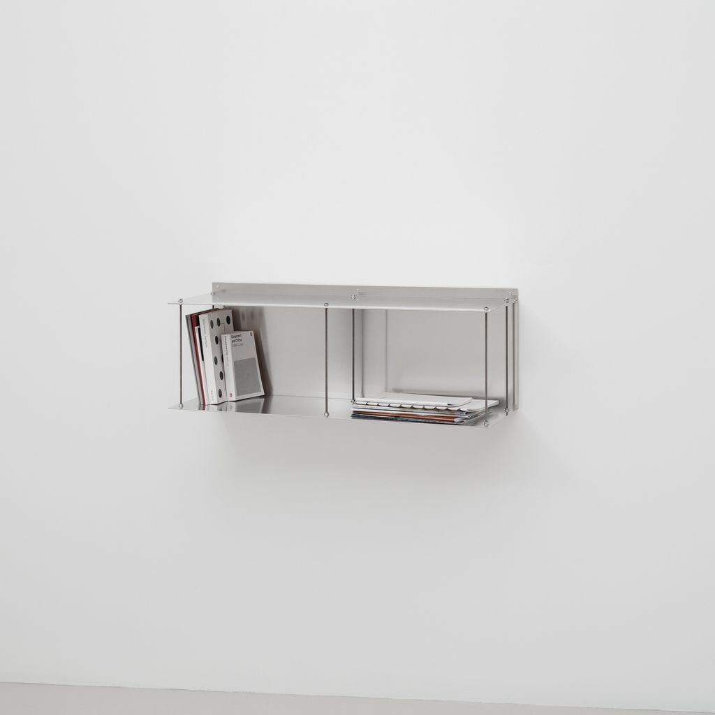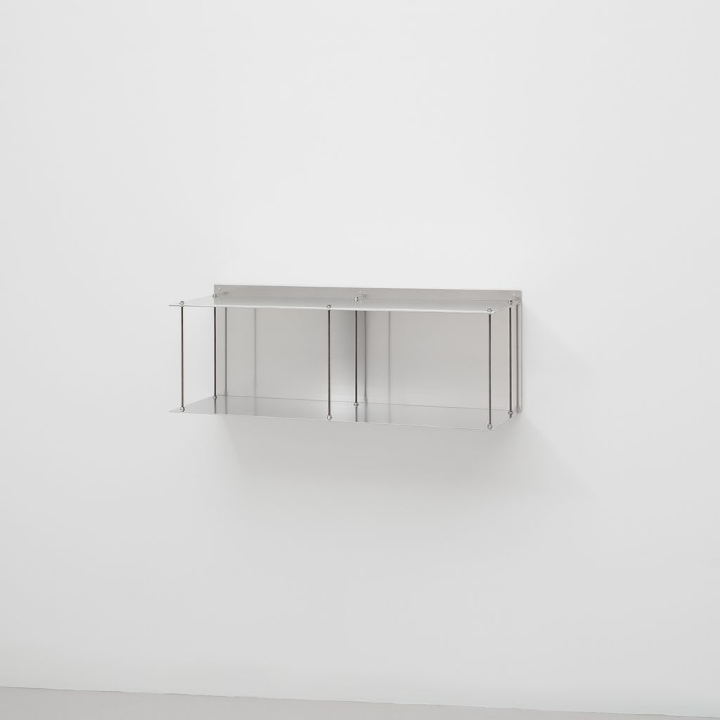 a relational presence through reflected light, negative space, and fluctuating mass. Its tripartite structure (nuts, bolts, and folded aluminum) expresses the formal logic of points, lines, and planes and emphasises the possibilities of infinite modular expansion.Produced in small-scale industrial ensembles using readily available materials, the Aluminium Shelf Series offers a practical and versatile solution for storage and display in any type of space, whether stacked or mounted side by side, as stand-alone units, or in modular ensembles.