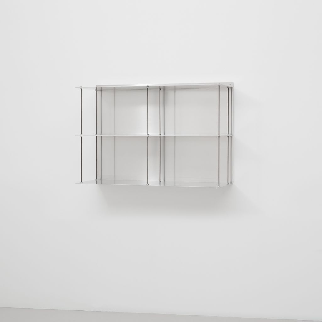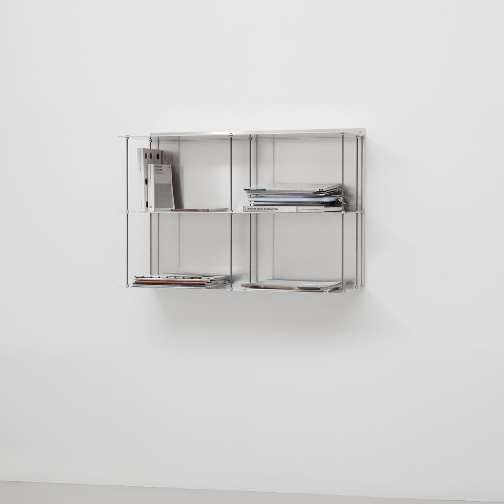 a relational presence through reflected light, negative space, and fluctuating mass. Its tripartite structure (nuts, bolts, and folded aluminum) expresses the formal logic of points, lines, and planes and emphasises the possibilities of infinite modular expansion.Produced in small-scale industrial ensembles using readily available materials, the Aluminium Shelf Series offers a practical and versatile solution for storage and display in any type of space, whether stacked or mounted side by side, as stand-alone units, or in modular ensembles.