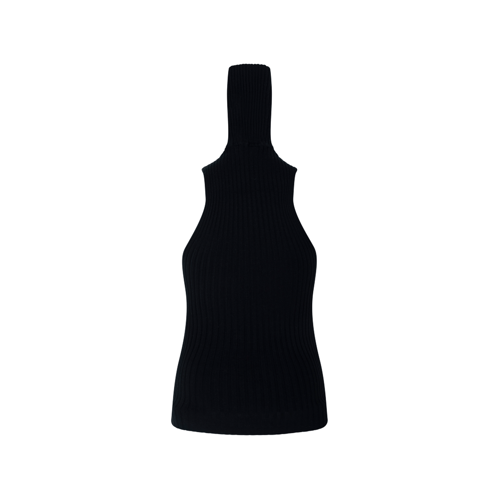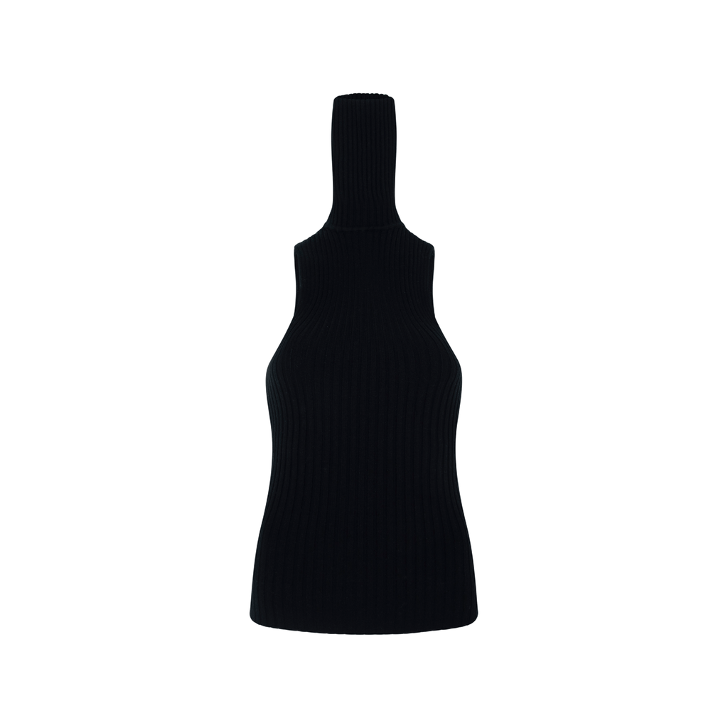 giu giu Black Turtleneck Knit Tank features form fitting design, fine gauge rib knit, stretchy material, and turtleneck.