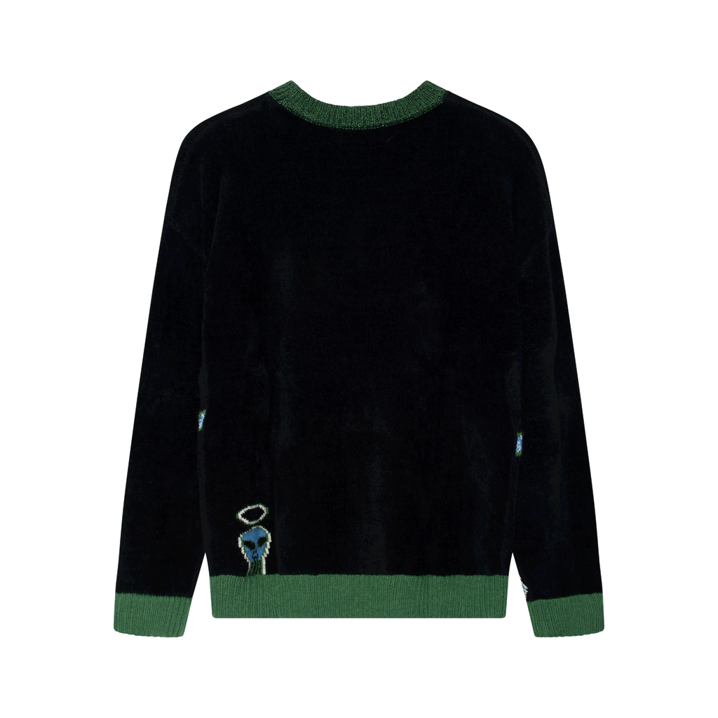 Giu Giu x Hi Stevie Light Being Sweater features intarsia pullover sweater with plaited trim, oversized fit, and crew neck.