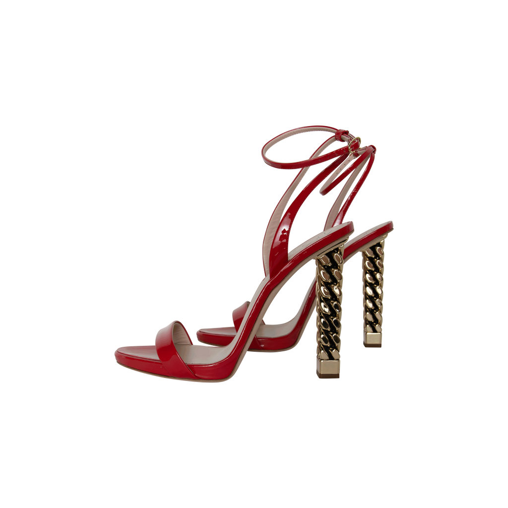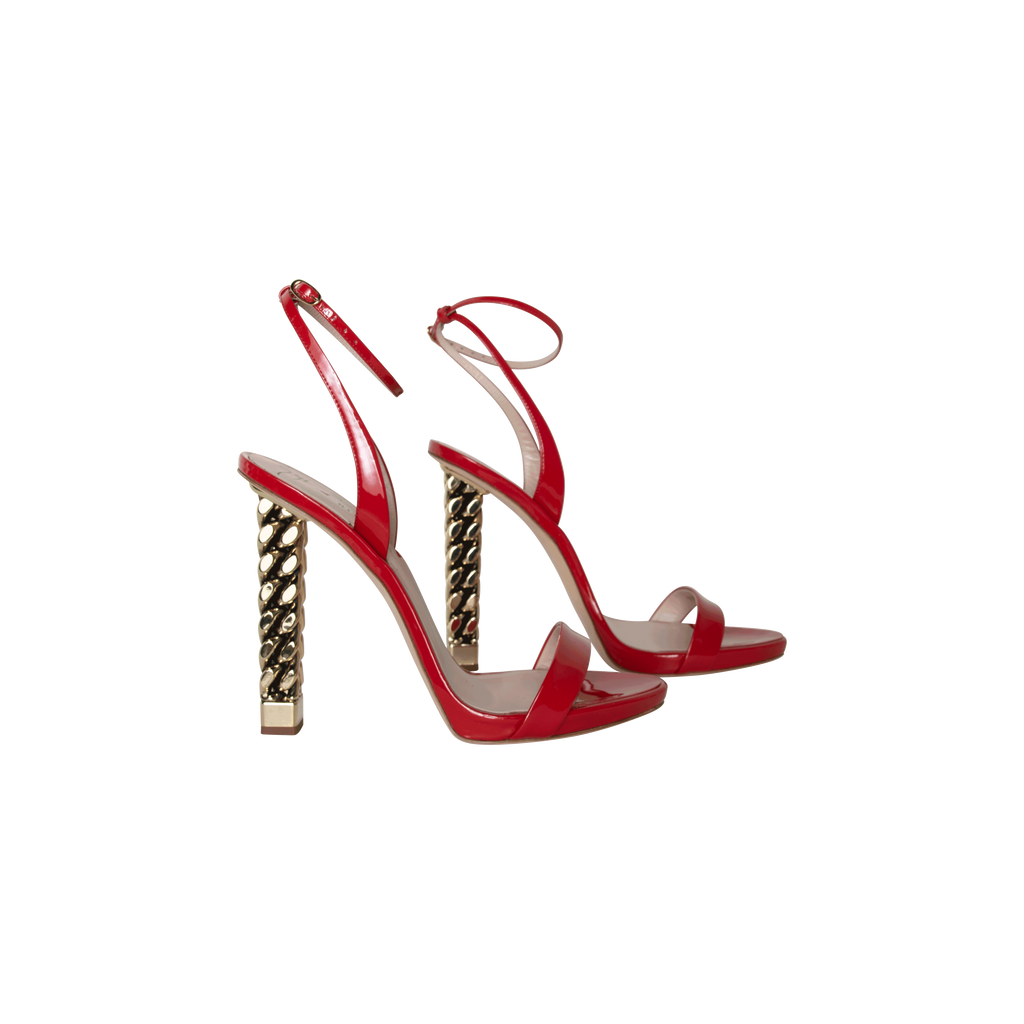 Giuseppe for Rita Ora Red Patent Leather Slingback Pumps features gold block heel, slingback, and single toe strap.