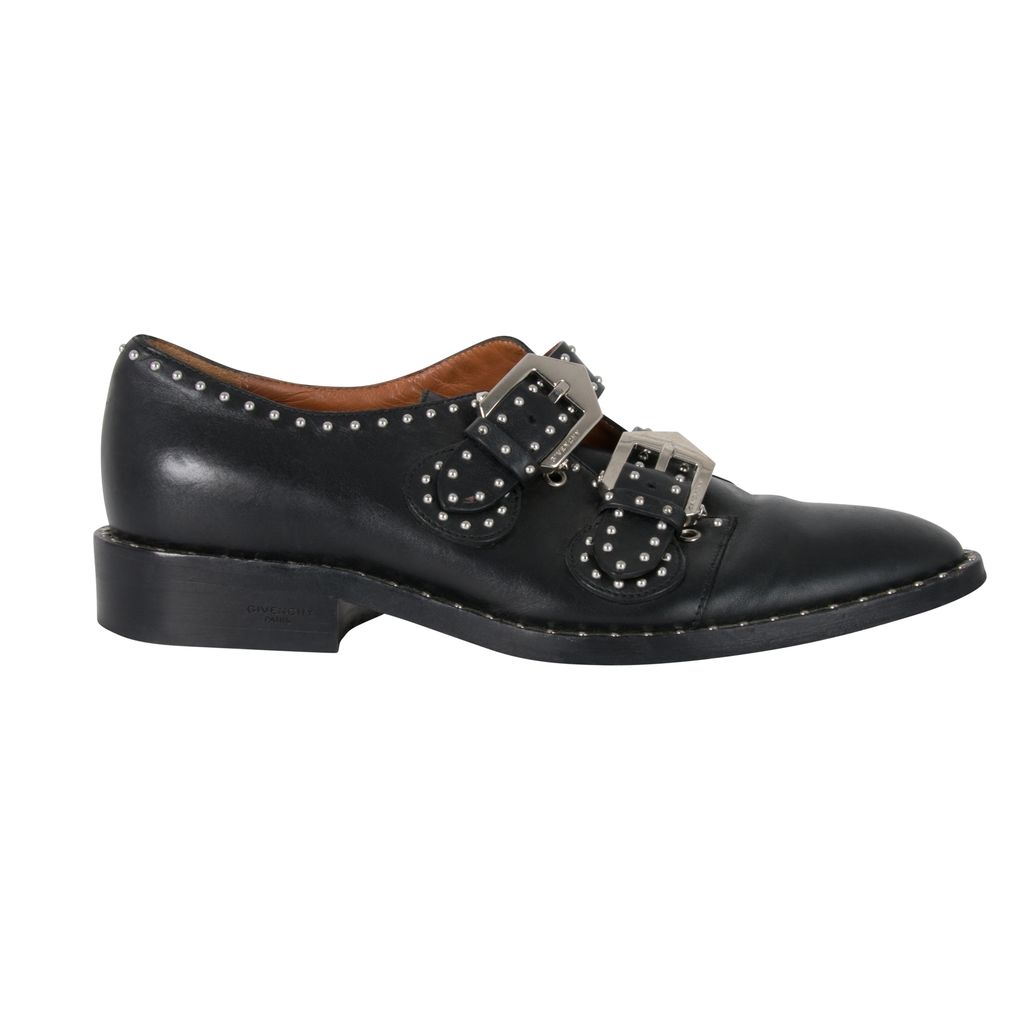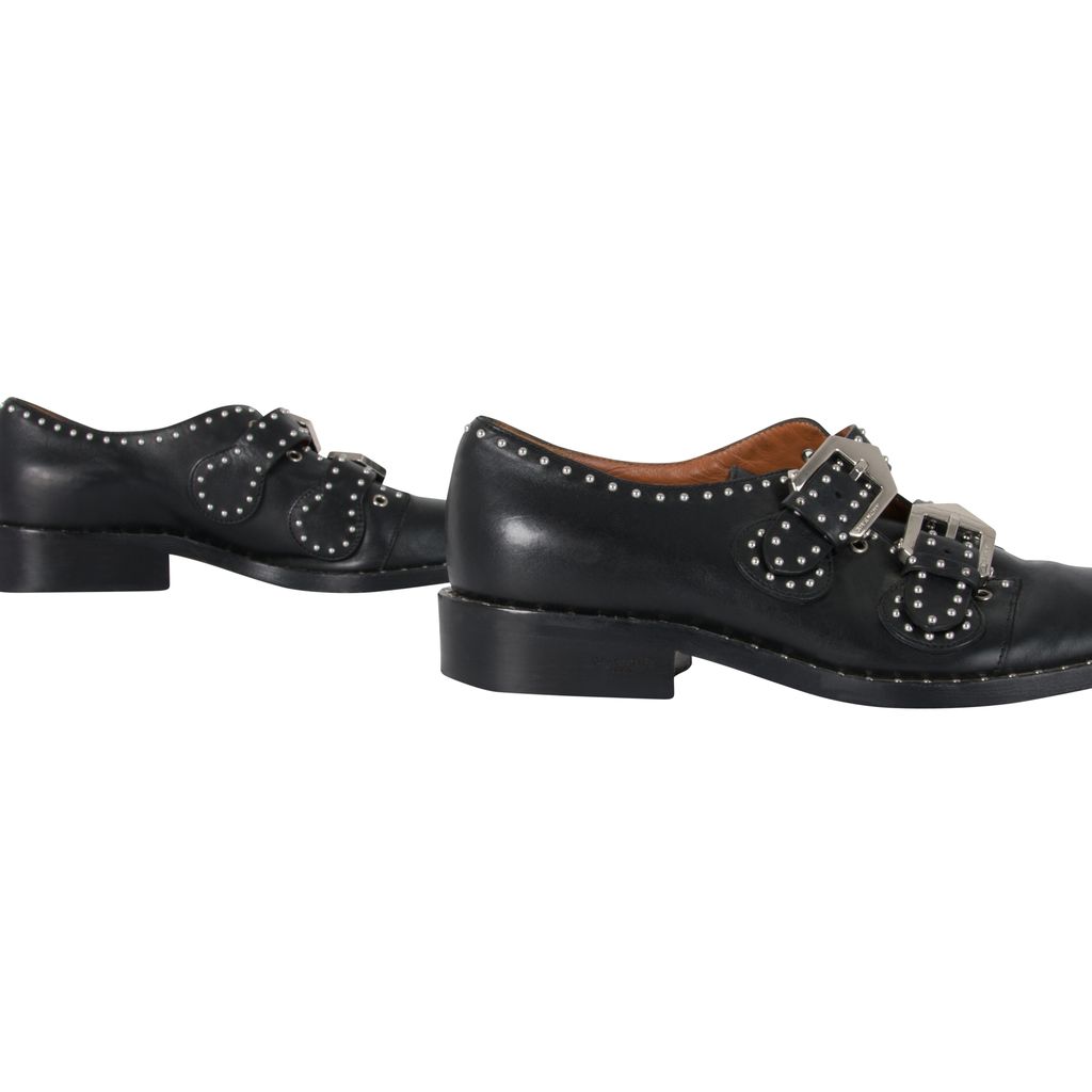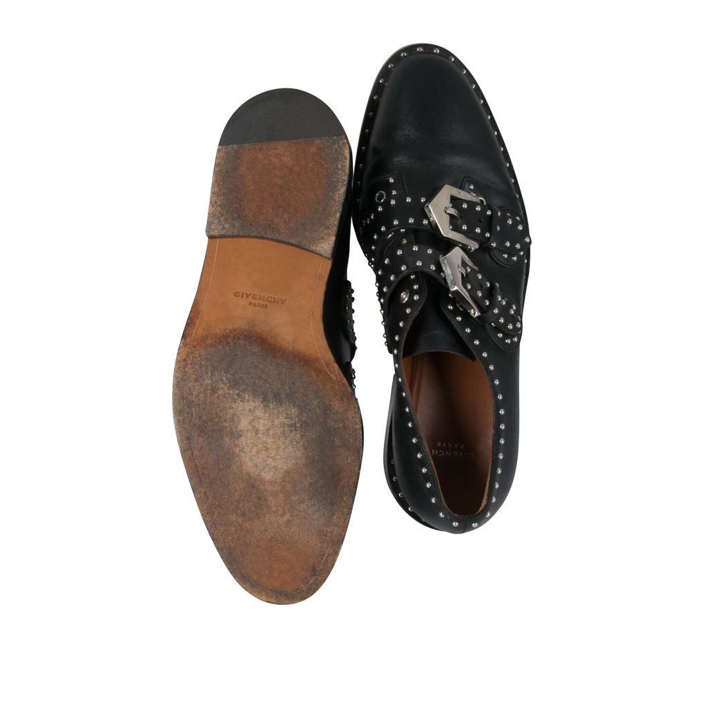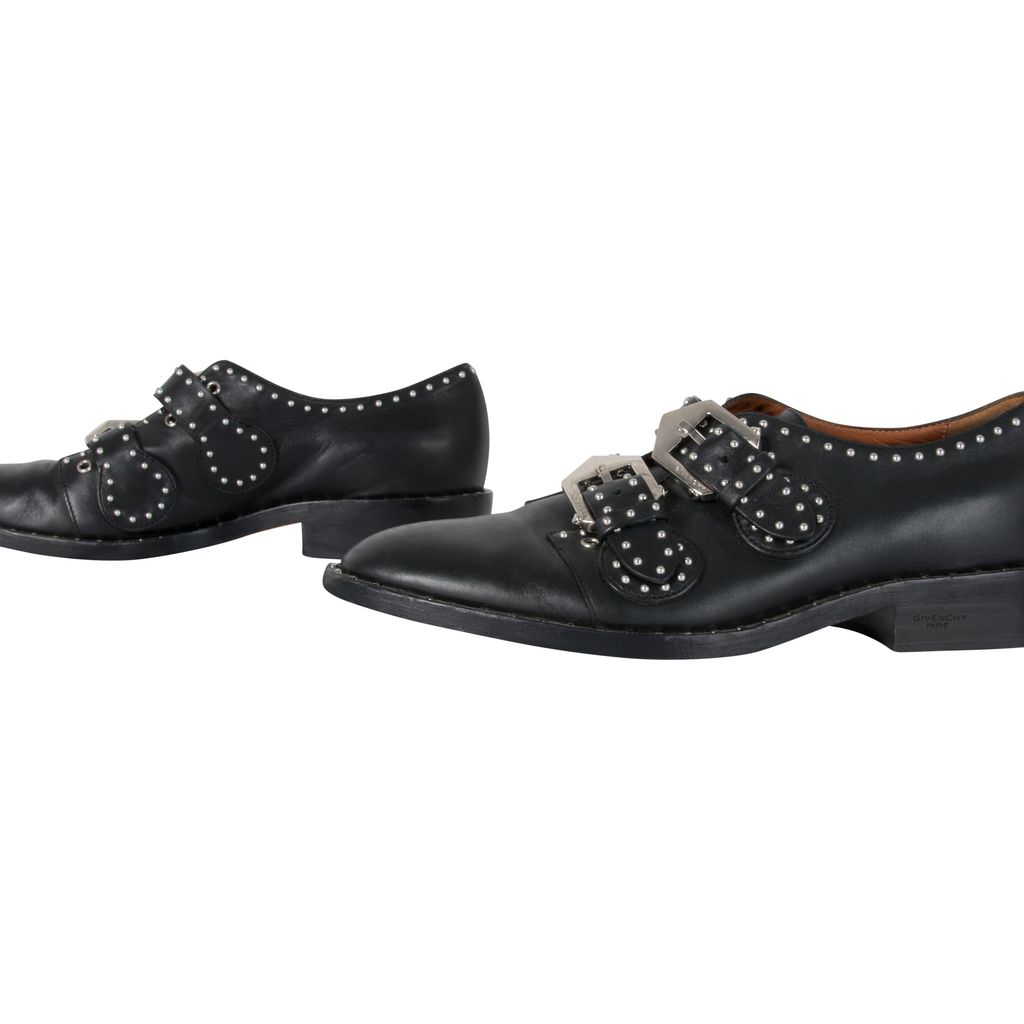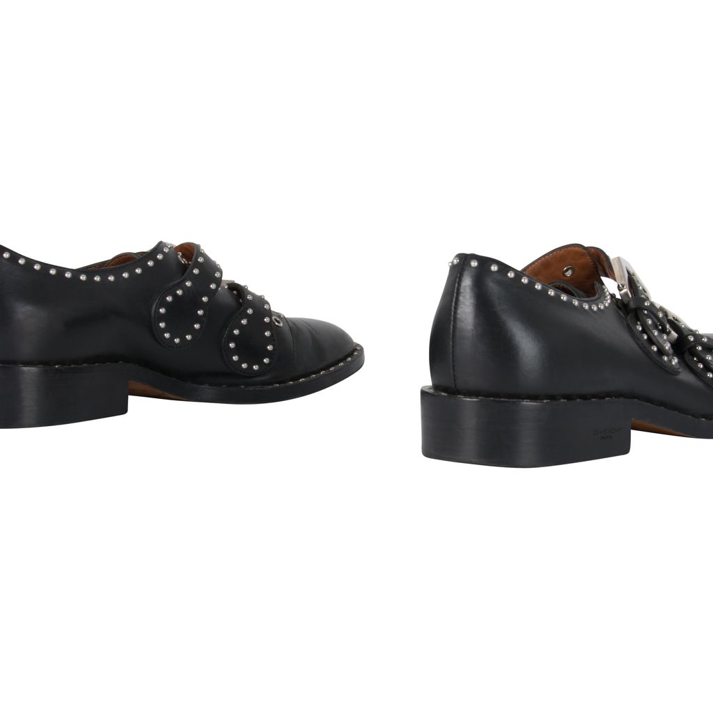 These studded Givenchy leather oxfords feature silver hardware details throughout, double-monk straps with statement buckles and a buckle closure, has a flat stacked heel, and has a round-toe silhouette. Gently worn, in excellent condition, lots of wear to sole as photographed.