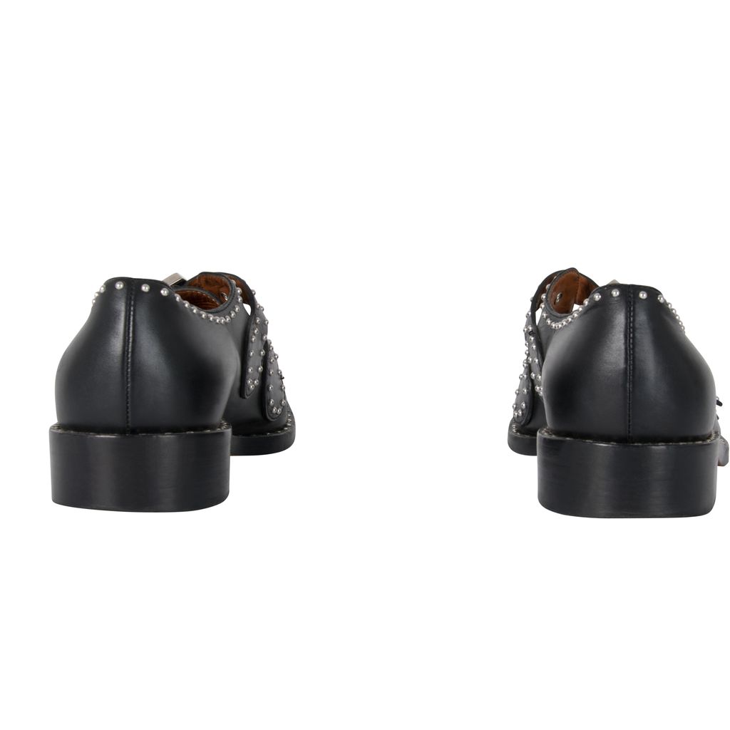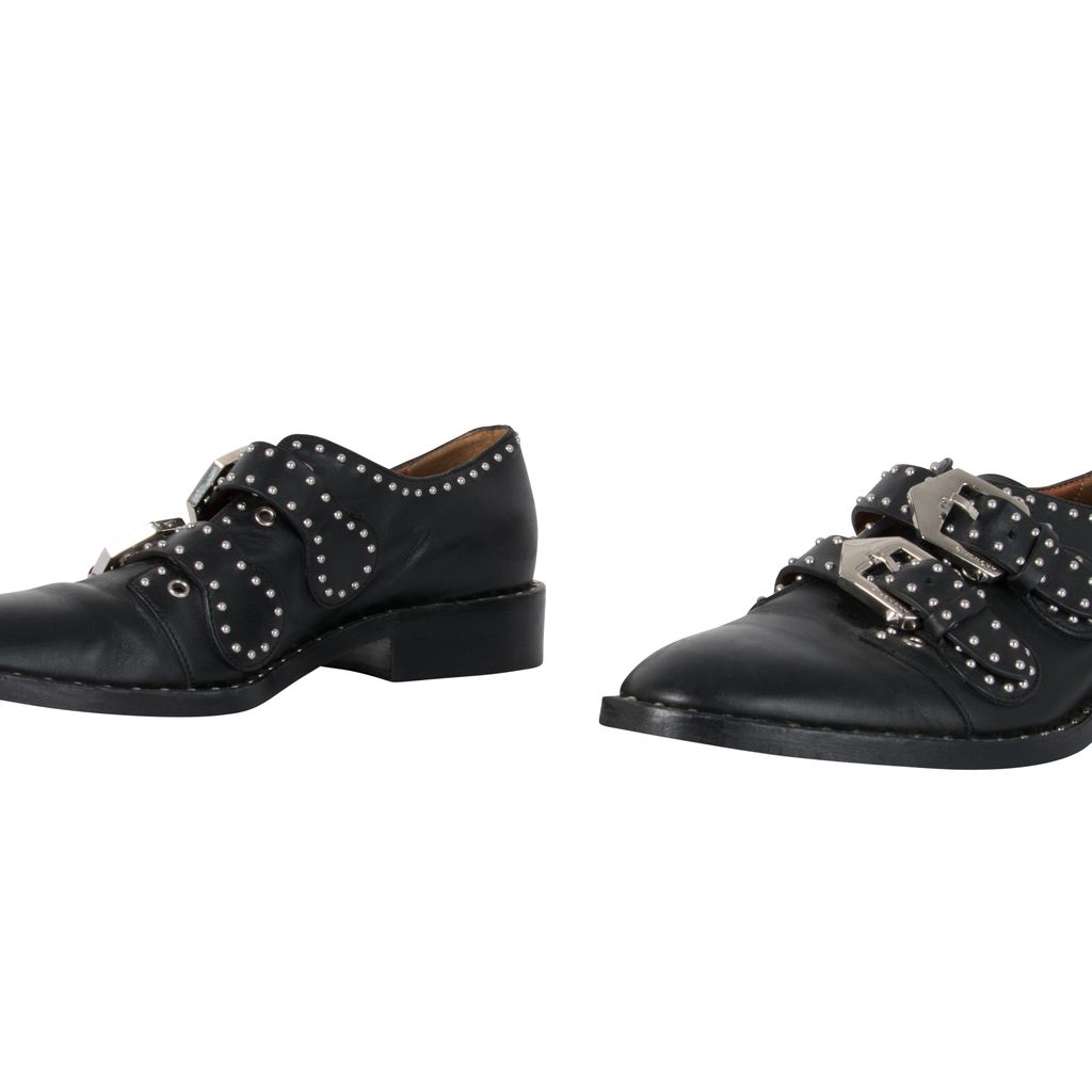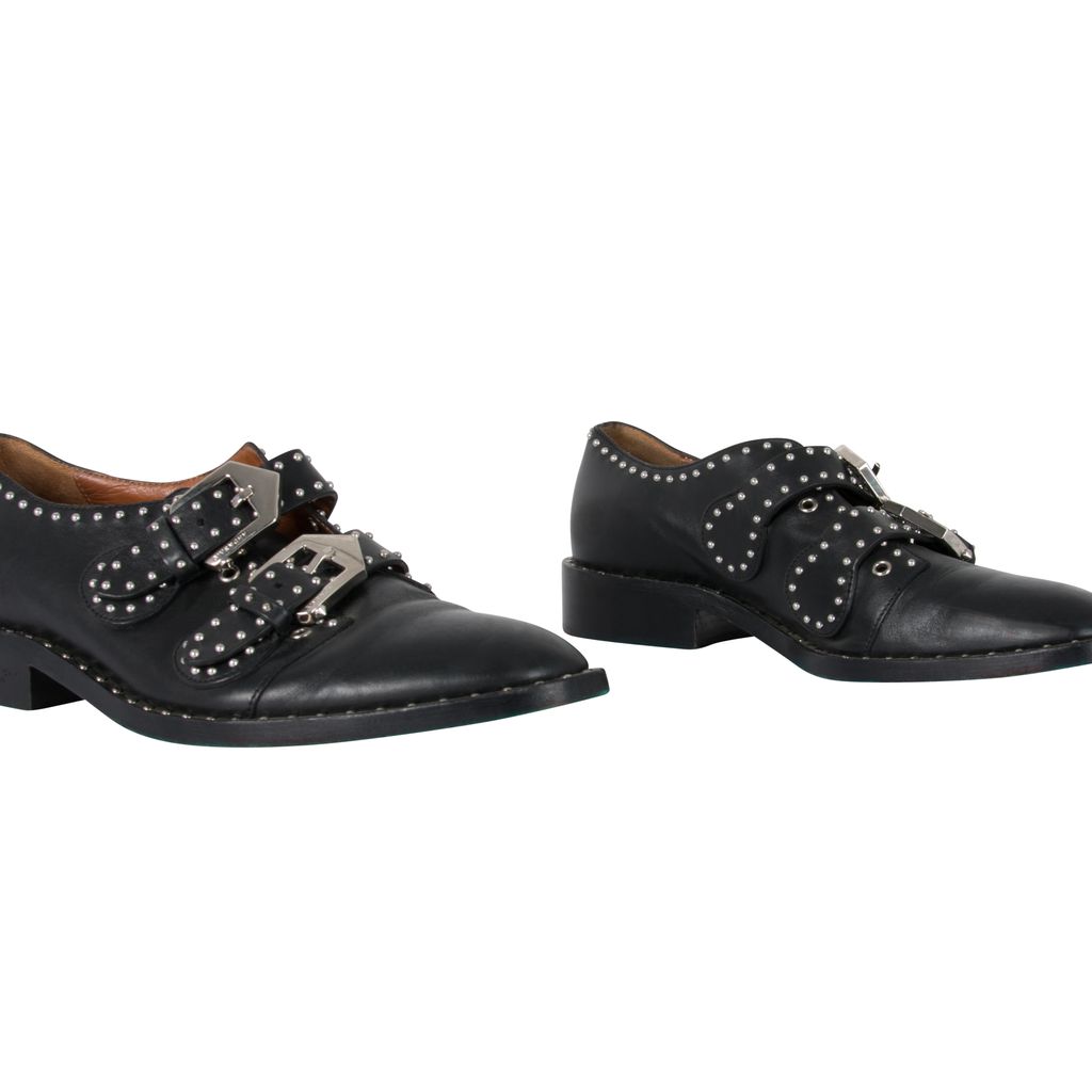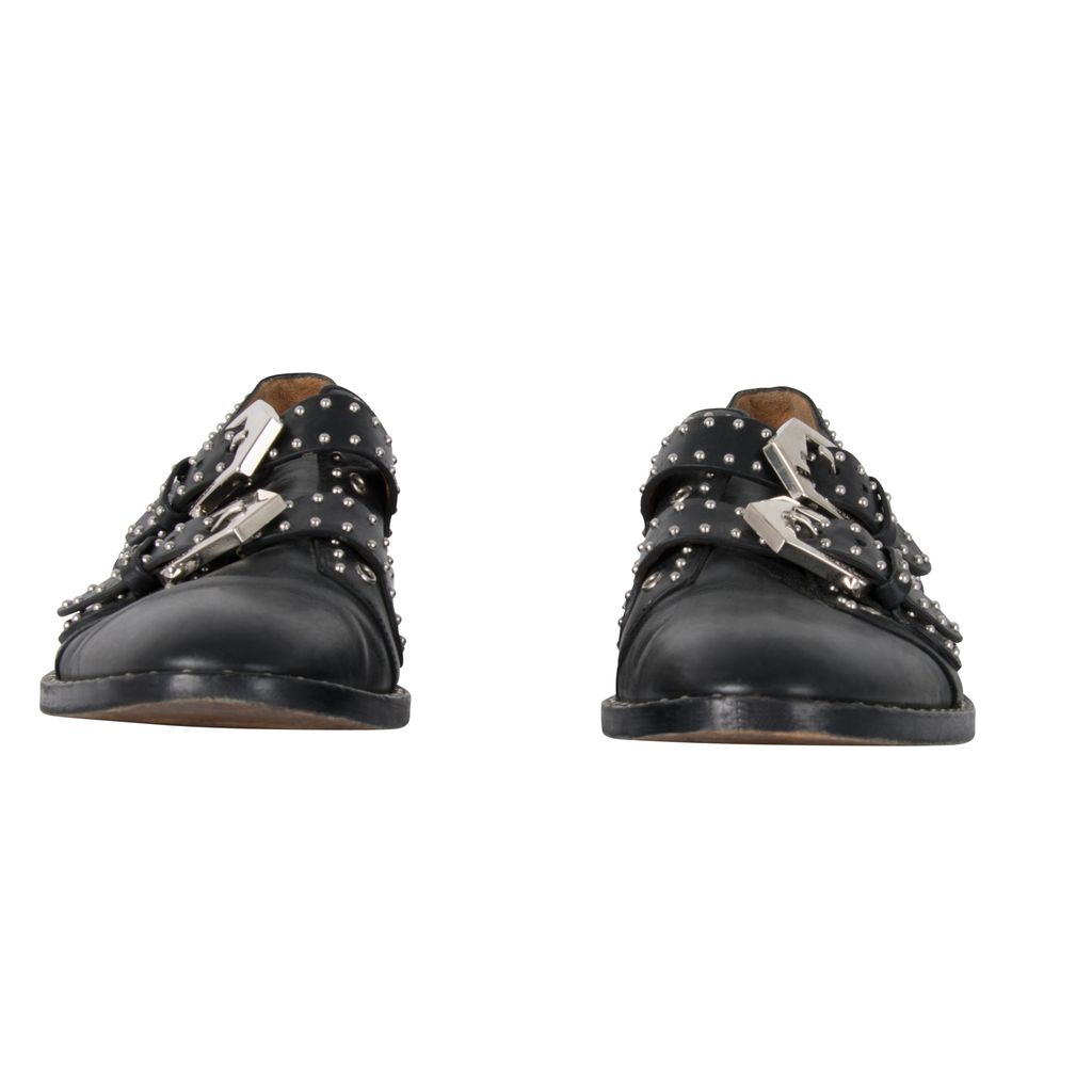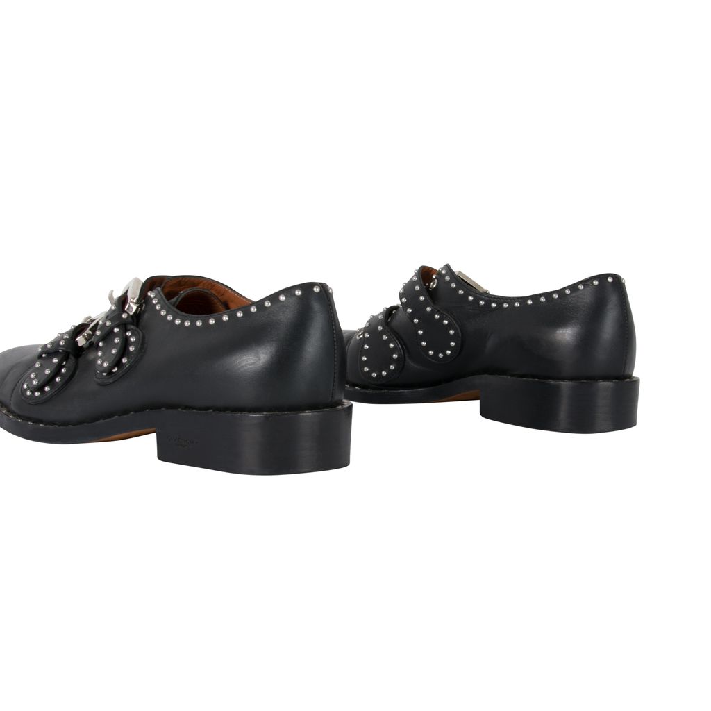 These studded Givenchy leather oxfords feature silver hardware details throughout, double-monk straps with statement buckles and a buckle closure, has a flat stacked heel, and has a round-toe silhouette. Gently worn, in excellent condition, lots of wear to sole as photographed.
