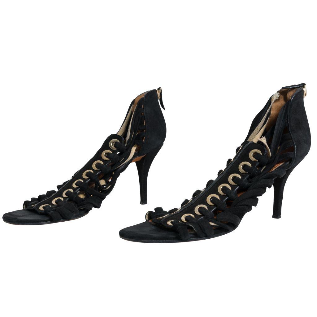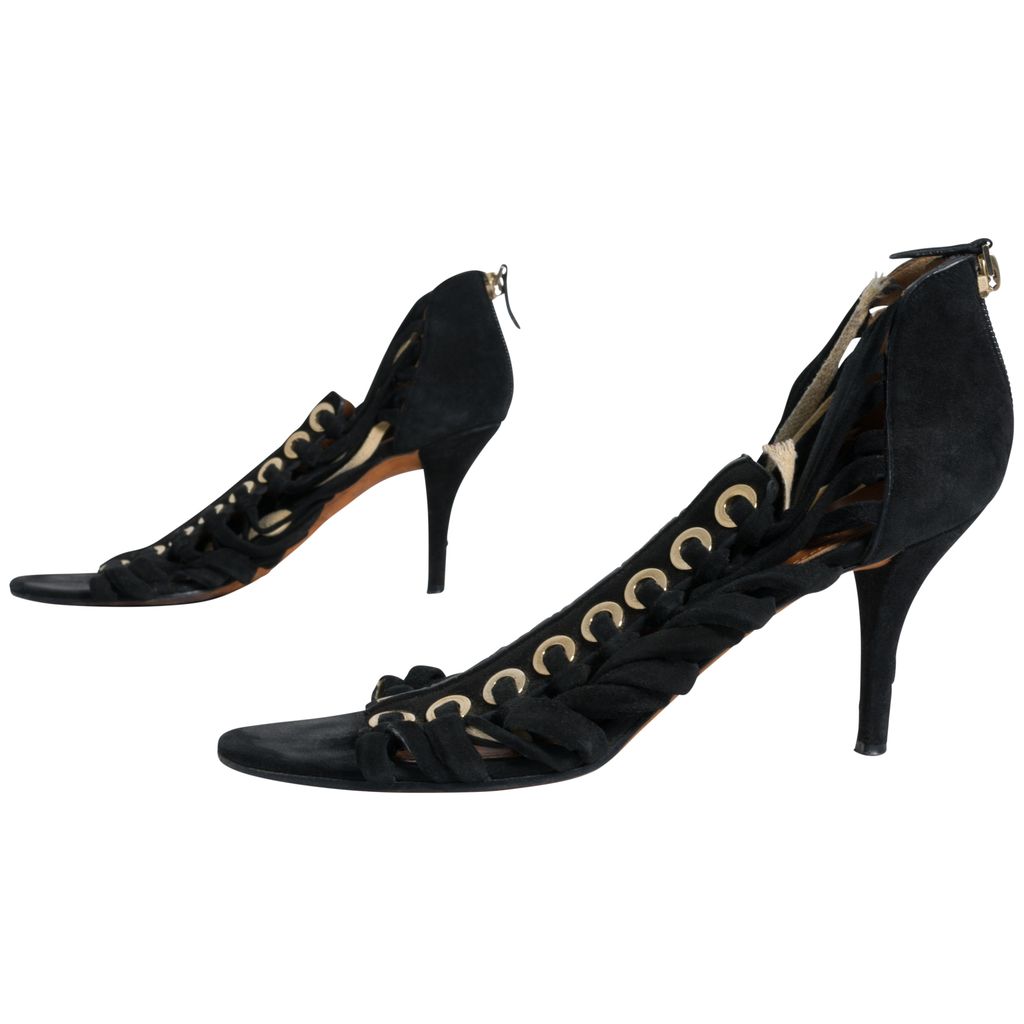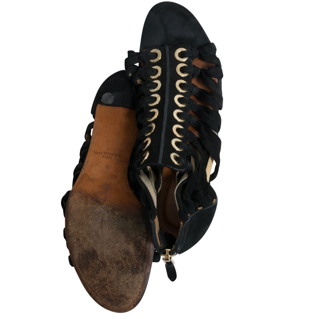 These cage style heels from Givenchy are crafted from black suede and adorned with gold-toned grommets, covered heels, and gold-toned zipper back fastening. In good condition. Minor scratch at right heel and minor scuffing on soles.