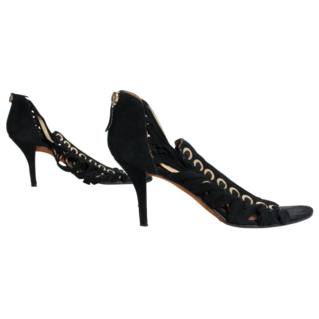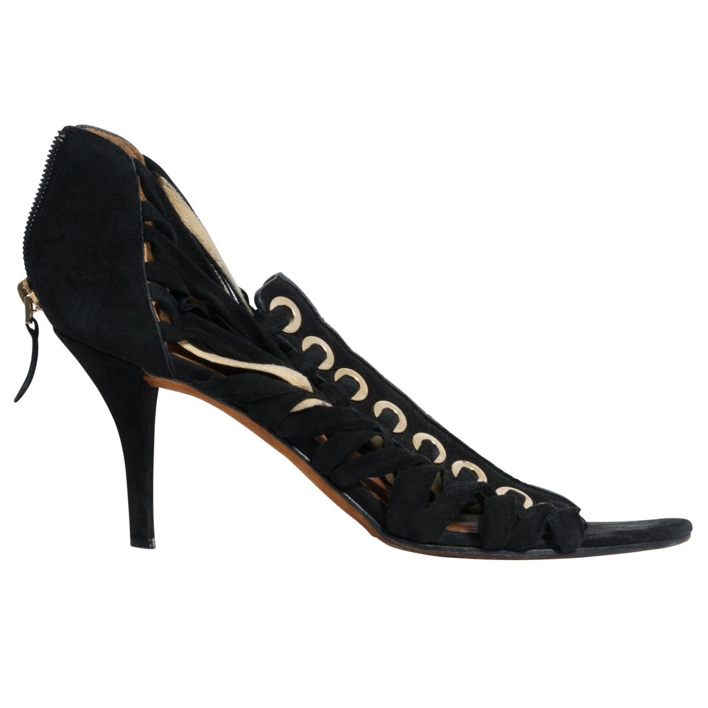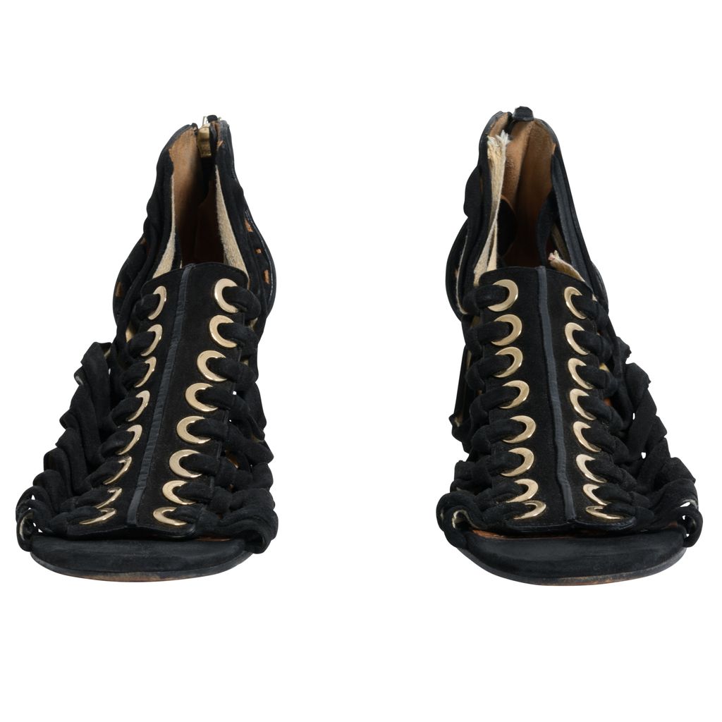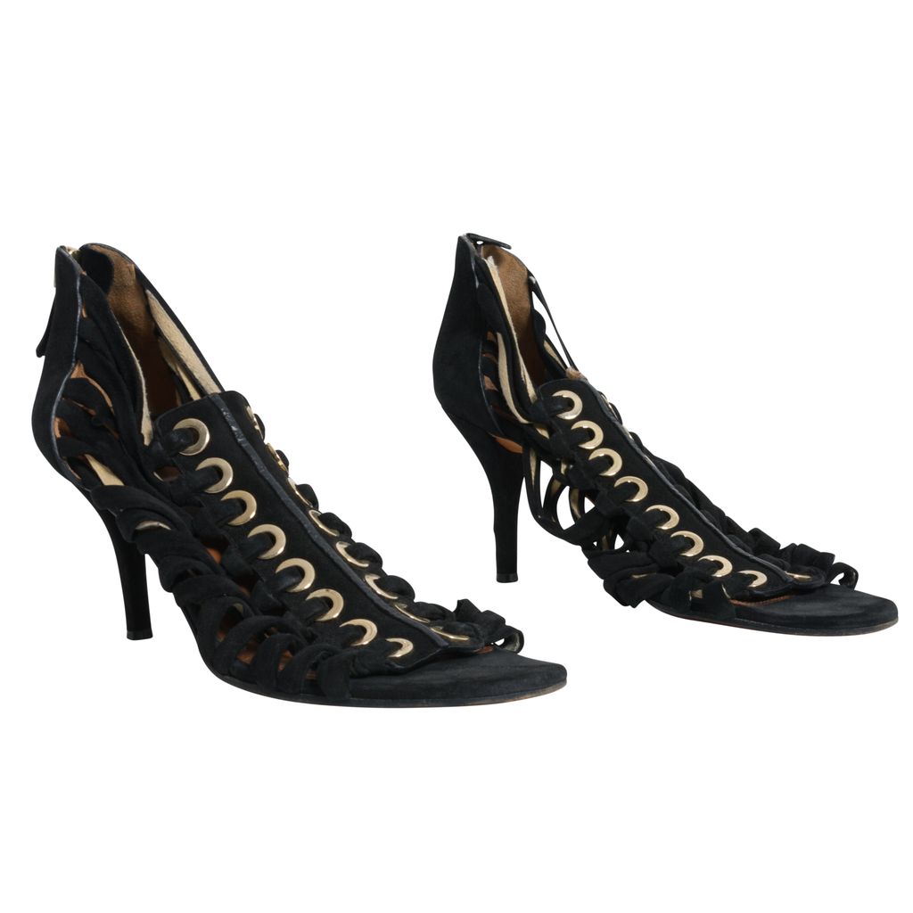 These cage style heels from Givenchy are crafted from black suede and adorned with gold-toned grommets, covered heels, and gold-toned zipper back fastening. In good condition. Minor scratch at right heel and minor scuffing on soles.