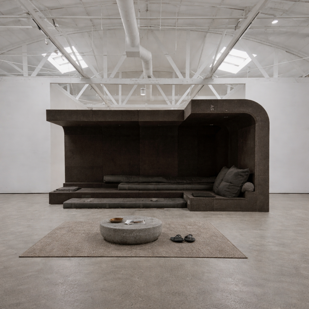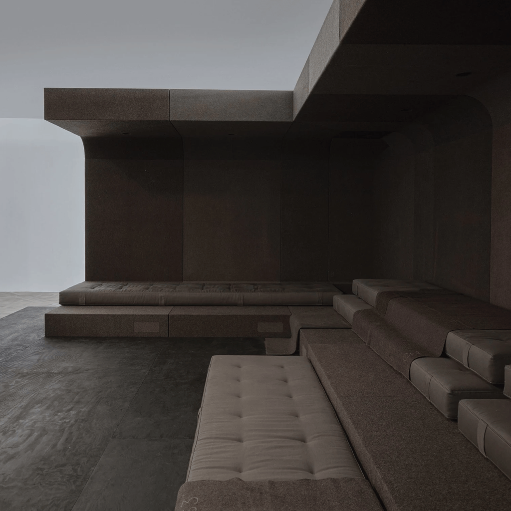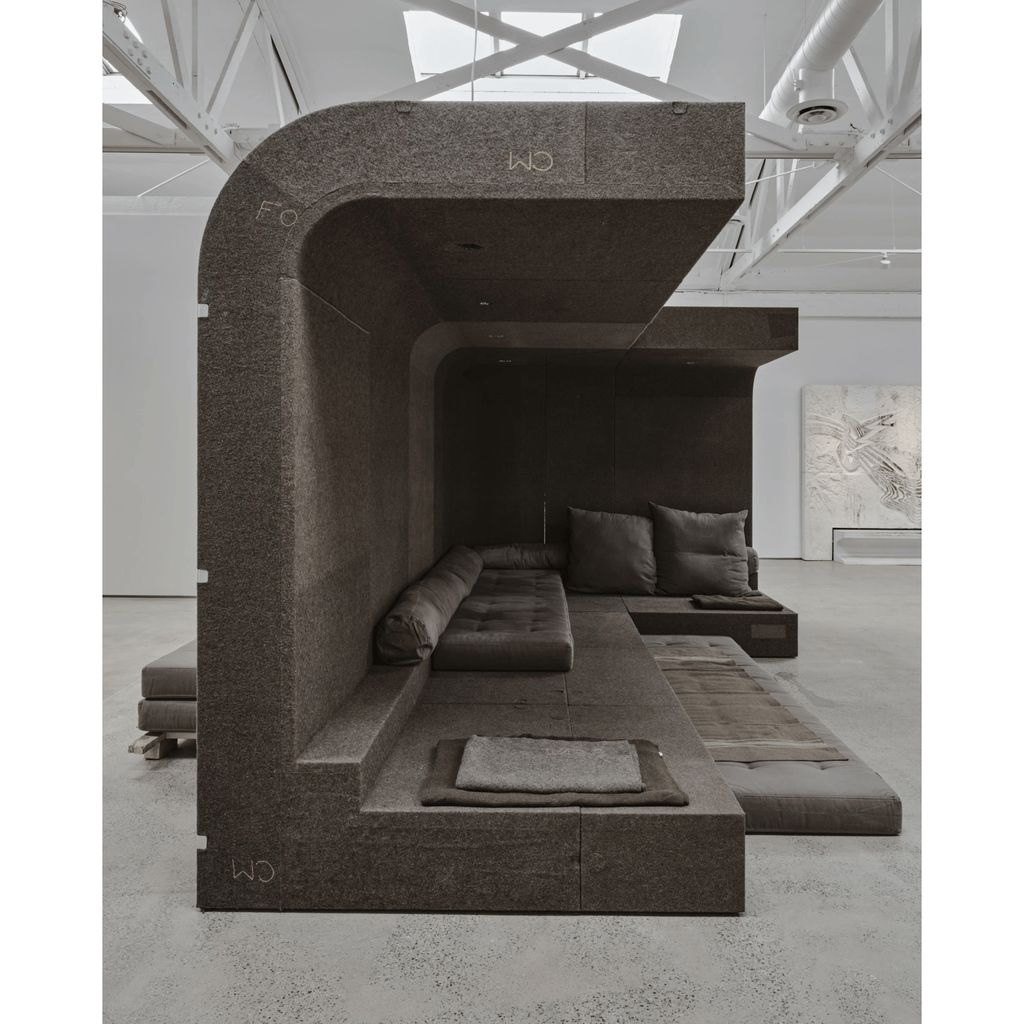 Installed as a large scale couch, ten individual Glade units plus two Glade corner units made of Batipan plywood will be covered in French wool army blankets, both being signature Owens materials and an echo of the original bed made for his home. Although presented as one piece, each Glade element can stand in its own right, complete with individual lighting, internet conduit and phone charger.