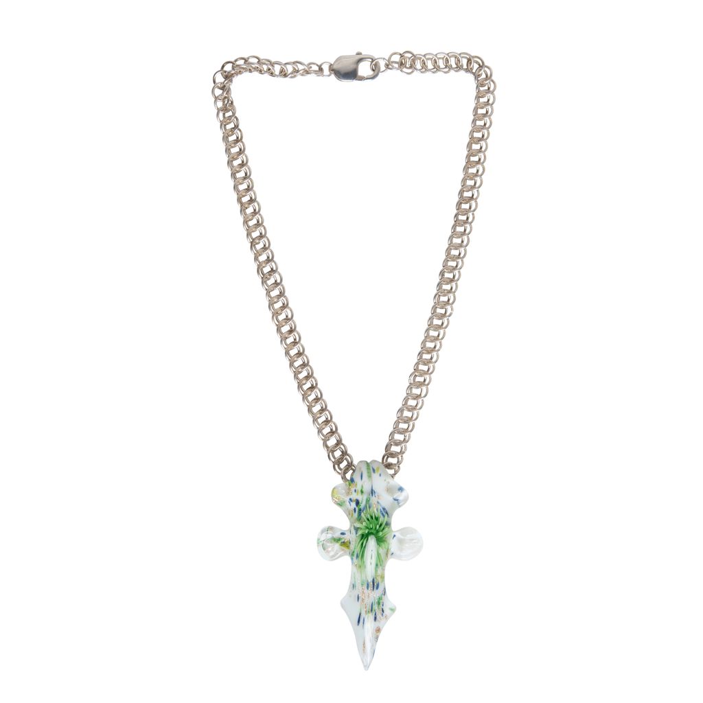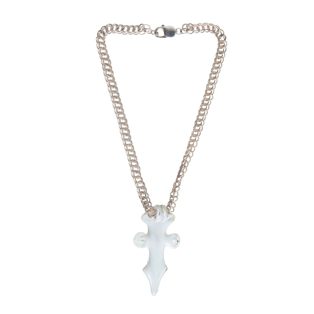 Glory Necklace features deadstock vintage cross pendant with sterling silver chainmail, done in collaboration with artist Emma Fasciolo.