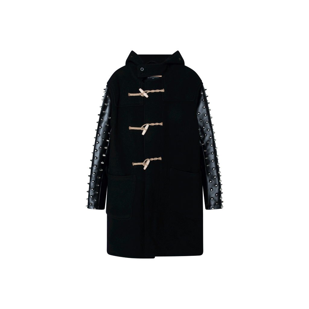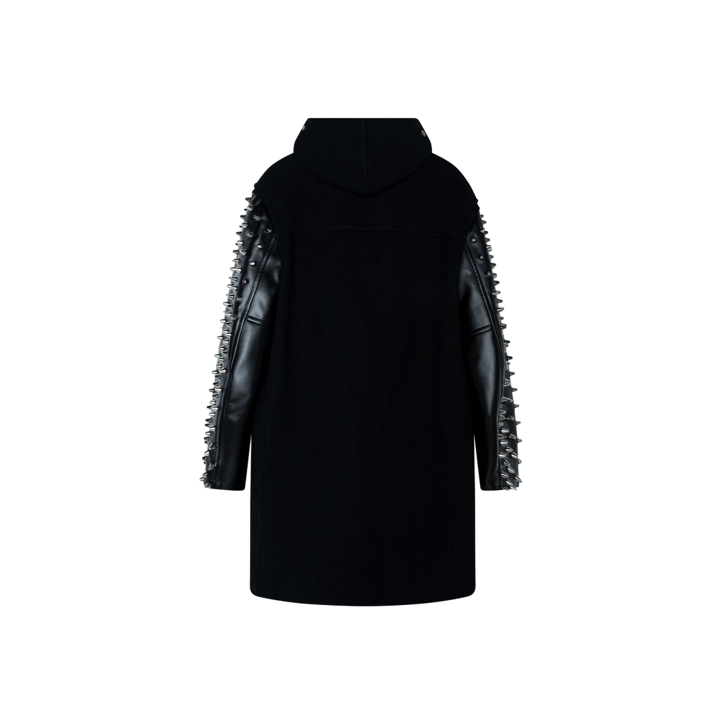 Gloverall x Junya Watanabe Black Monty Studded Duffle Coat features oversized fit, fixed throat tab, 2 pockets, wooden toggles and jute rope fastenings, fixed shoulder cape, and leather sleeves with silver stud design.