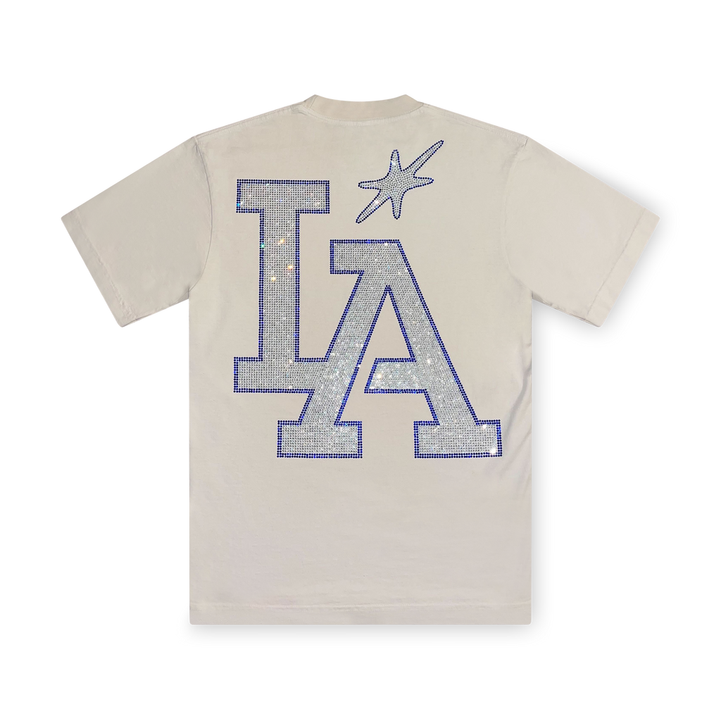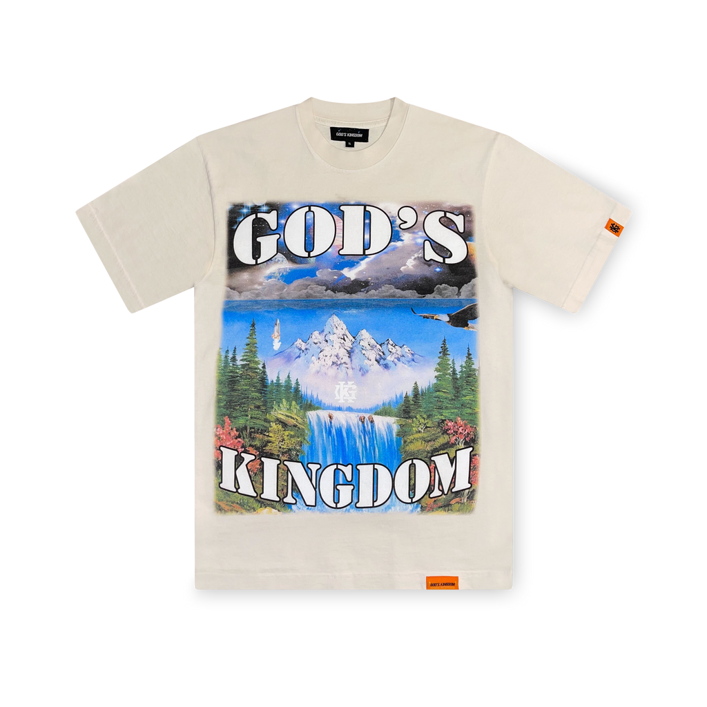 God's Kingdom Tee features boxy fit, jump print design on front, and LA rhinestones on back.