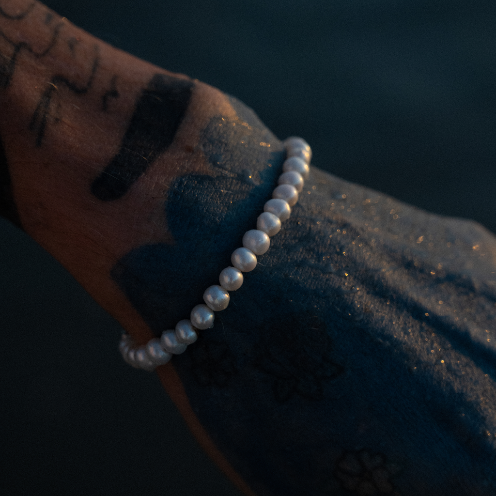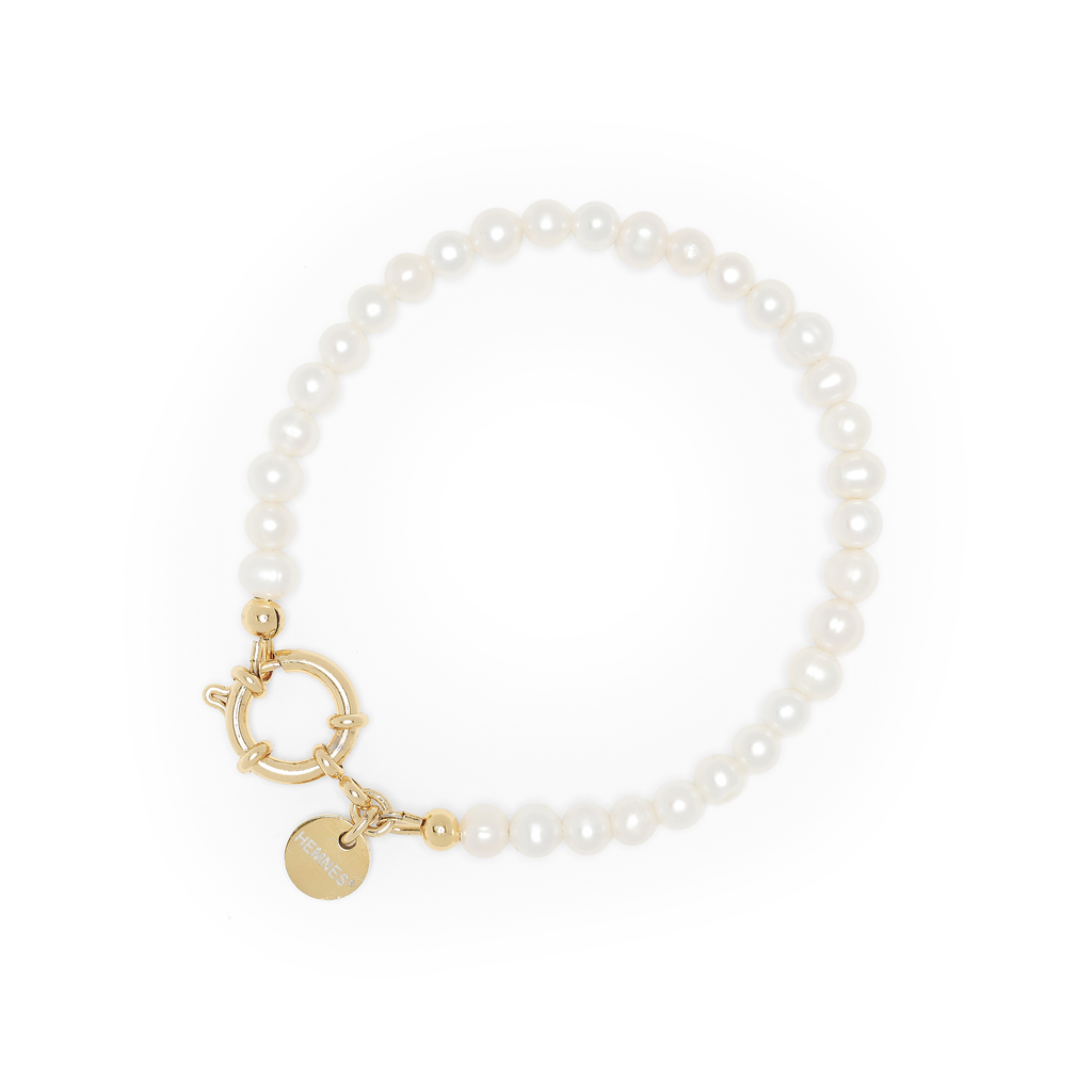 Handcrafted bracelet in 18k gold-plated stainless steel. Freshwater pearls at length. Spring-ring fastening. Made in Los Angeles, CA.