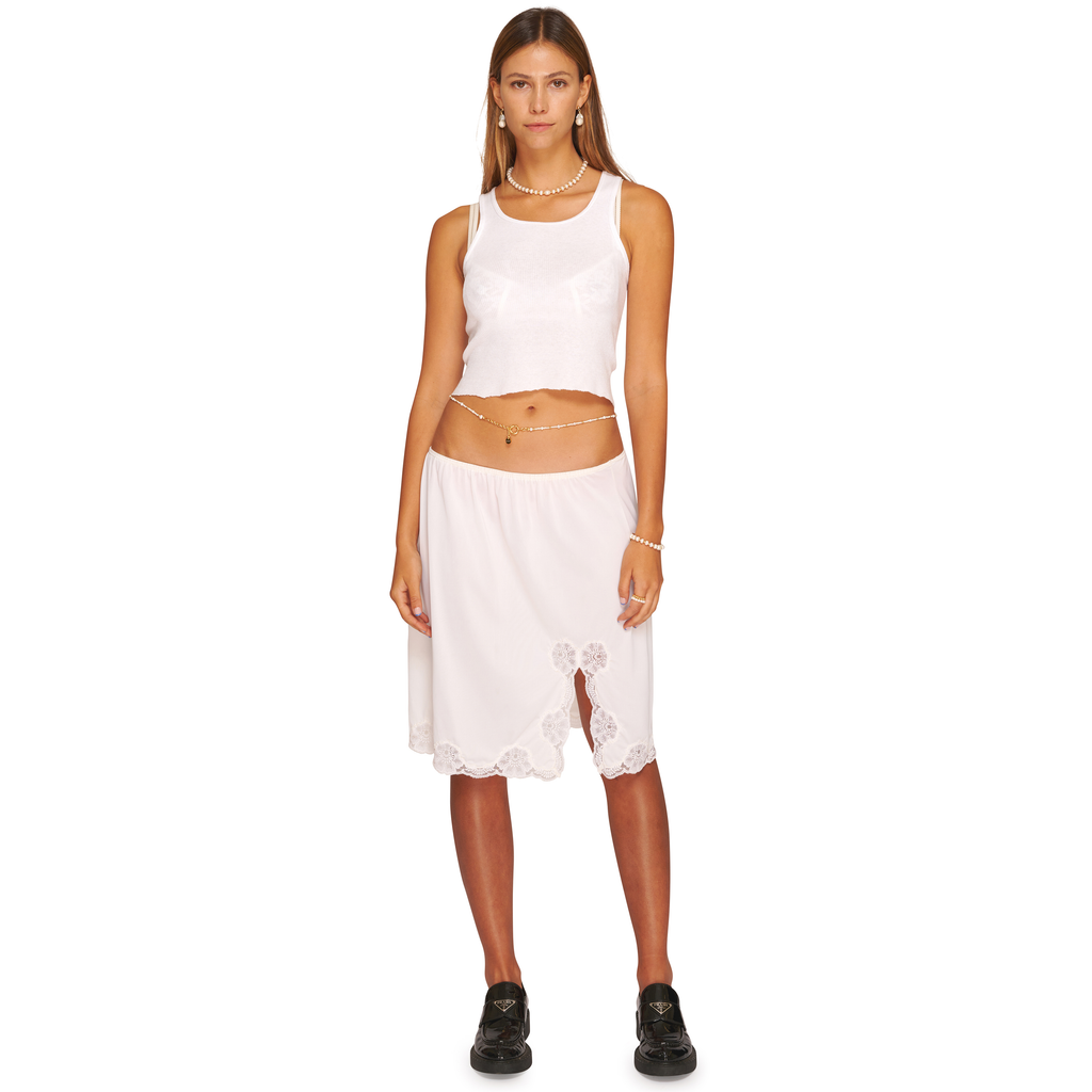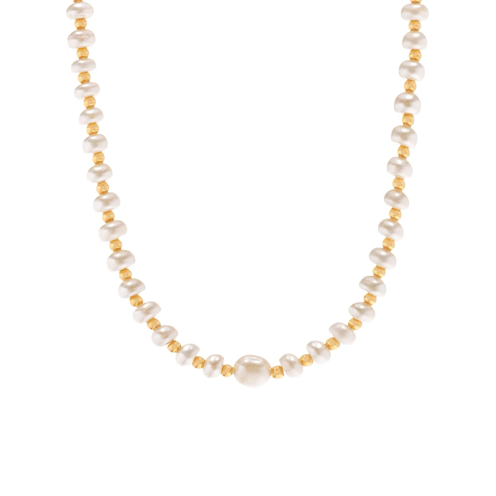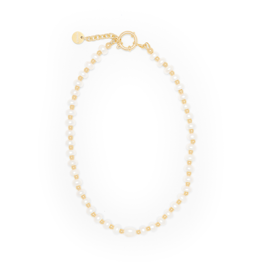 Handcrafted necklace in 18k gold-plated stainless steel. 18k gold-plated stainless steel beads and freshwater pearls at length. Spring-ring fastening and 2" extension chain for adjustable sizing. Handmade in Los Angeles, CA.