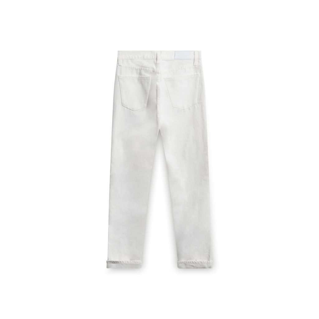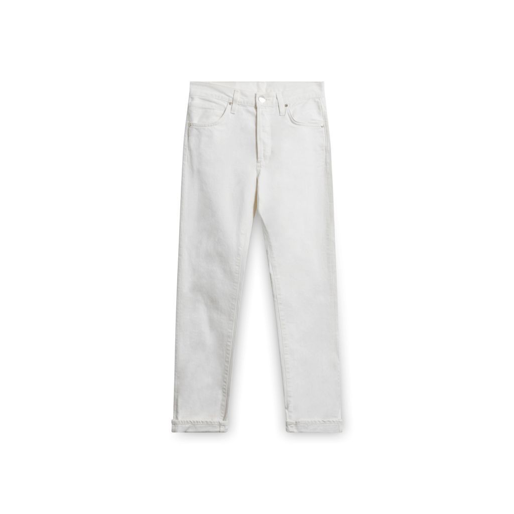 Goldsign White Denim Jeans features gold hardware, dual pockets on the front and back, and the Goldsign logo in the waistband.