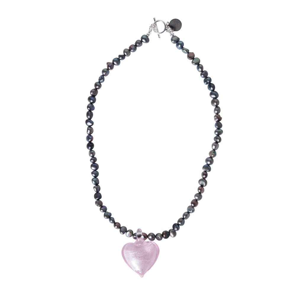 - Freshwater Pearls, Glass Heart Pendant, Sterling Silver Clasp