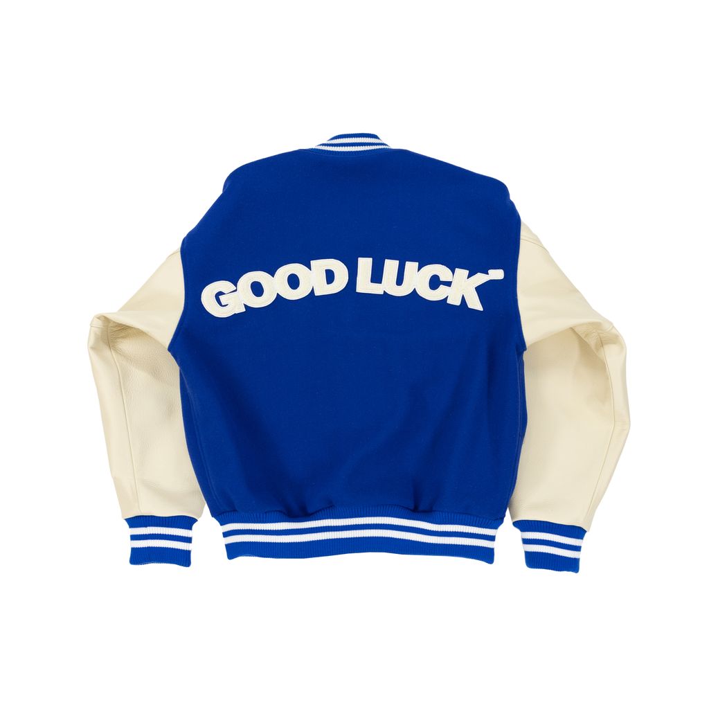 Made-to-order varsity jacket in collaboration with Roots for Basic Space. Ecru leather sleeves with royal blue melton body, contrast embroidered graphics throughout. Lined with satin in signature red finish. One size fits all. Made in Canada