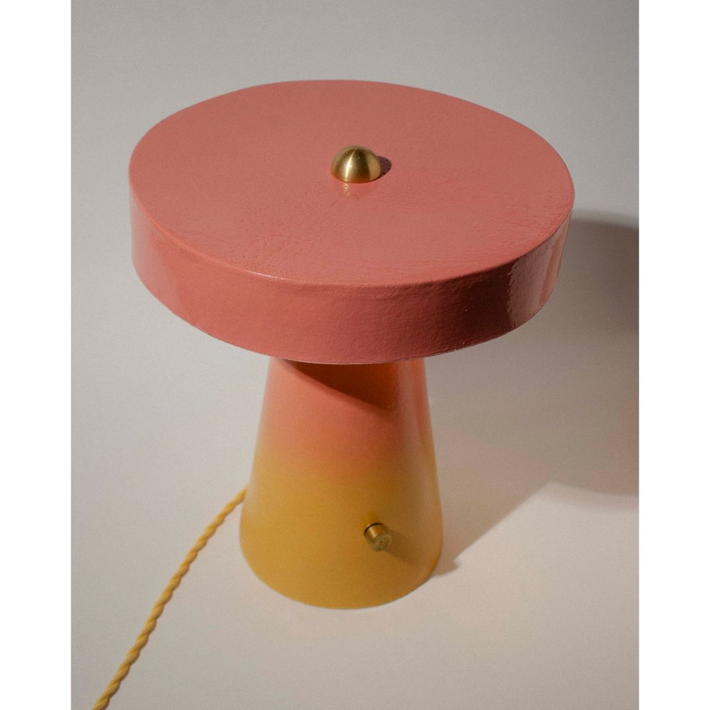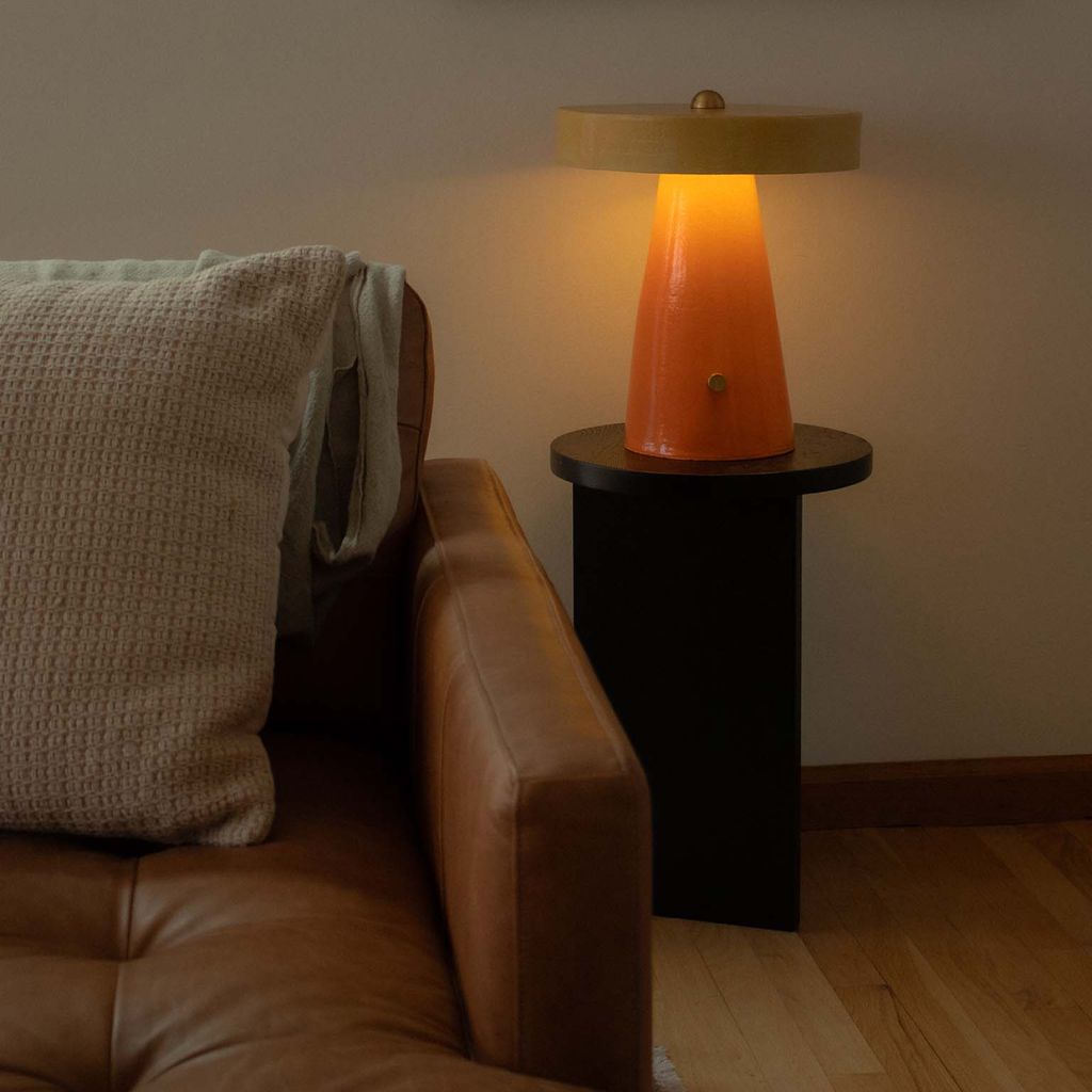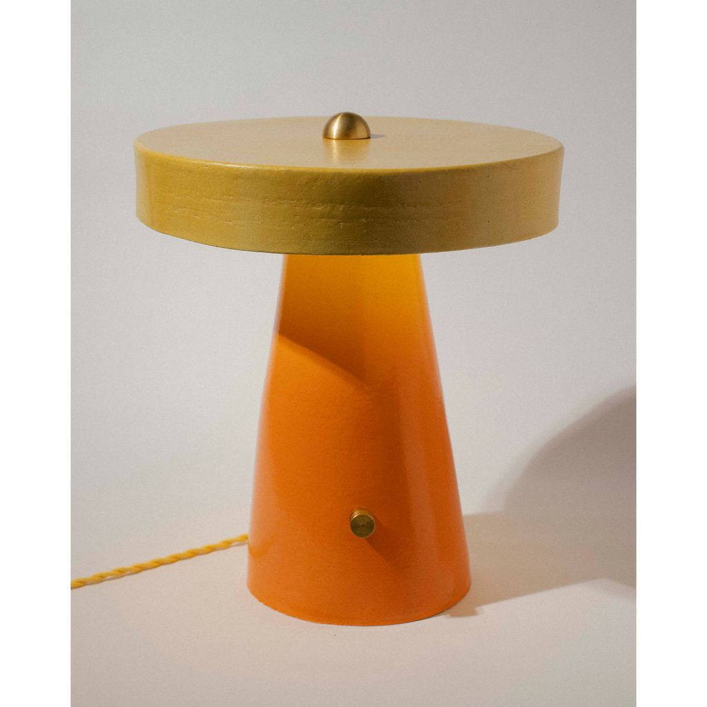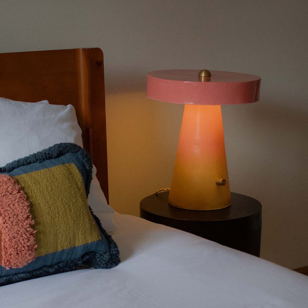This hand-built ceramic table lamp is a simple, modern geometric mushroom shape that is impactful and inviting, making it a perfect cozy accent in any room.