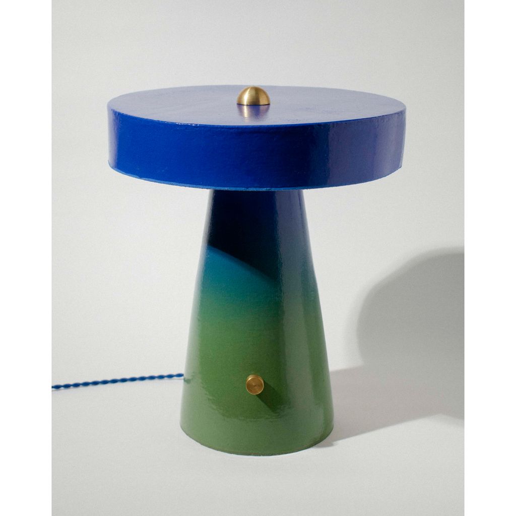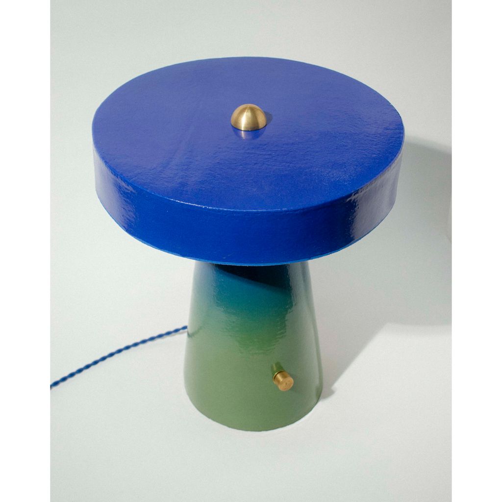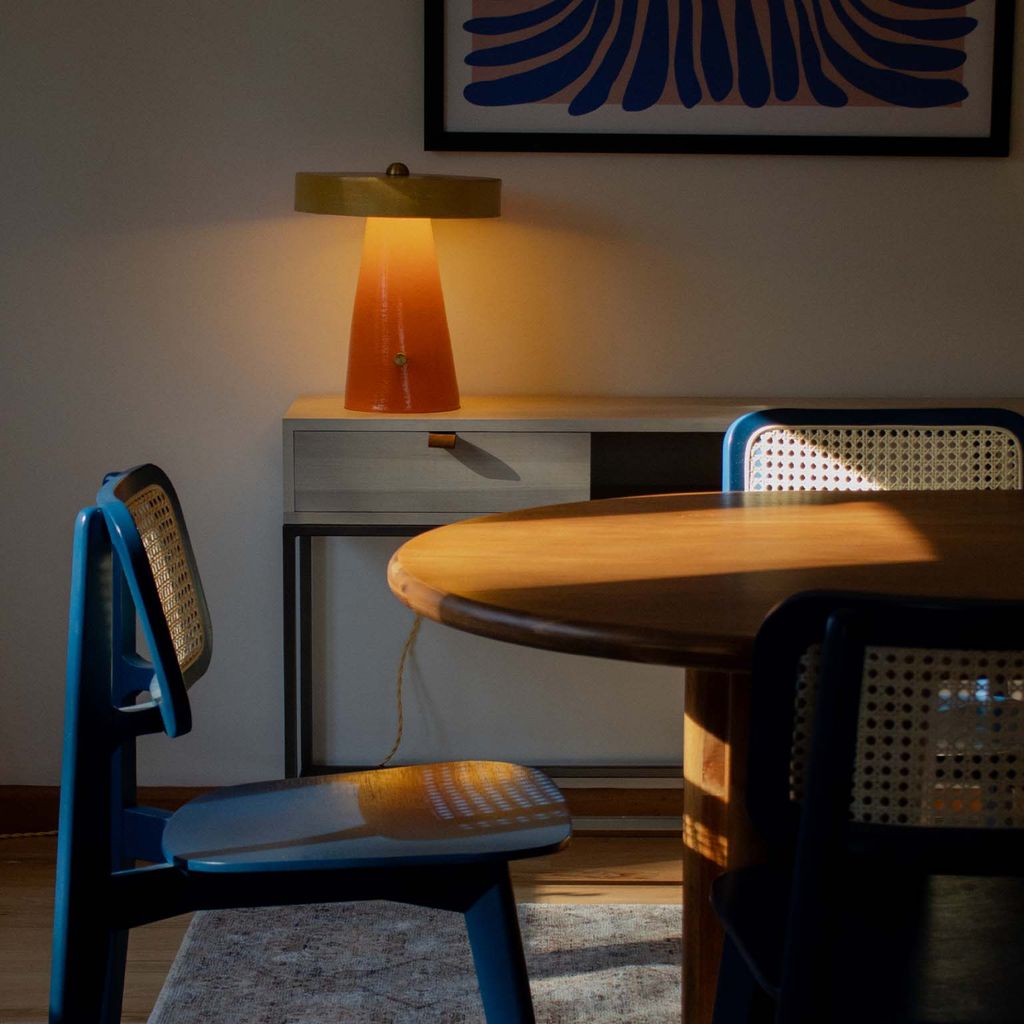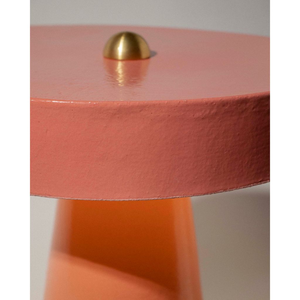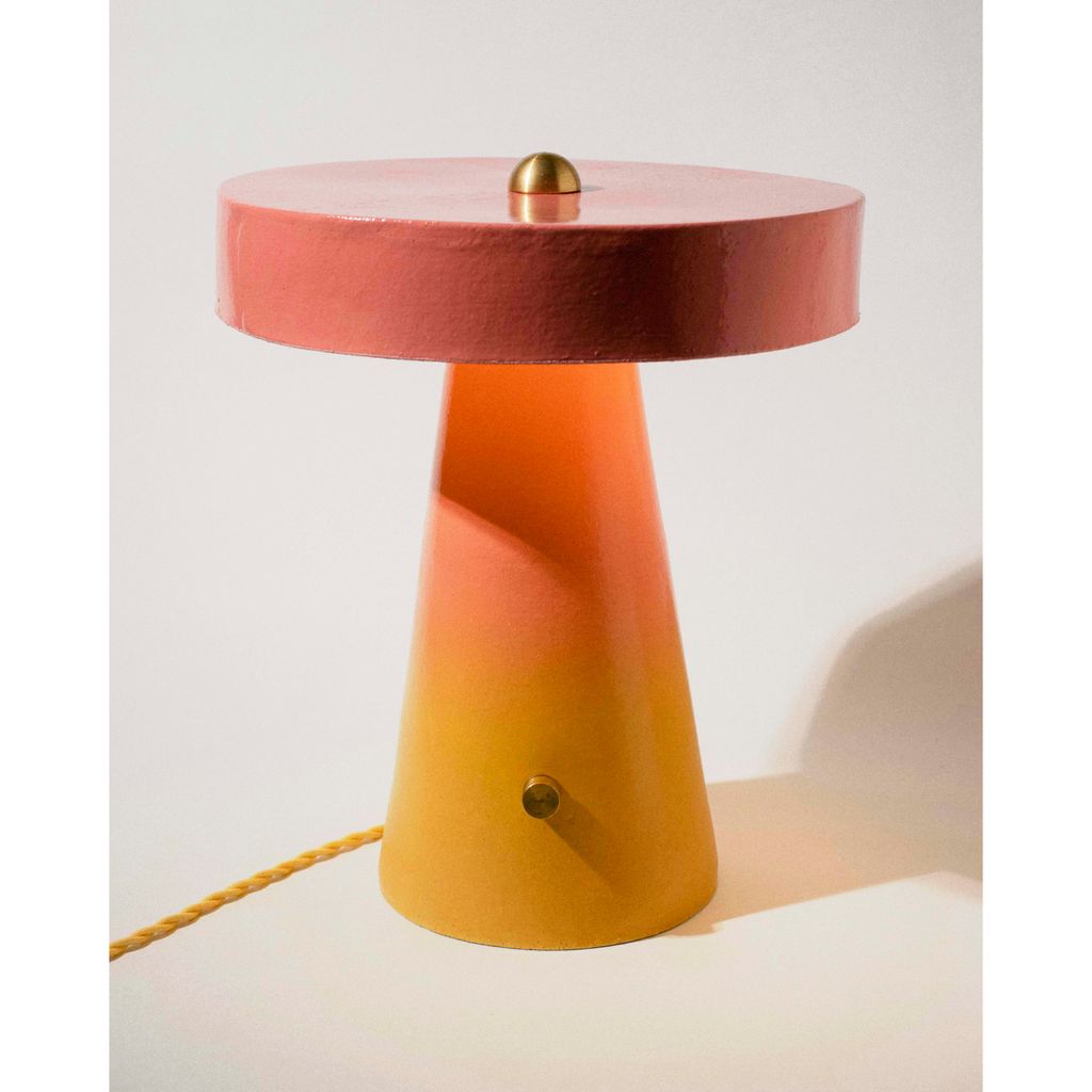 This hand-built ceramic table lamp is a simple, modern geometric mushroom shape that is impactful and inviting, making it a perfect cozy accent in any room.