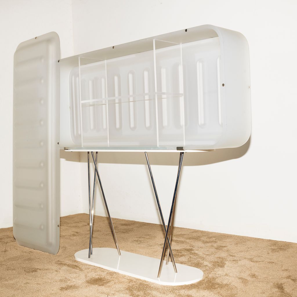 Sideboard with internal structure and shelves in transparent plastic. Two doors with magnetic closure.