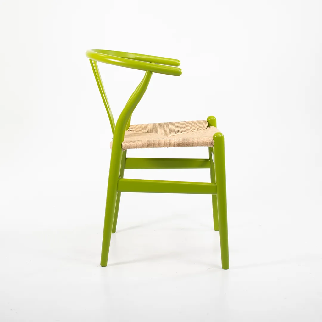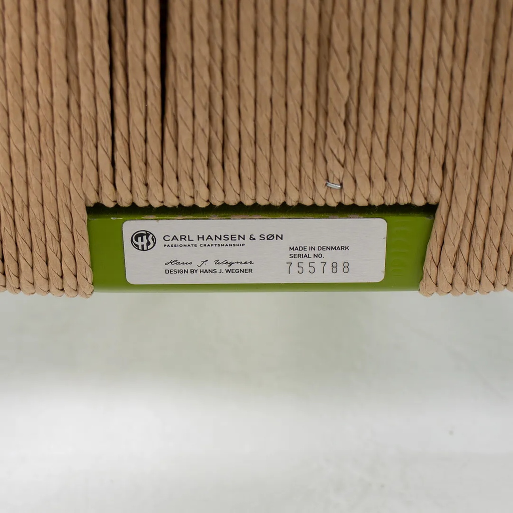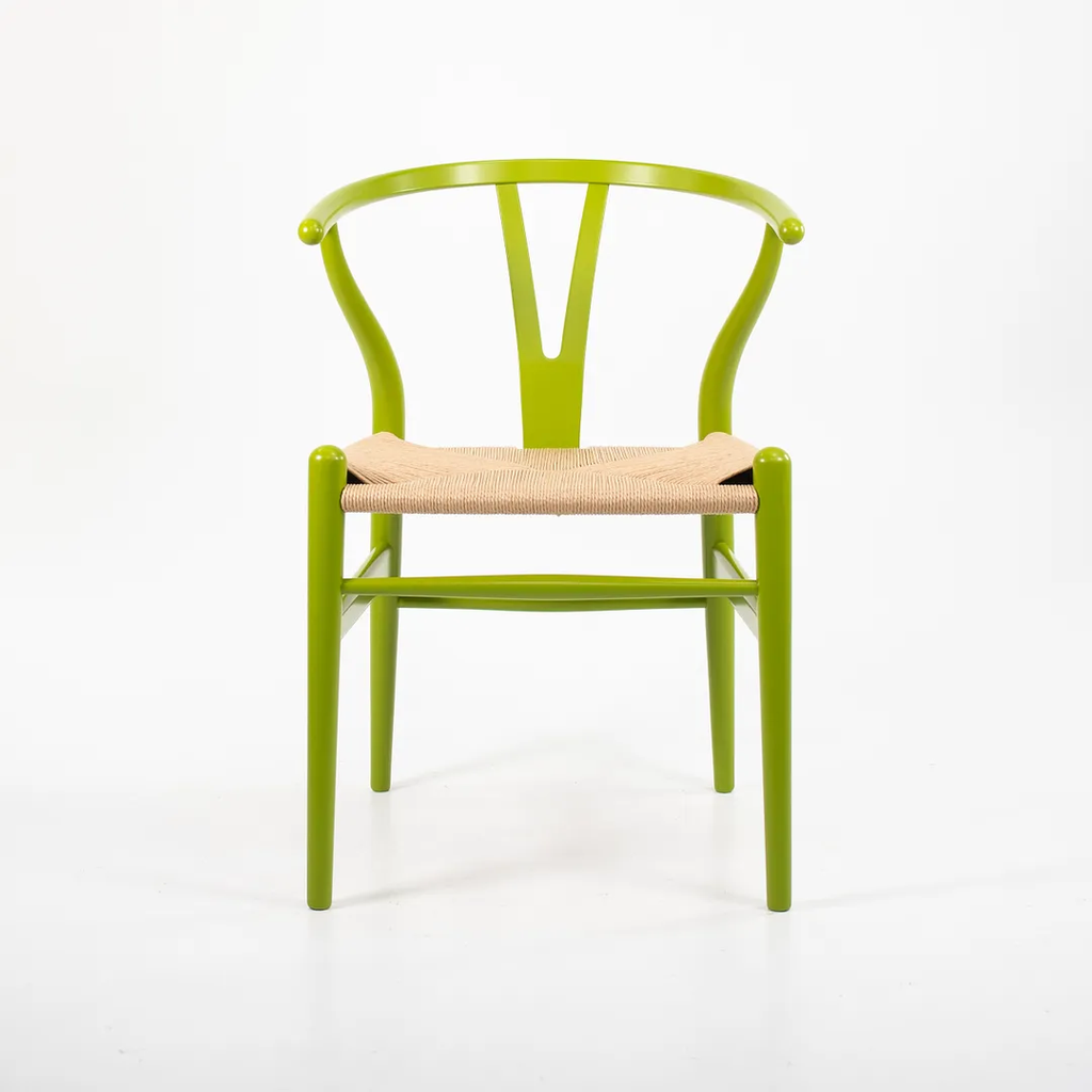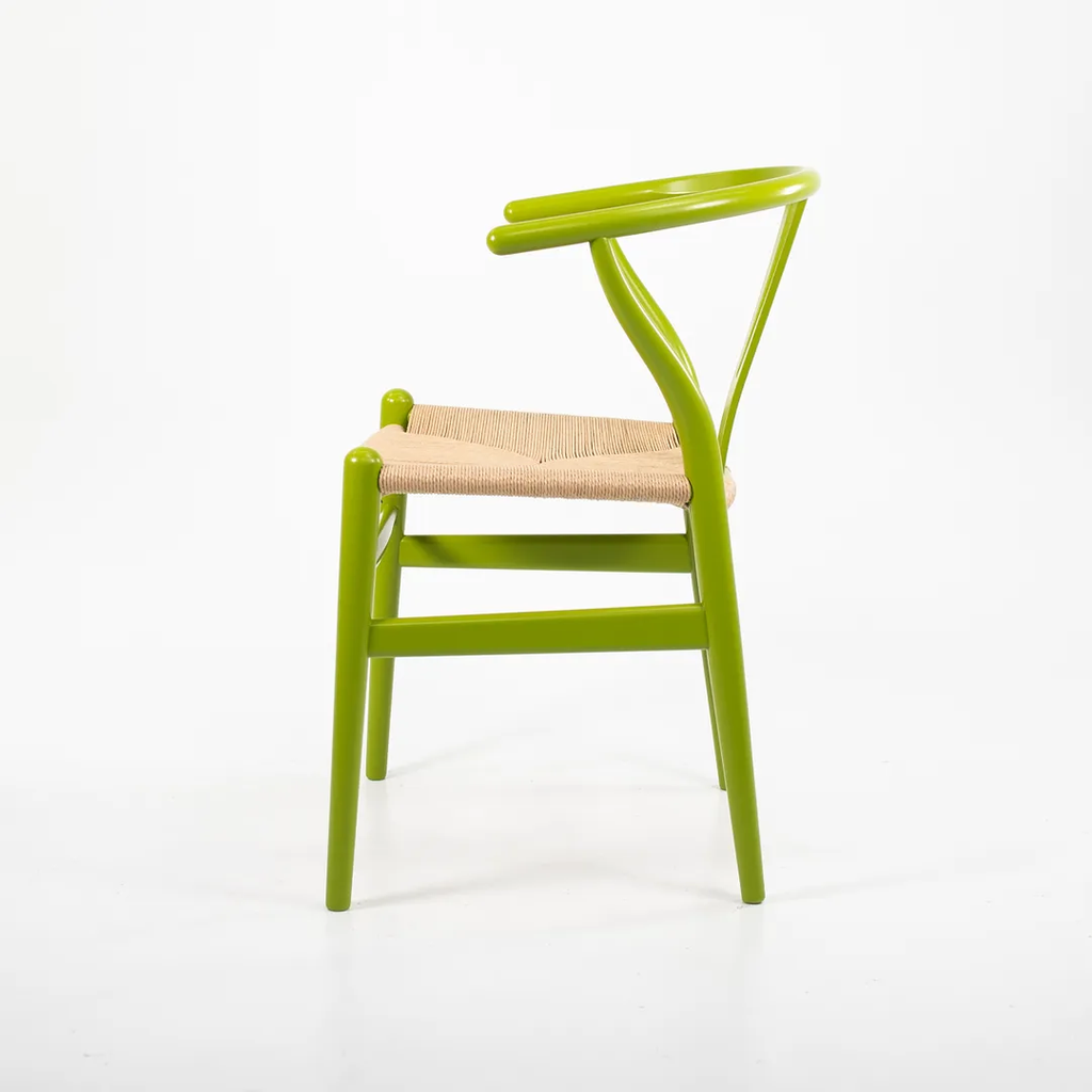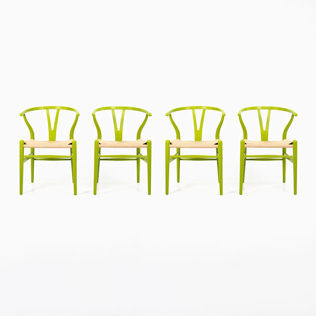 These are four (sold individually) Wishbone chairs, designed by Hans Wegner and produced by Carl Hansen & Son in Denmark. The chairs are made with a solid beech frame, painted bright green with a natural paper cord seat. These chairs date to circa 2021 and are guaranteed as authentic. Condition is excellent with only minimal wear. See photos. These chairs came directly from Carl Hansen. They were likely never used in a home or office setting but may have been display/floor models within their showroom.