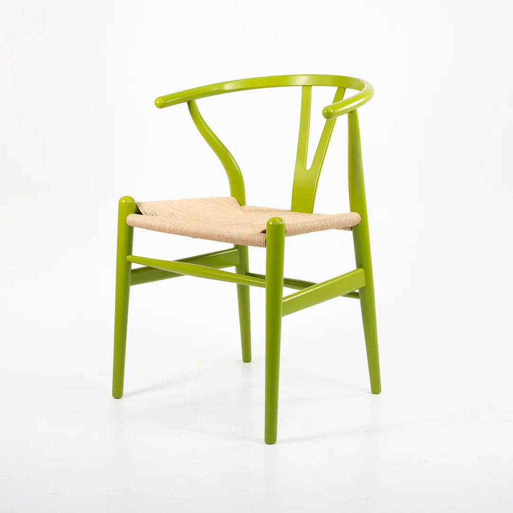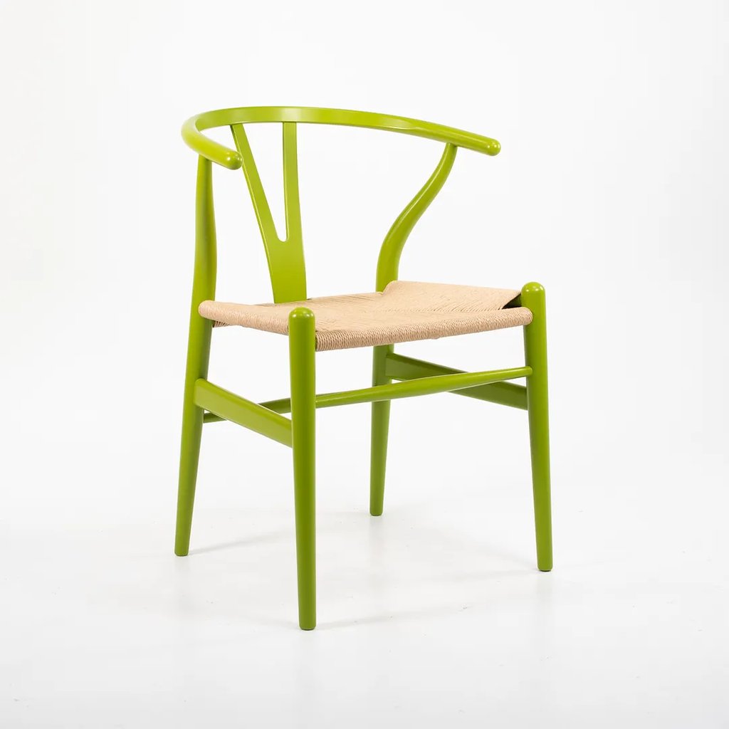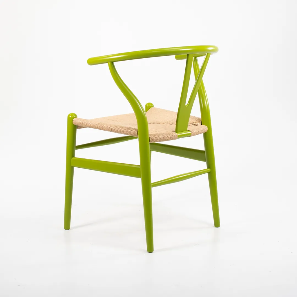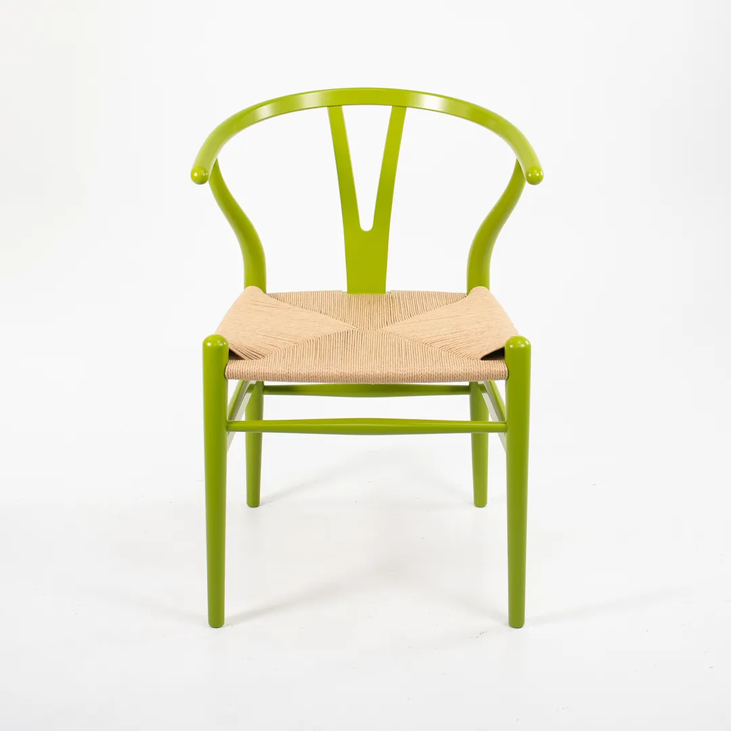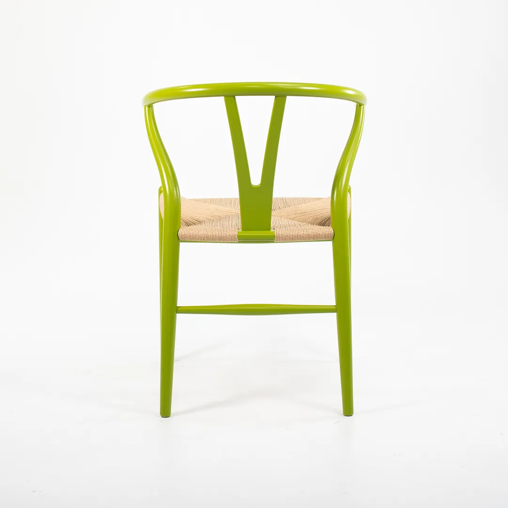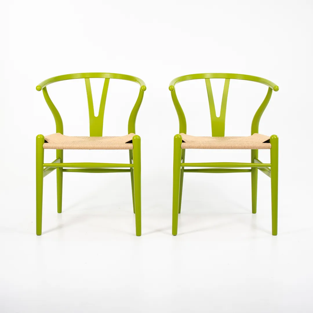 These are four (sold individually) Wishbone chairs, designed by Hans Wegner and produced by Carl Hansen & Son in Denmark. The chairs are made with a solid beech frame, painted bright green with a natural paper cord seat. These chairs date to circa 2021 and are guaranteed as authentic. Condition is excellent with only minimal wear. See photos. These chairs came directly from Carl Hansen. They were likely never used in a home or office setting but may have been display/floor models within their showroom.