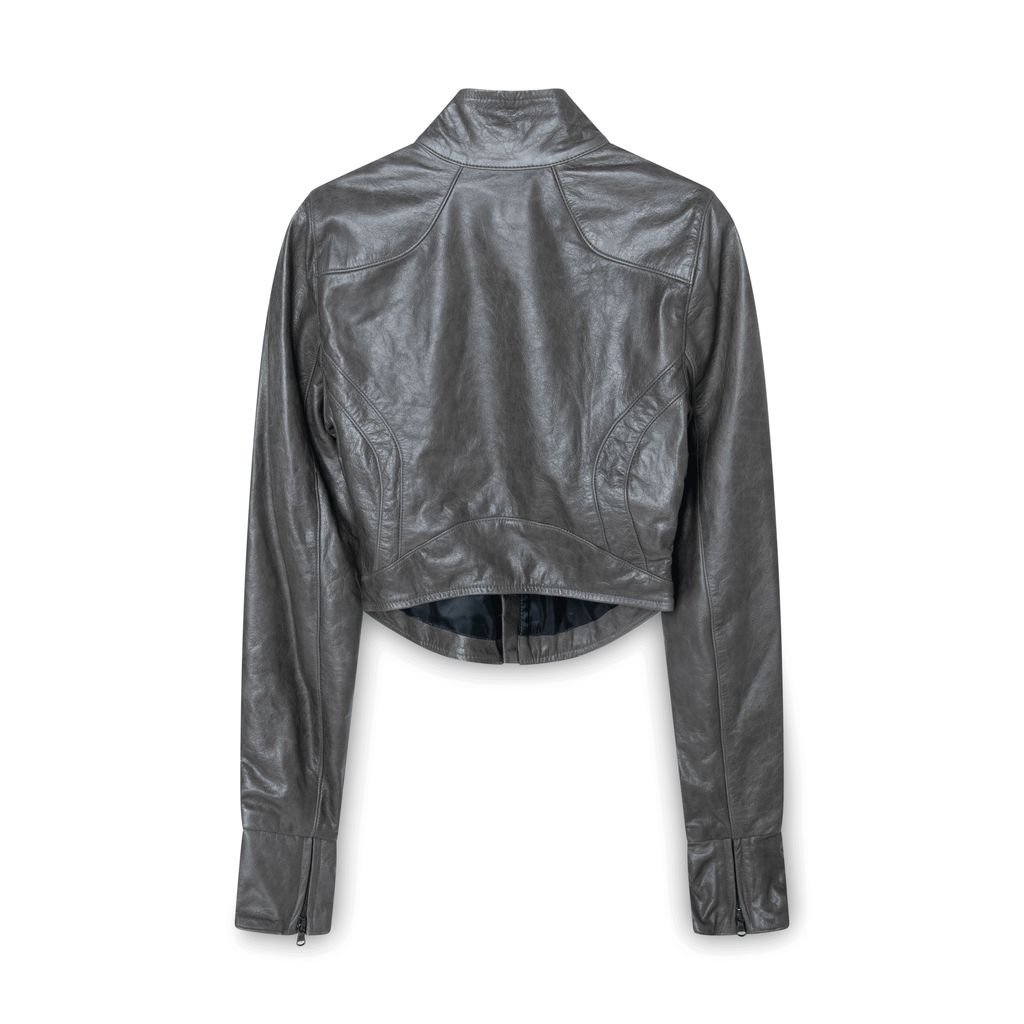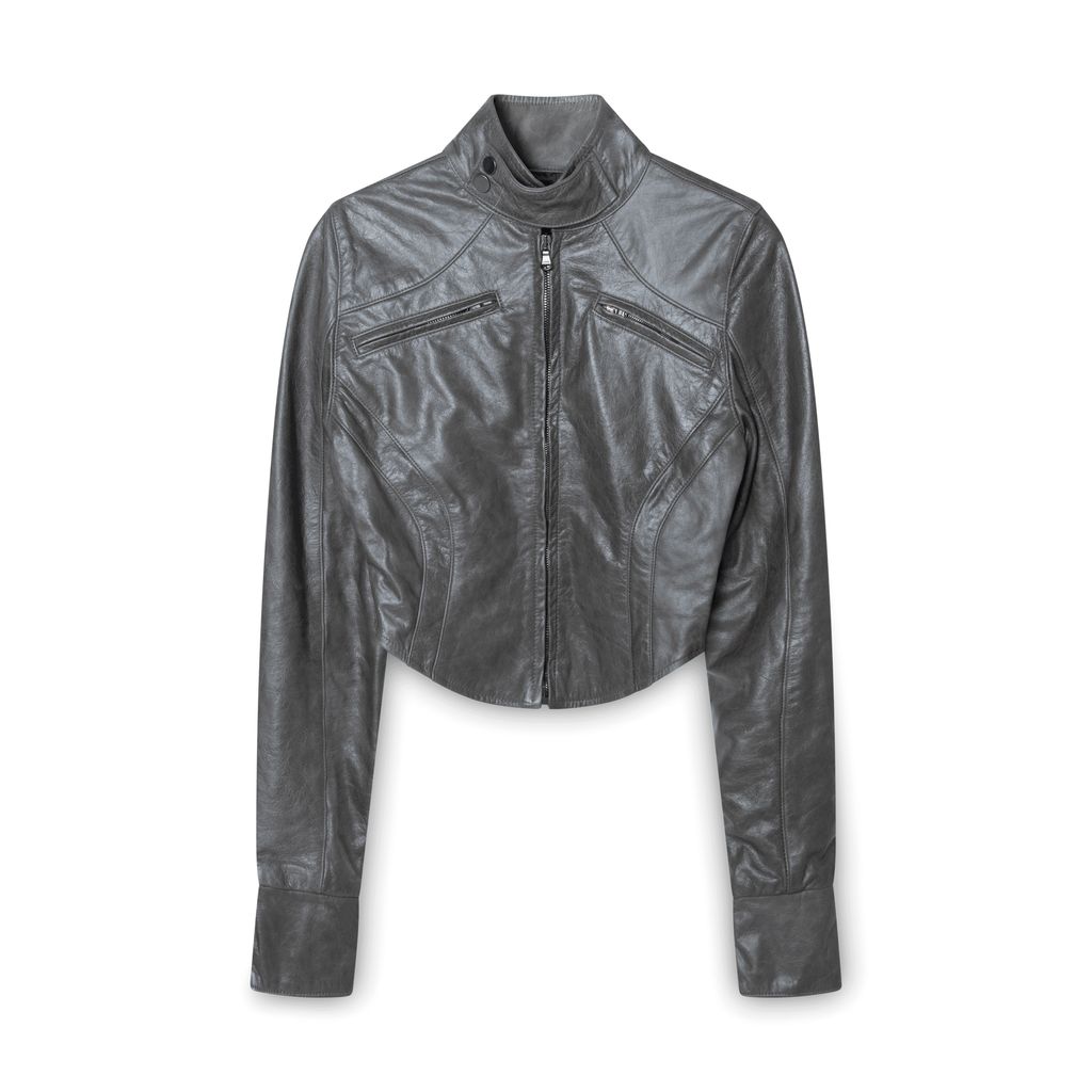 An instant classic – the leather moto jacket is ultra-fitted and slightly cropped for a contoured waistline. It features star detail seams in the back with zippers on the center front, chest, and flared sleeve cuffs.