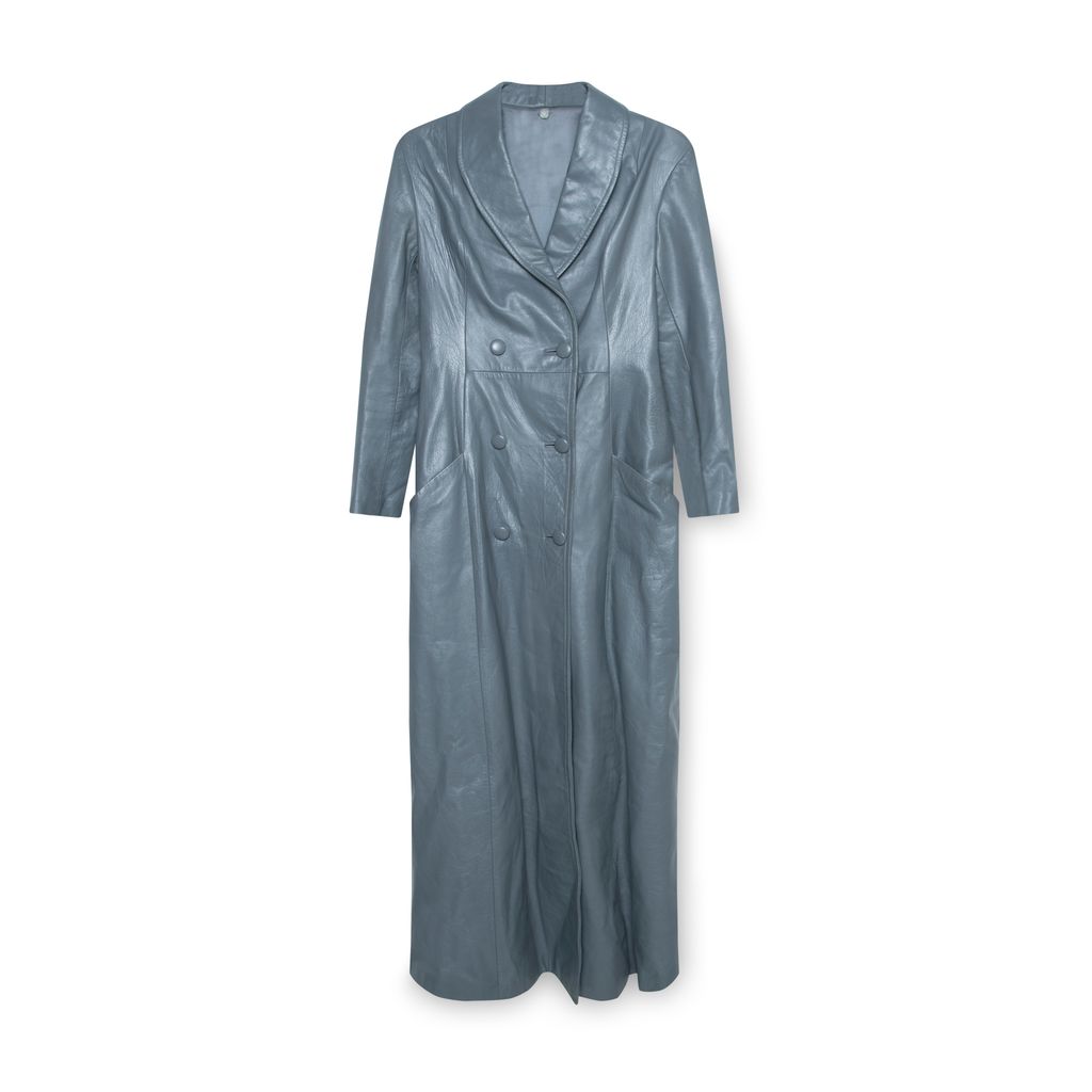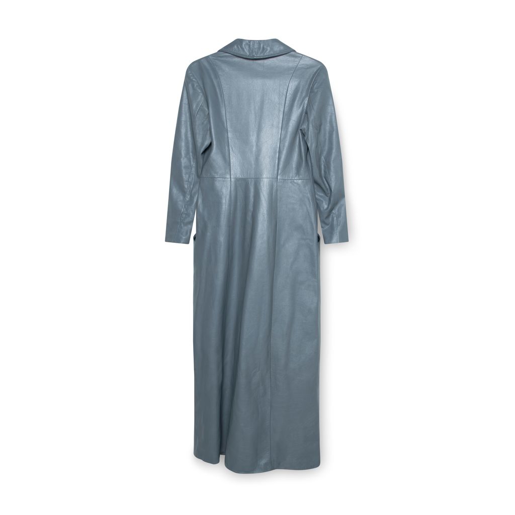 Grey Leather Trench Coat features double breasted front button closure and slanted side pockets.