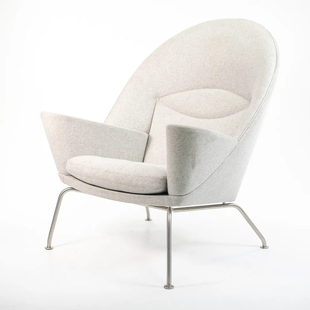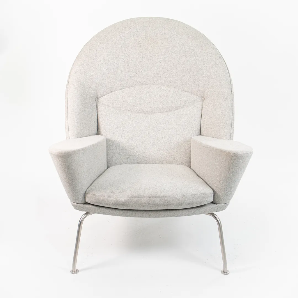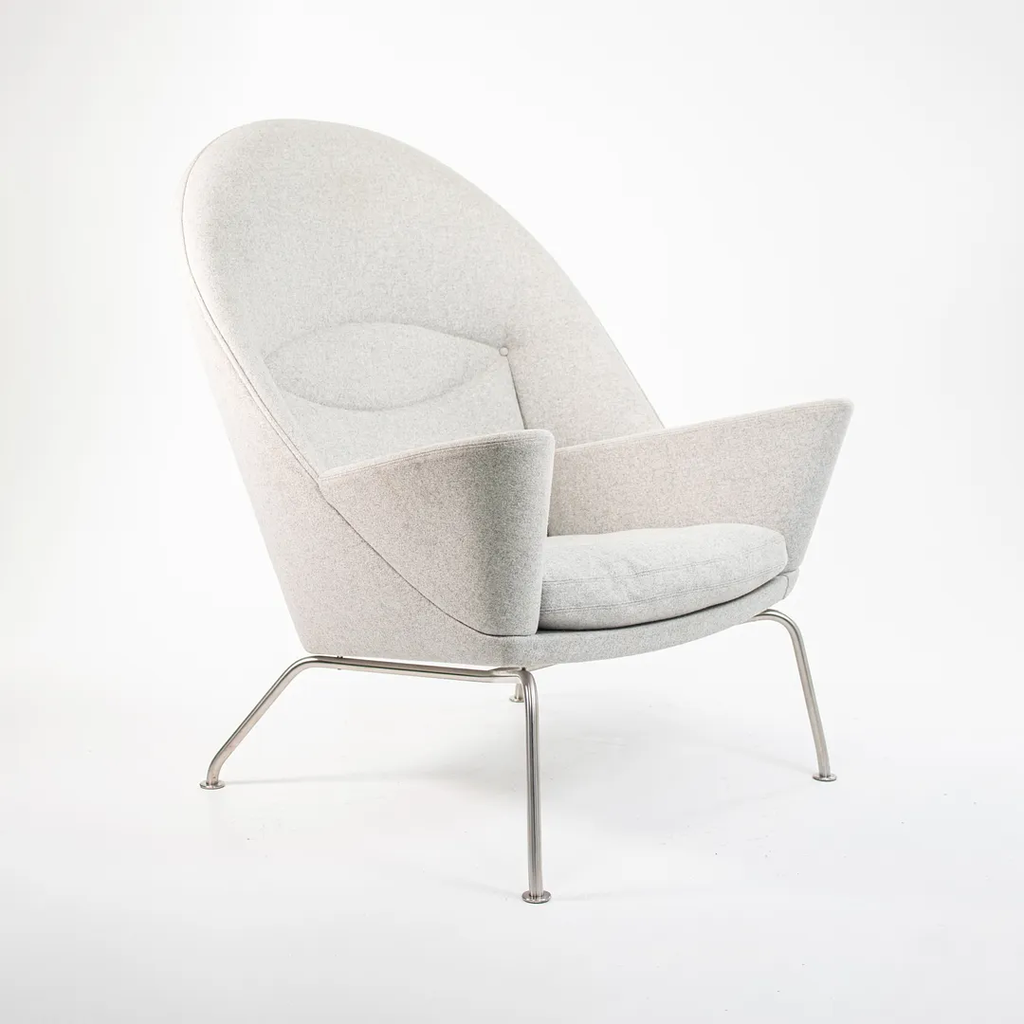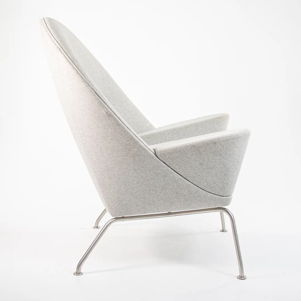 Listed for sale is a Oculus Lounge Chair designed by Hans Wegner, produced by Carl Hansen & Son in Denmark. The chair is made with a stainless steel frame and Divina Melange light gray fabric (DM120). This chair dates to circa 2018 and is guaranteed as authentic. It appears that this chair has never been used in a home or office setting, though may show some minuscule wear from transportation to our warehouse and storage. Condition is excellent overall, though it appears to have a 3 inch mark on the right side of the chair (visible from the side profile) and has some light soiling. We're quite confident that we can have the soiling professionally cleaned and removed prior to shipping if desired at no additional cost.