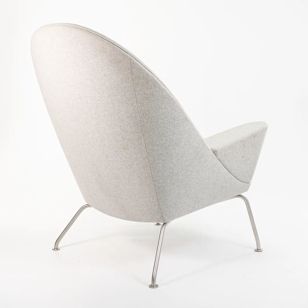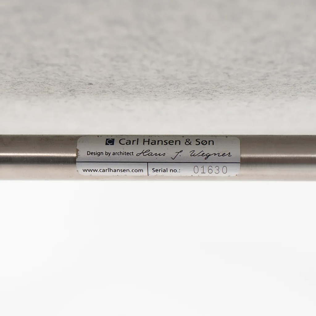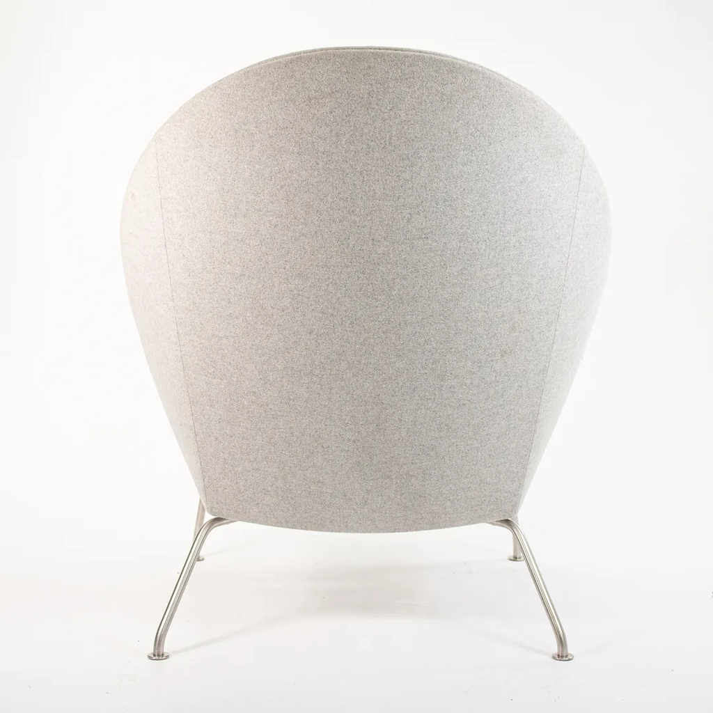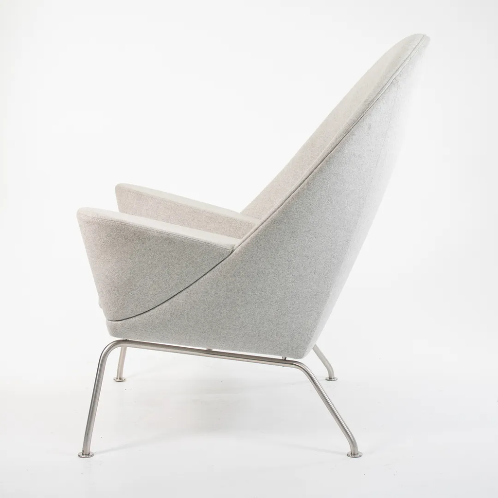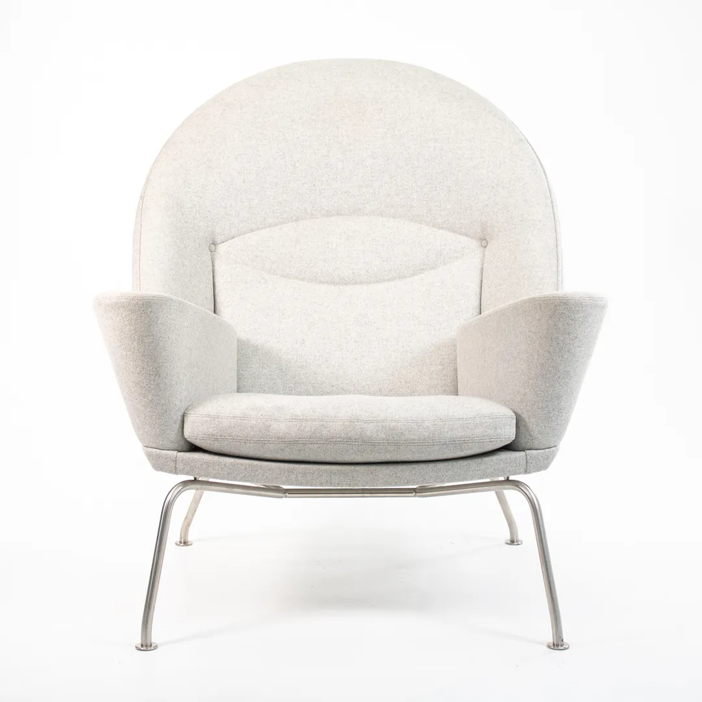 Listed for sale is a Oculus Lounge Chair designed by Hans Wegner, produced by Carl Hansen & Son in Denmark. The chair is made with a stainless steel frame and Divina Melange light gray fabric (DM120). This chair dates to circa 2018 and is guaranteed as authentic. It appears that this chair has never been used in a home or office setting, though may show some minuscule wear from transportation to our warehouse and storage. Condition is excellent overall, though it appears to have a 3 inch mark on the right side of the chair (visible from the side profile) and has some light soiling. We're quite confident that we can have the soiling professionally cleaned and removed prior to shipping if desired at no additional cost.
