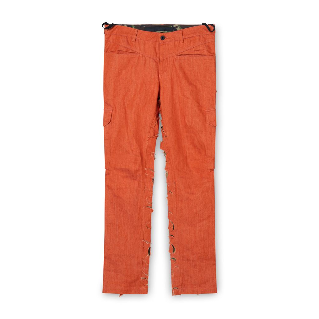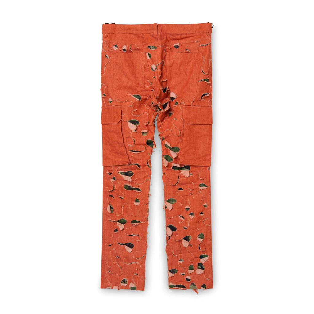 Griffin Orange Cargos with Camo Cutouts features 6 pockets, S shaped cutouts on back of legs, and camo lining.