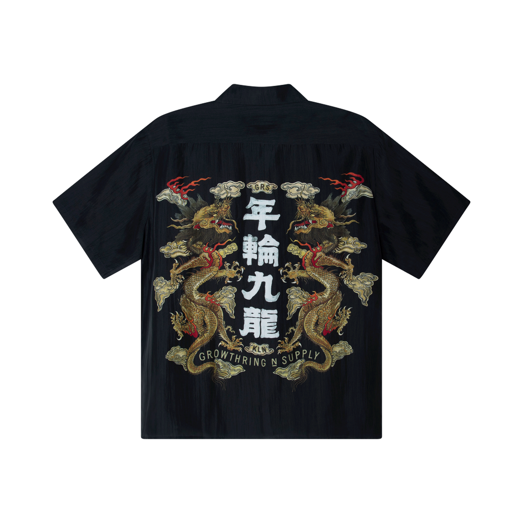 GRS Kowloon Double Dragon Overprint Shirt features 100% silk fabric, front button closure, and double-dragon design detail on front and back.