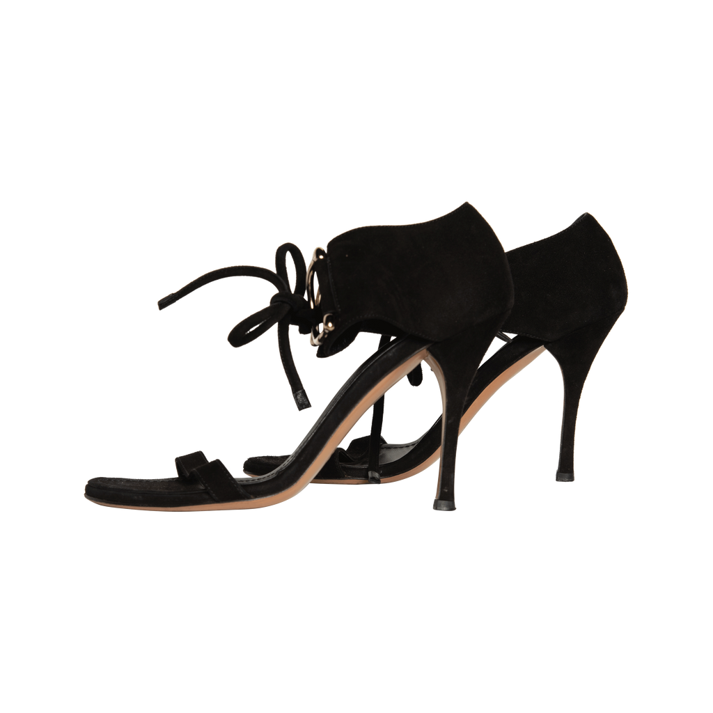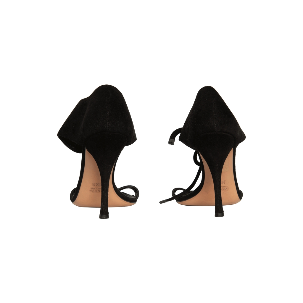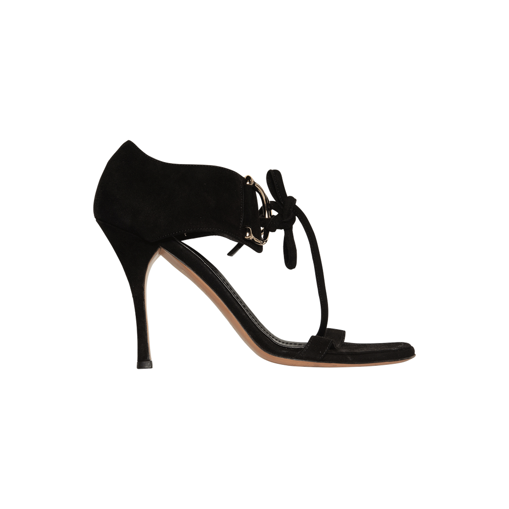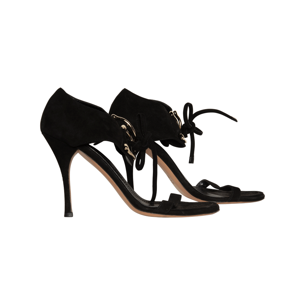 Gucci Black Suede Heels features gold D-ring hardware and 4 inch heels.