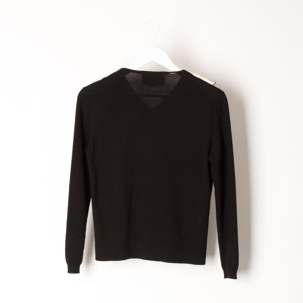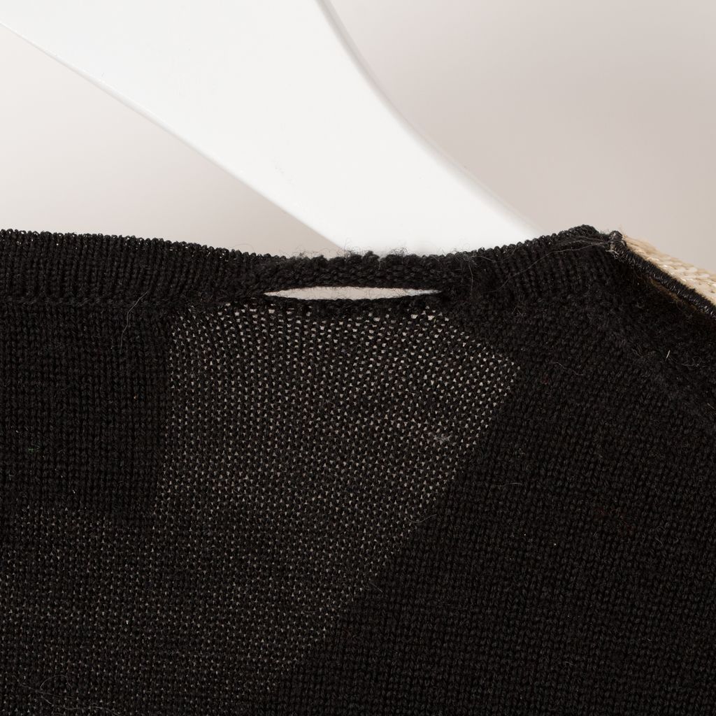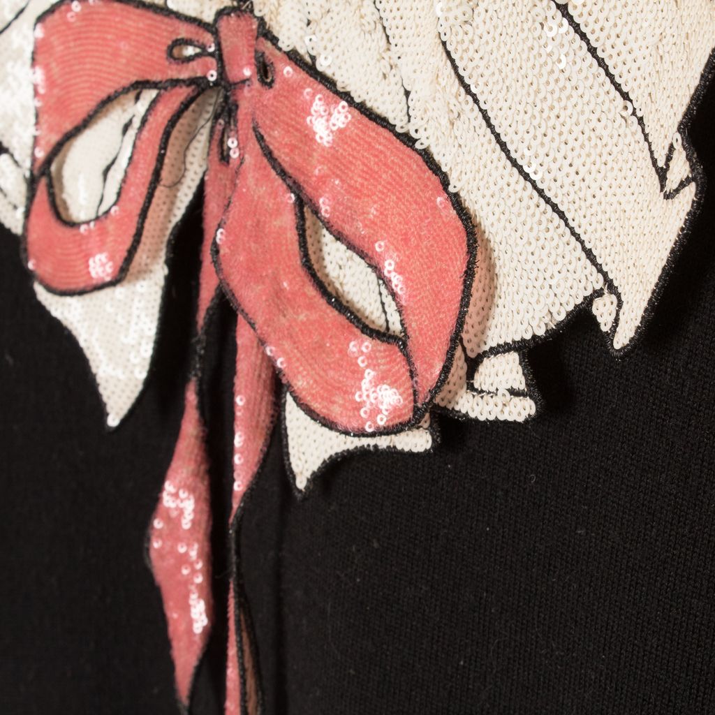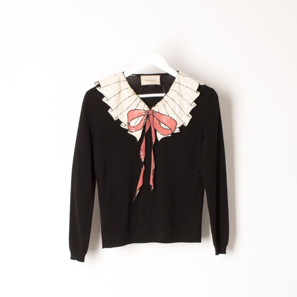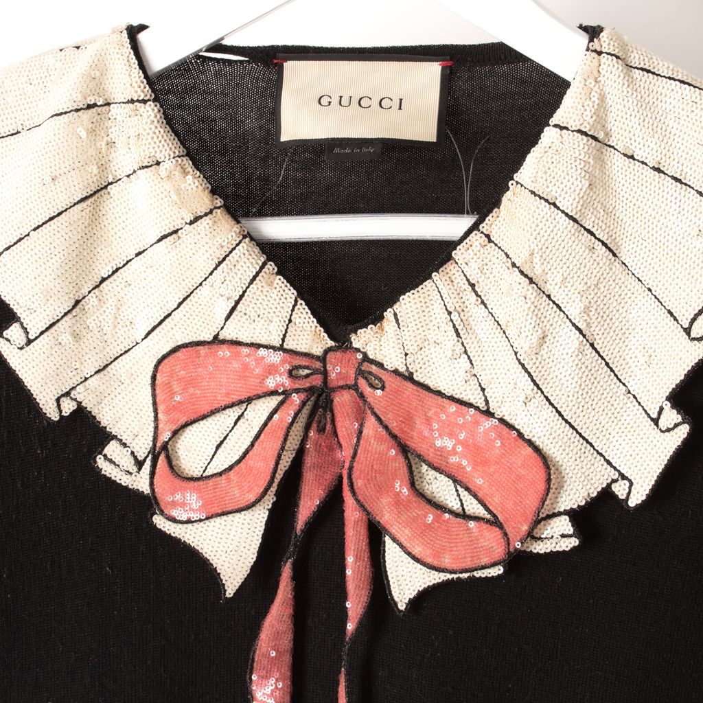 This soft wool Gucci sweater is embellished with a sequinned bib that resembles a ruffled collar and bow - creating a trompe l'oeil effect, in perfect condition minus flaw on back neckline, photo included.
