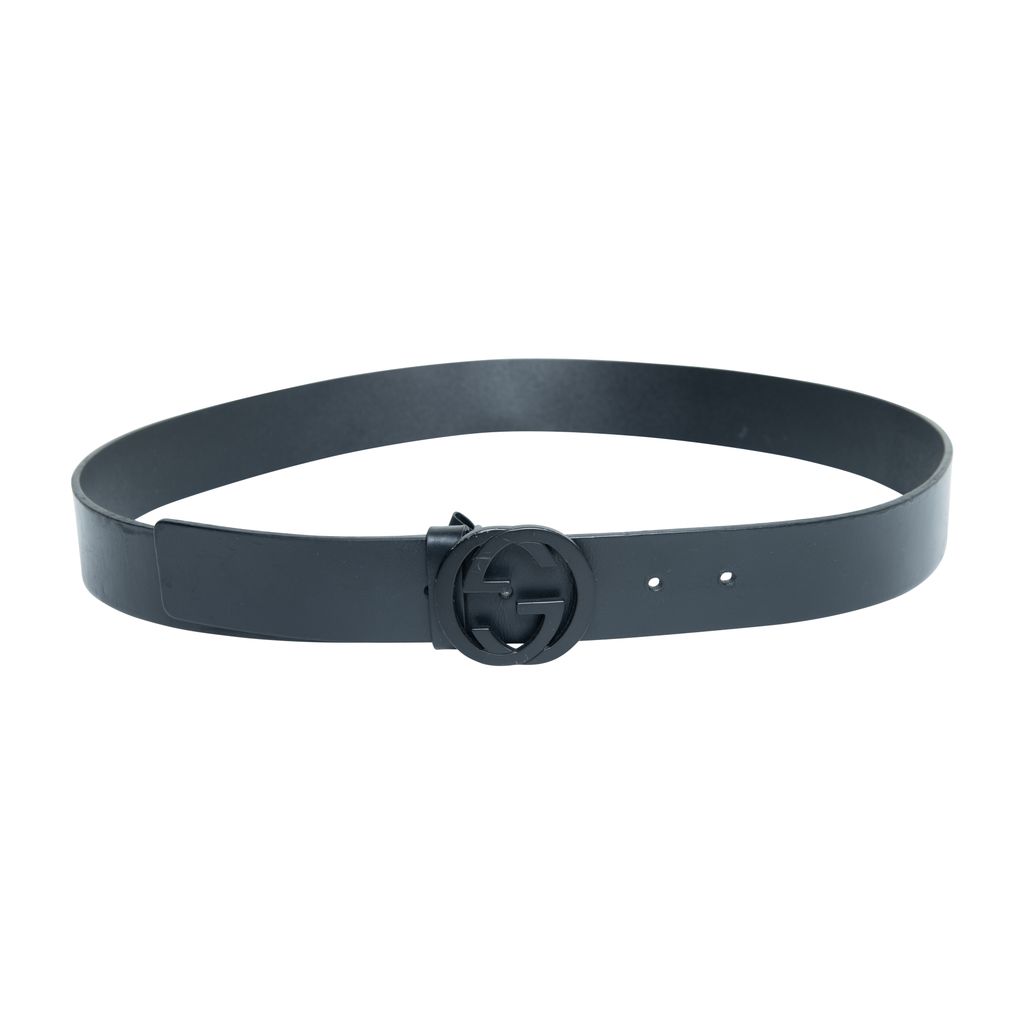 Gucci interlocking leather GG belt features matte hardware buckle with stud closure. Item comes with original box and dust bag.