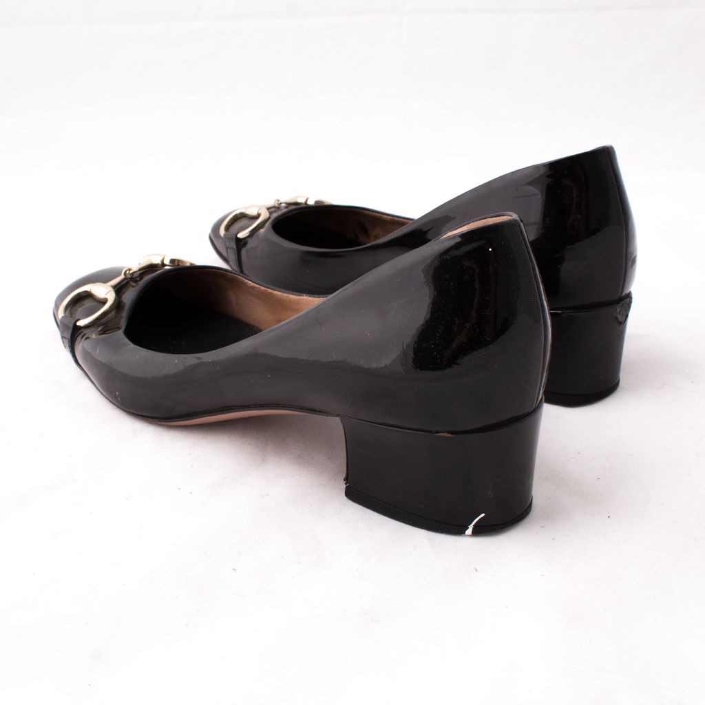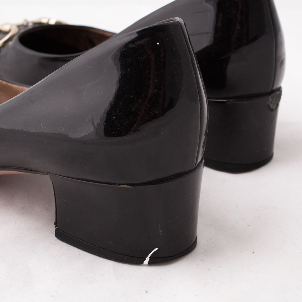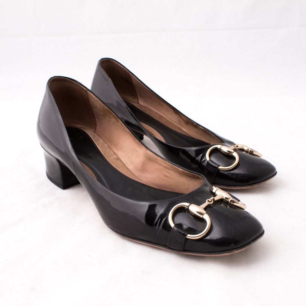 Lightly worn, horse bit ballet flat by Gucci. Horse-bit hardware accents a patent-leather ballet flat crafted with a low stacked heel. Features a leather upper, lining and sole.