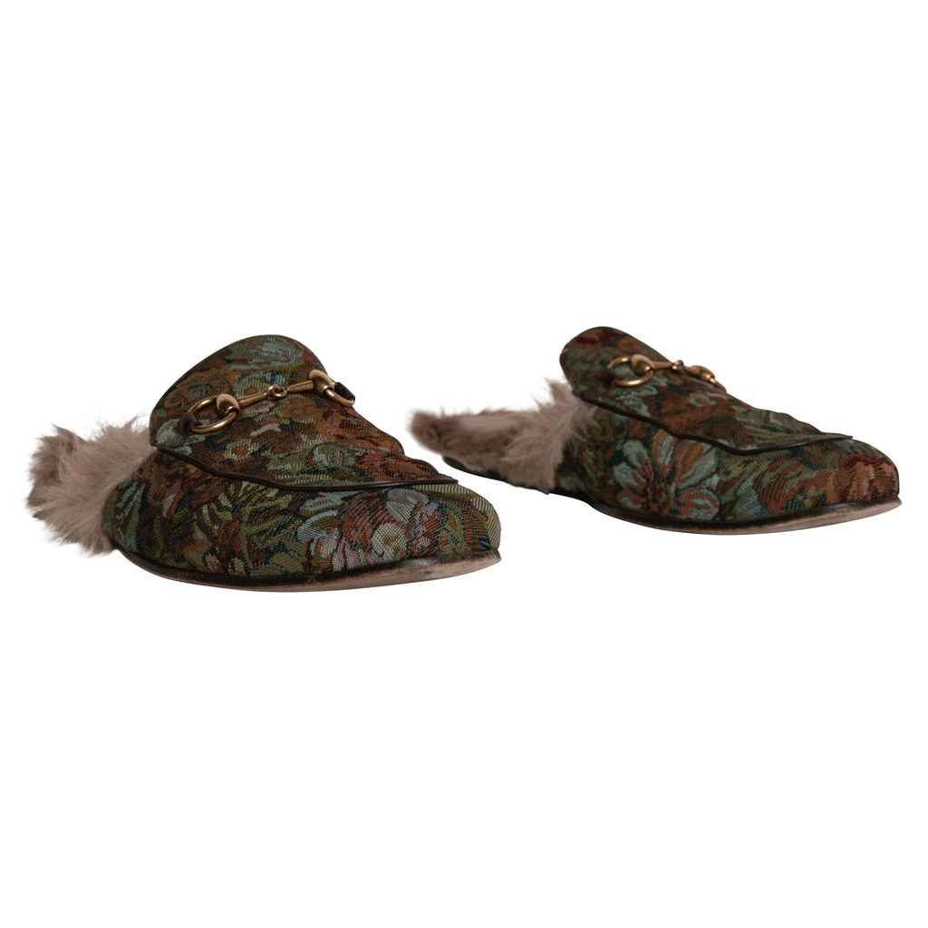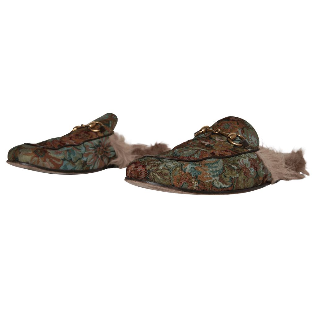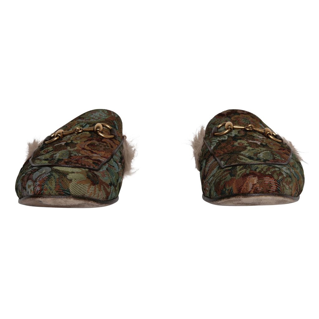 Gucci Princetown Tapestry Fur Loafers feature floral pattern and it's original box and storage bags. Made in Italy.