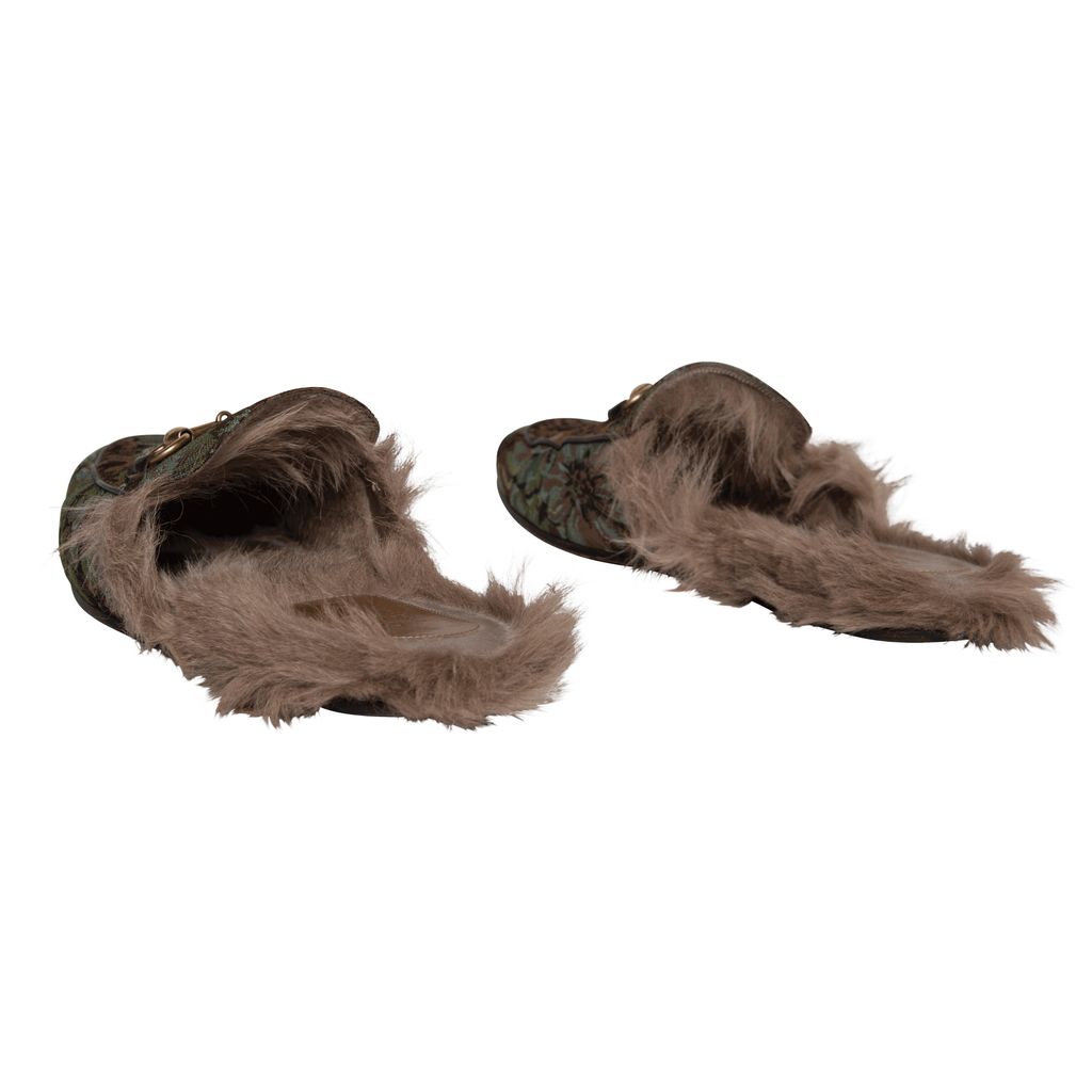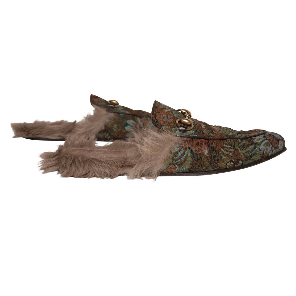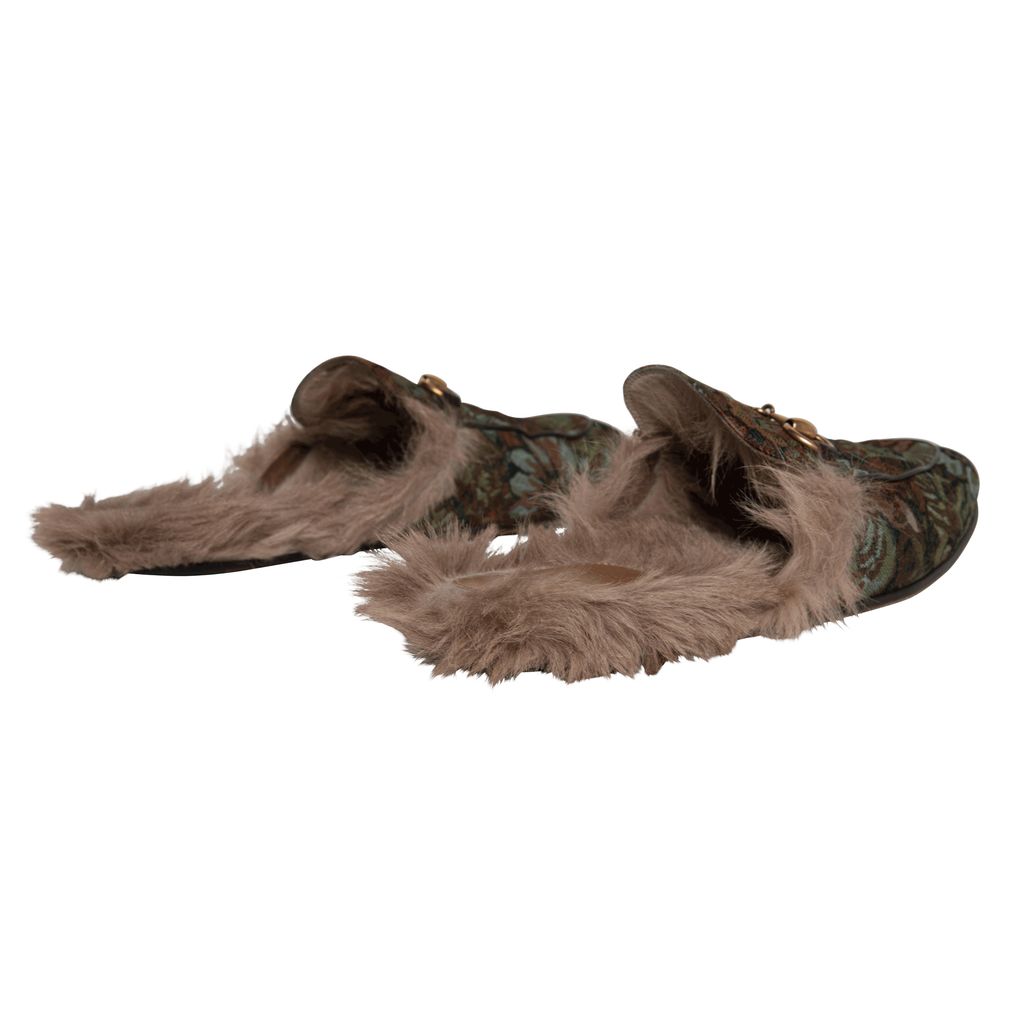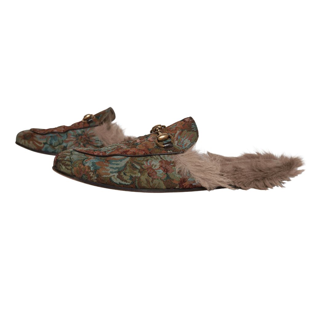 Gucci Princetown Tapestry Fur Loafers feature floral pattern and it's original box and storage bags. Made in Italy.