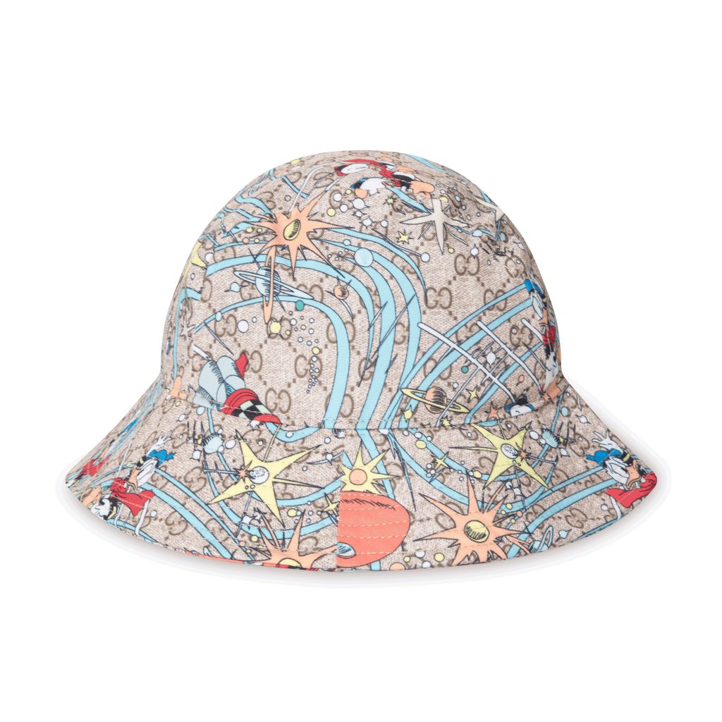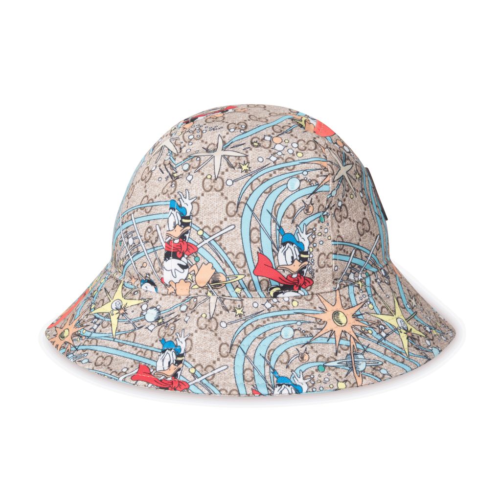 Gucci x Disney Donald Duck Supreme Fedora features custom Donald Duck/Gucci pattern on canvas.