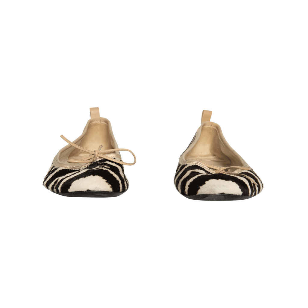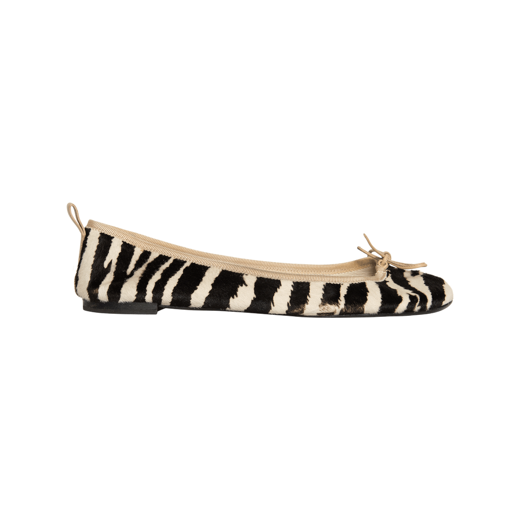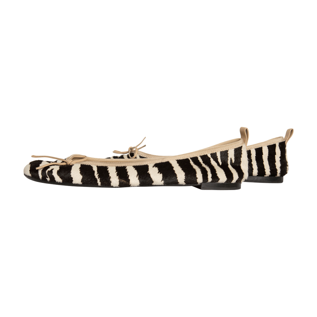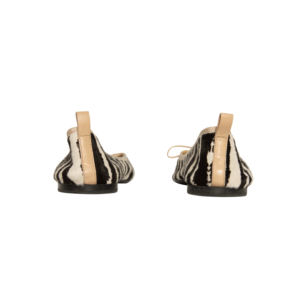 Gucci Zebra Flats features fur hide texture, leather sole, and tiny leather front bow.