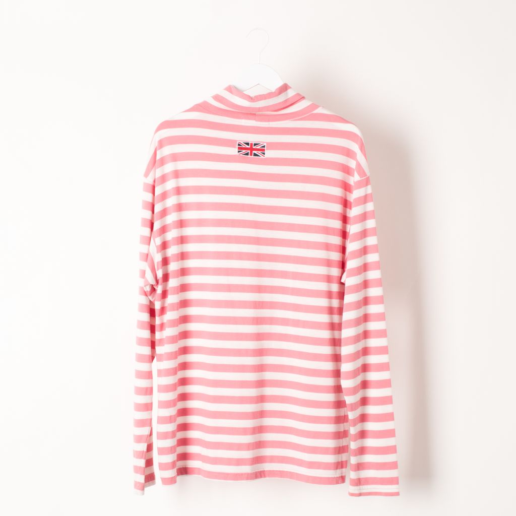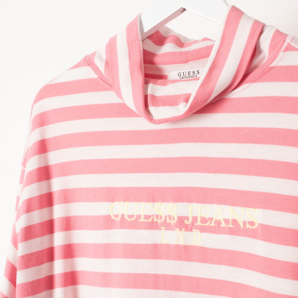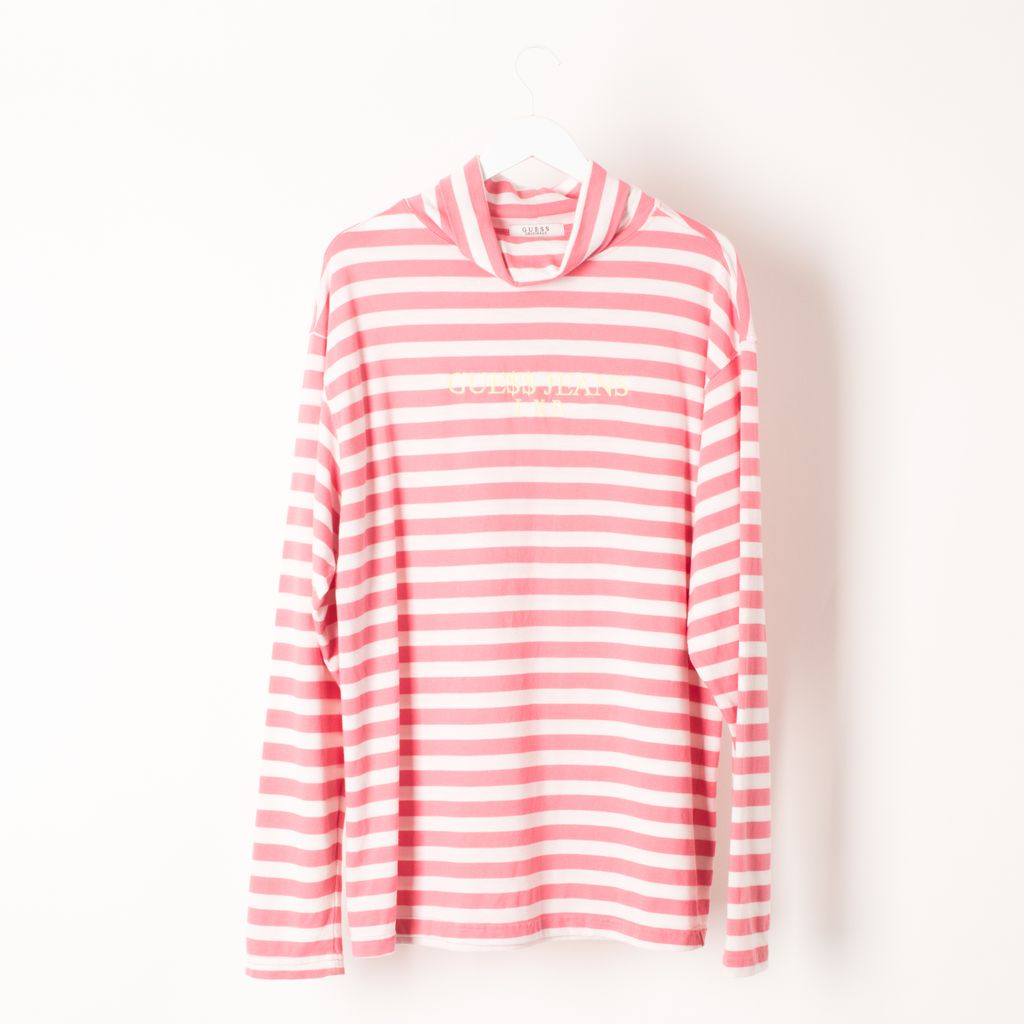Striped turtleneck from extremely limited Guess x A$AP Rocky collaboration, sold out everywhere. Designed to embody the laid-back street style A$AP Rocky is known for. Knit tee, turtleneck, long sleeves, allover stripes, embroidered GUE$$ logo at chest, Union Jack appliqué patch at back.