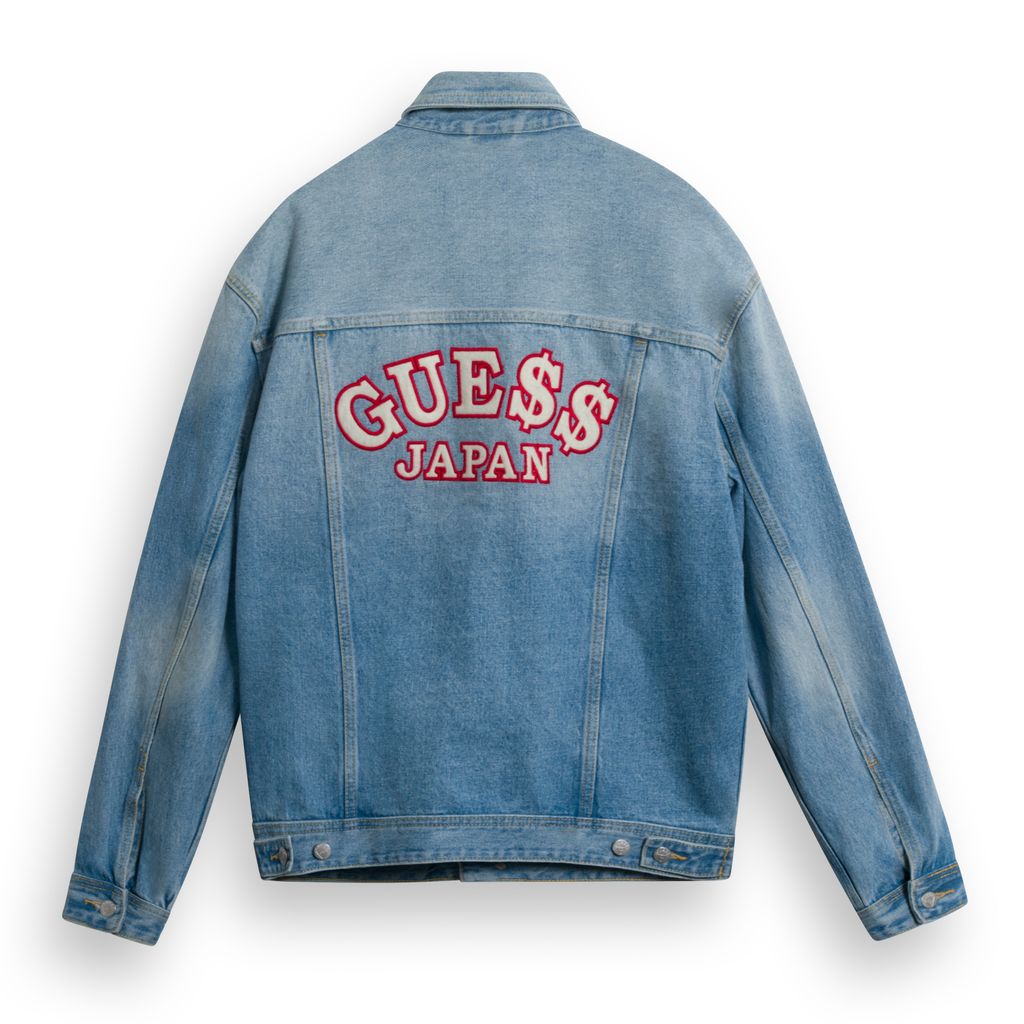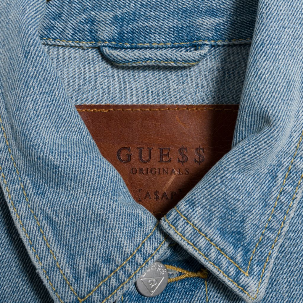 Inspired by the nostalgic style of the 90s, A$AP Rocky joined forces with GUESS to create a capsule collection of updated iconic styles. This oversized denim jacket is a rare find, sold exclusively in Japan. This wardrobe staple is elevated with a large back patch and classic GUESS logo on front hem. Features button front closures, front patch pockets and side slit pockets. In excellent condition.