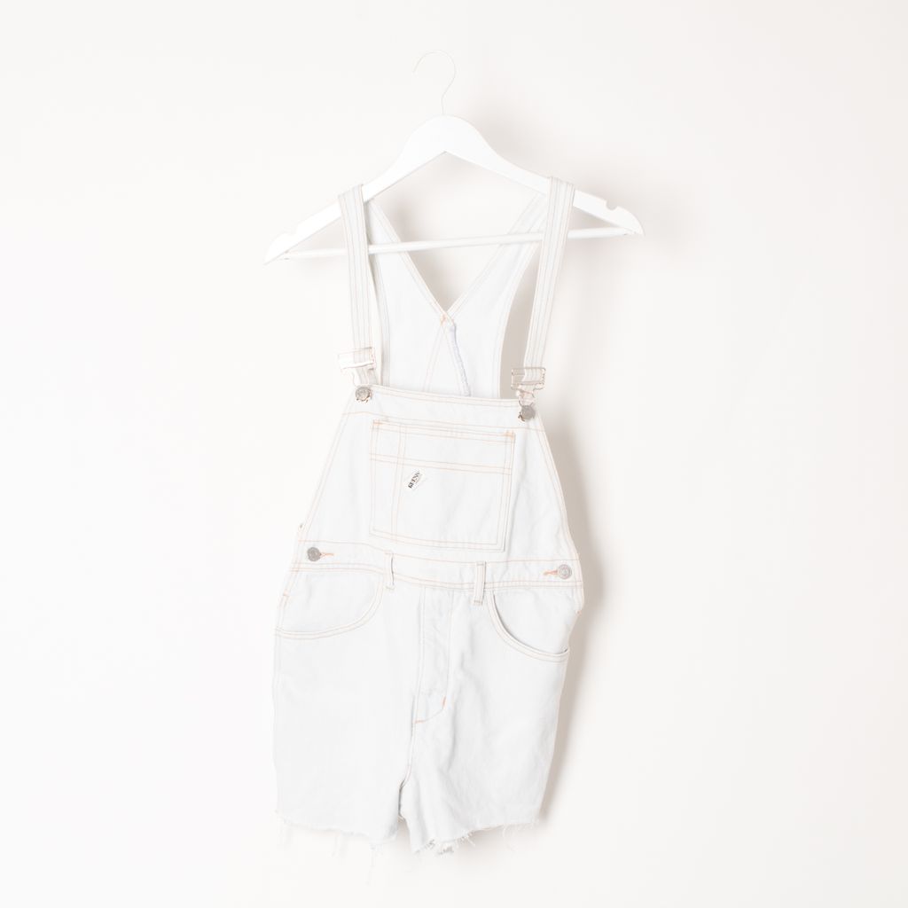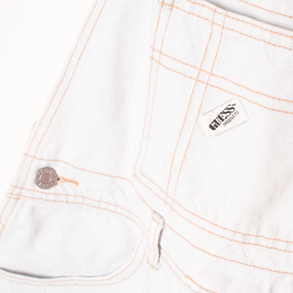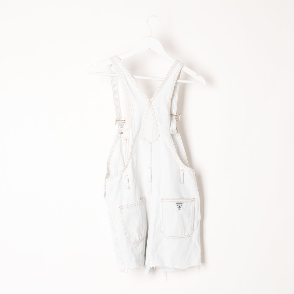 Like new, vintage GUESS cutoff overalls in light denim wash with embroidered logos