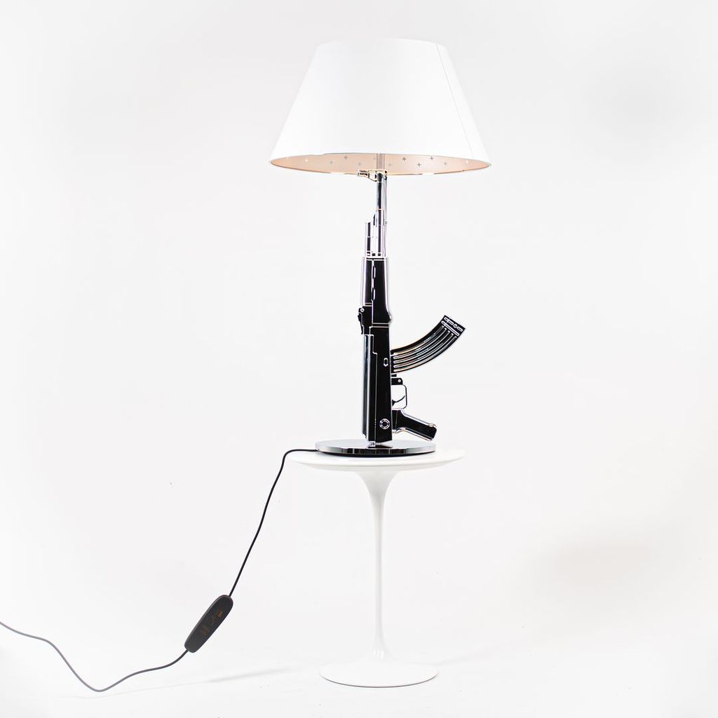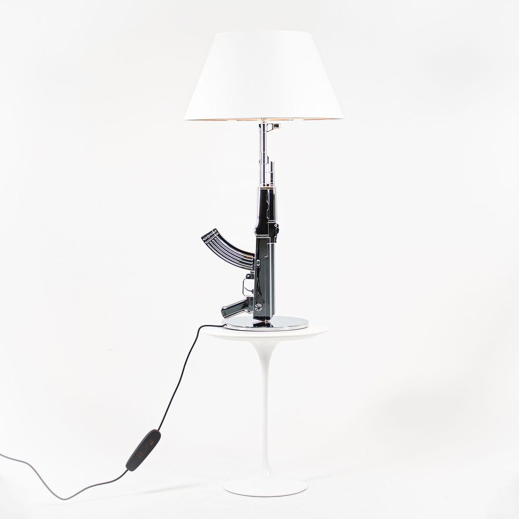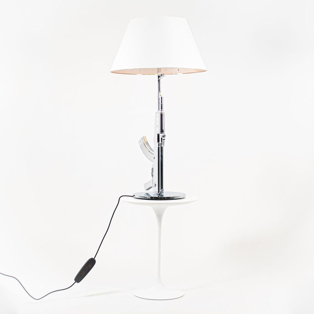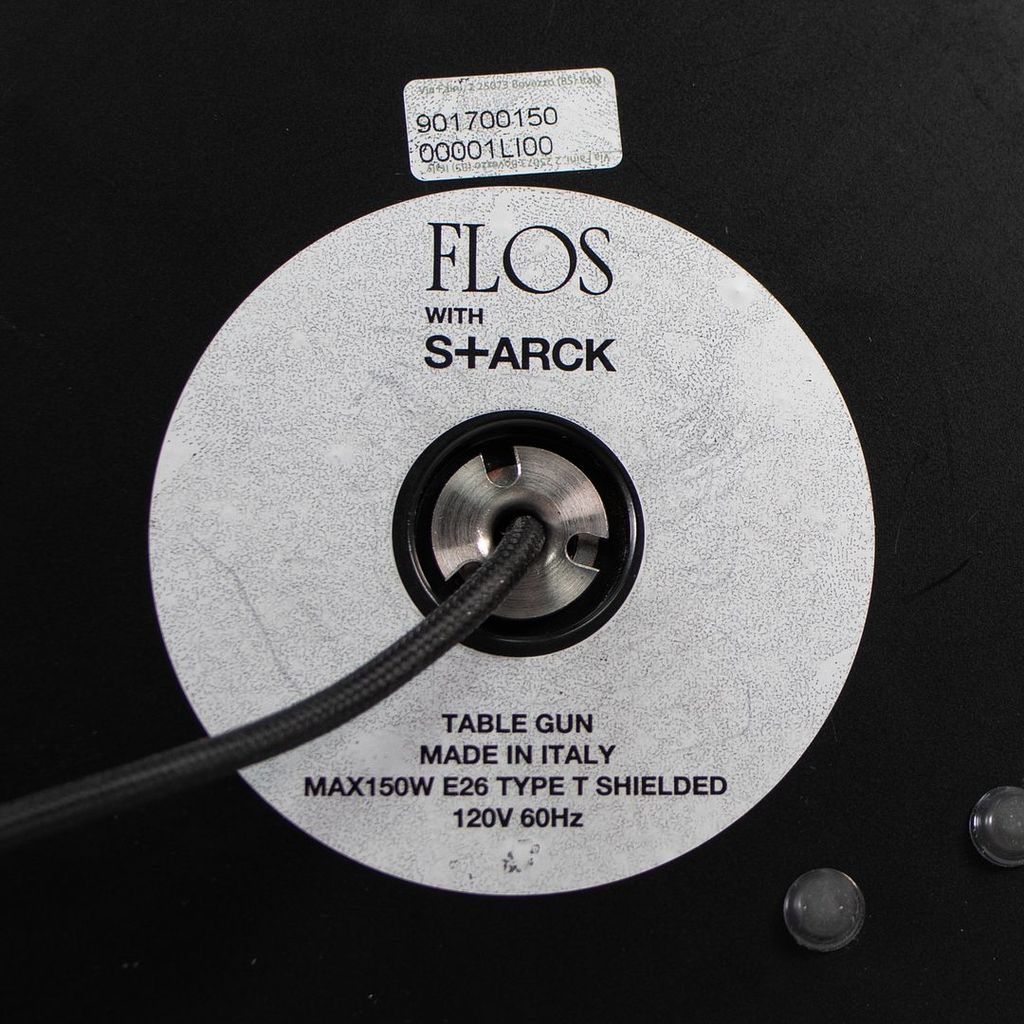Listed for sale is a Gun Table Lamp made with an chromed die-cast aluminum base and a black plasticized paper shade silkscreened on the inside. The lamp was designed by Philippe Starck, produced by Flos in Italy and dates to circa 2021. It is guaranteed as authentic. Condition is excellent and is nearly like new. See photos. Each lamp came to us directly from Flos in its original box and appears to have never been used in a home or office setting.