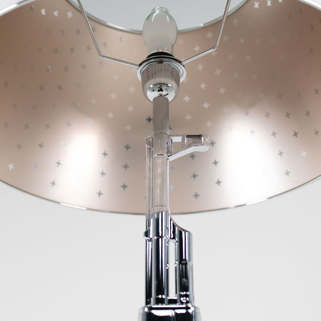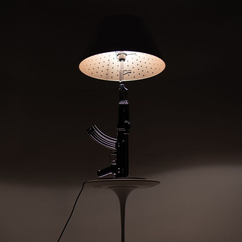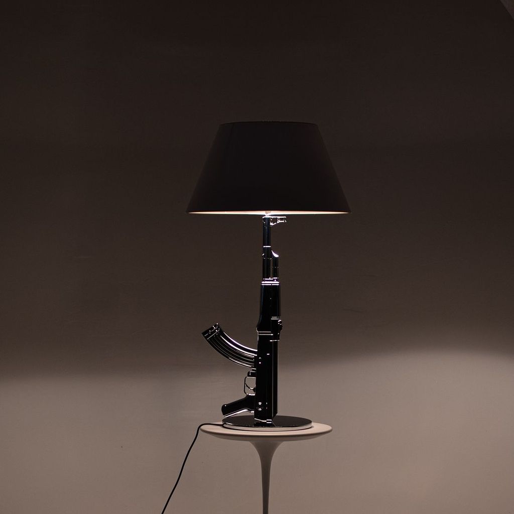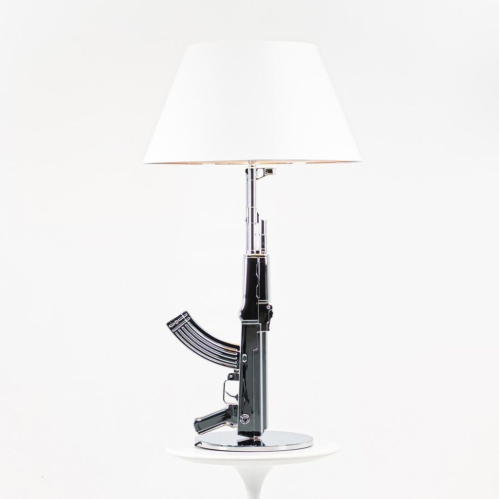 Listed for sale is a Gun Table Lamp made with an chromed die-cast aluminum base and a black plasticized paper shade silkscreened on the inside. The lamp was designed by Philippe Starck, produced by Flos in Italy and dates to circa 2021. It is guaranteed as authentic. Condition is excellent and is nearly like new. See photos. Each lamp came to us directly from Flos in its original box and appears to have never been used in a home or office setting.