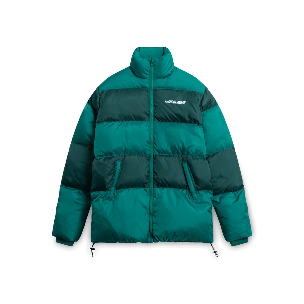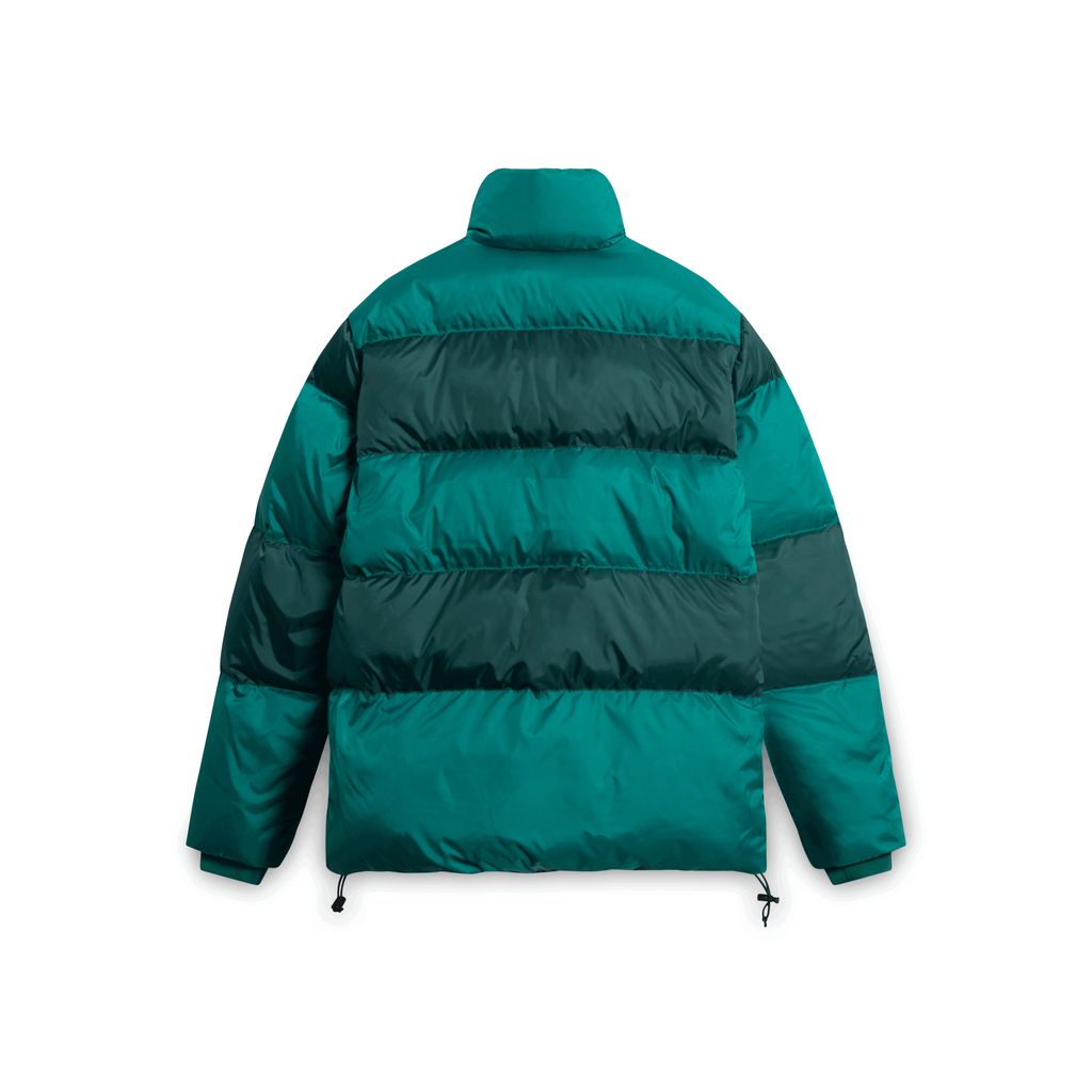 Green Puffer Jacket with a turtle neck and a zipper going down the front. Dark Green stripes line the jacket.