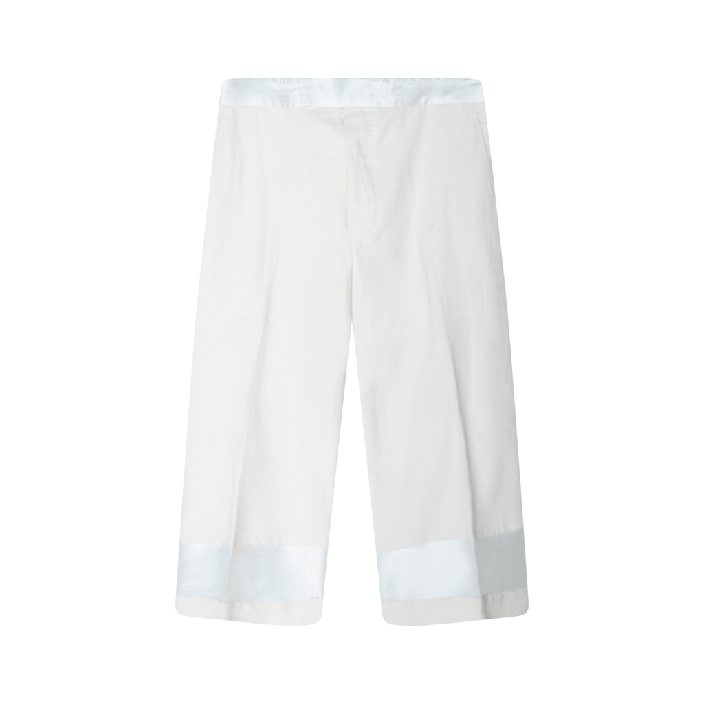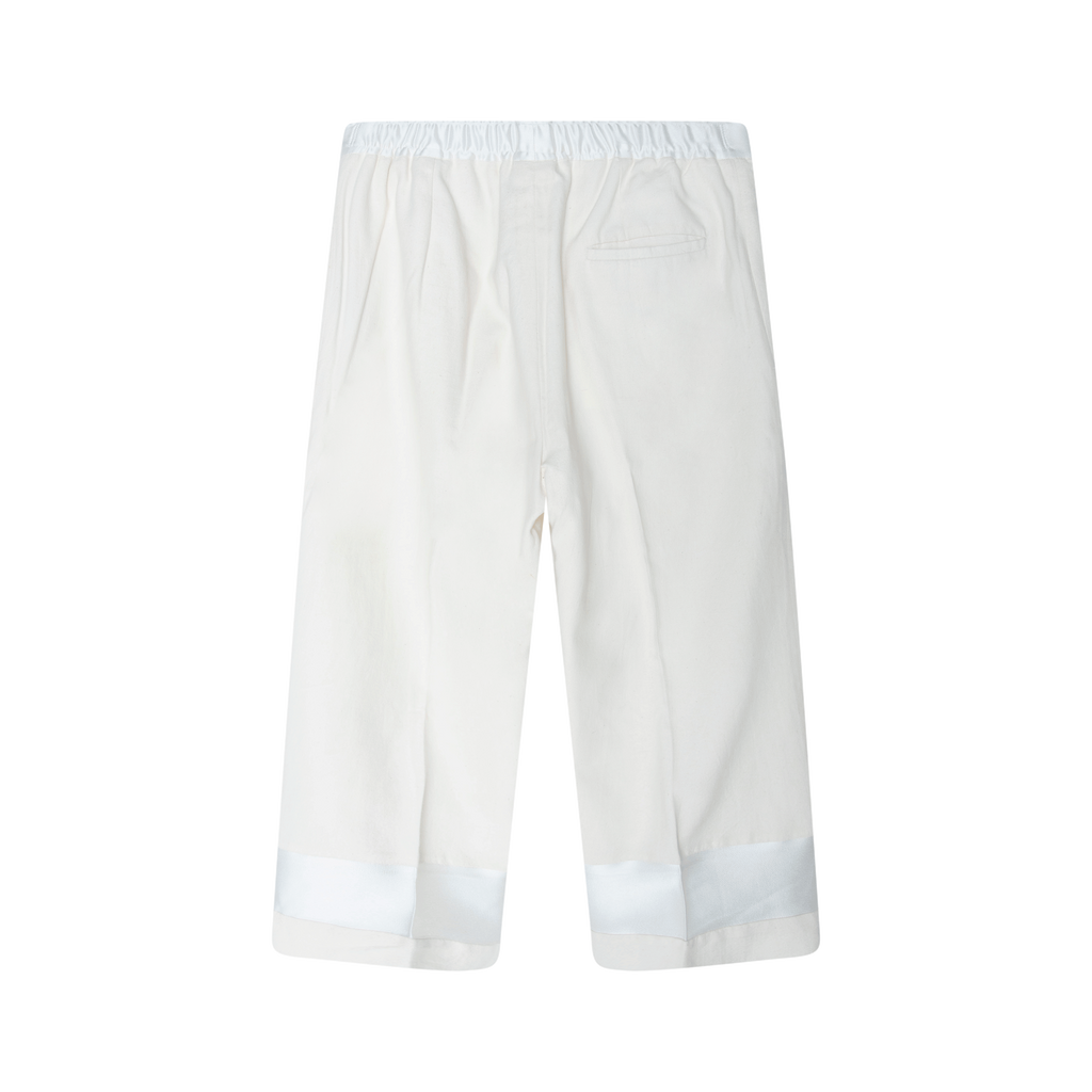 Haider Ackermann Cream Trousers feature elastic waist band, front button closure, two front pockets, and an acetate-detail at the bottom cuffs.