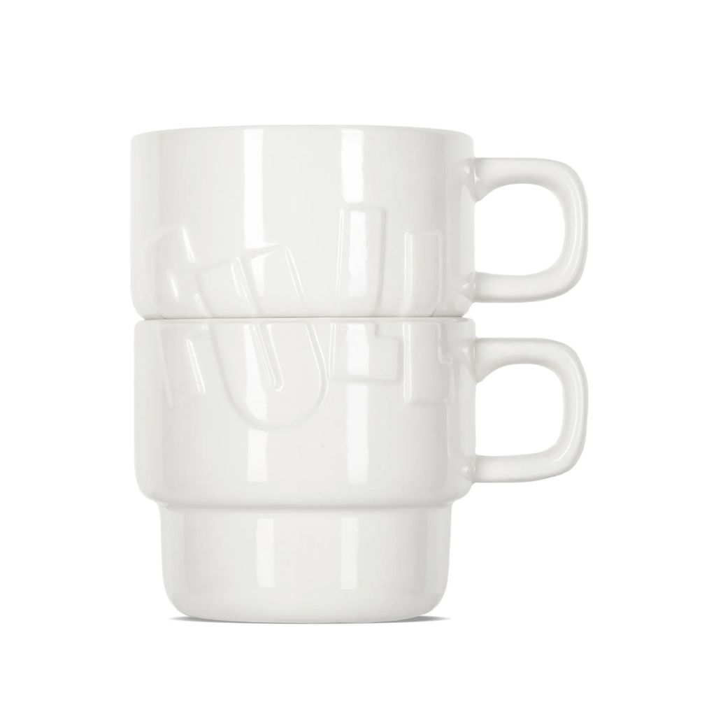 Set of two handcrafted glazed stoneware mugs in white. Text embossed on both cups that reads 'FULL' when stacked. Handle at side. Logo printed at base.