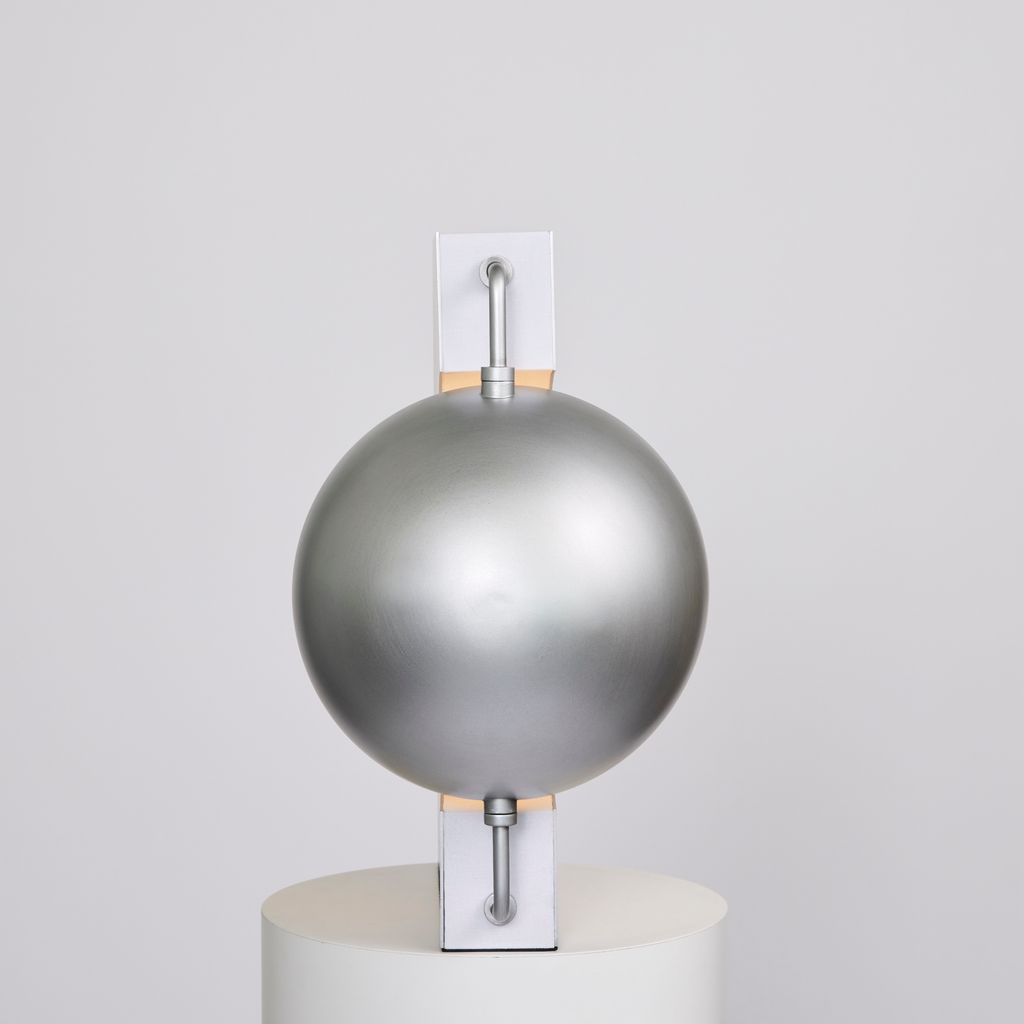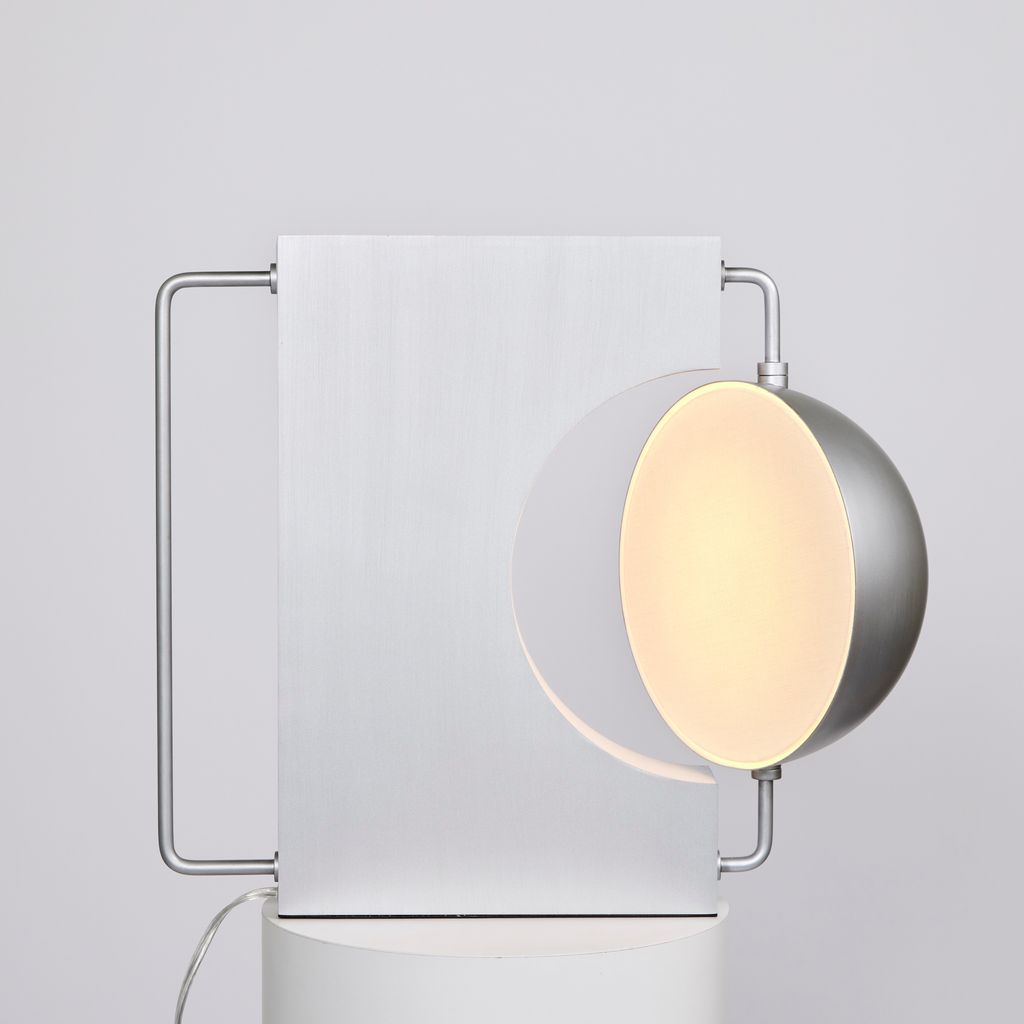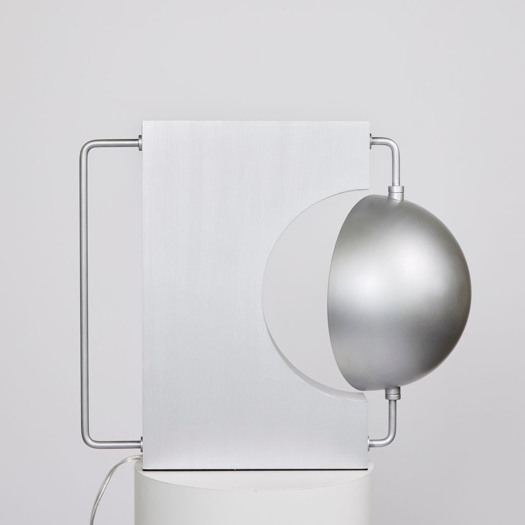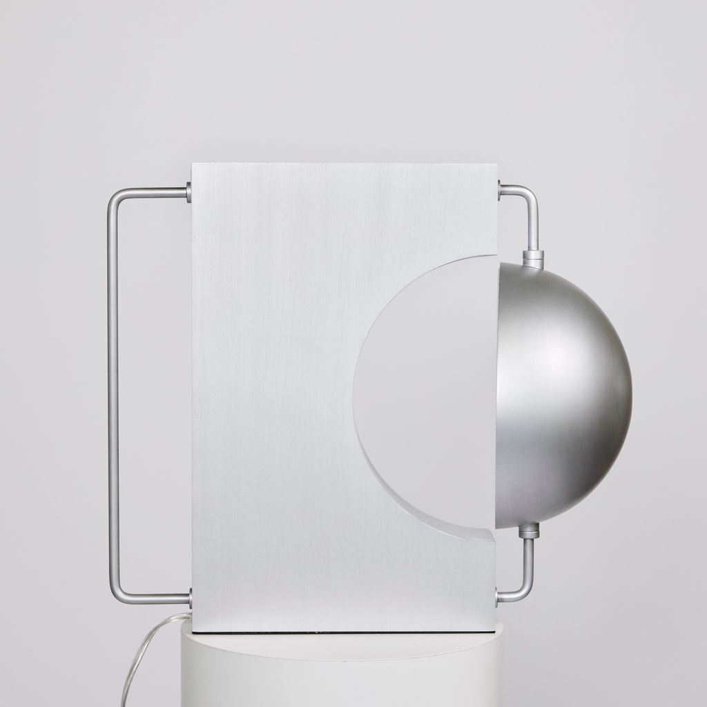 A table lamp that plays with contrasting elements of roundness and sharpness, darkness and light. Designed with a half-hollowed sphere bisecting a rectangular base and a thin square frame, the monochrome fixtures are illuminated by a light that turns 40 degrees on each side.