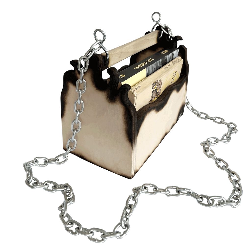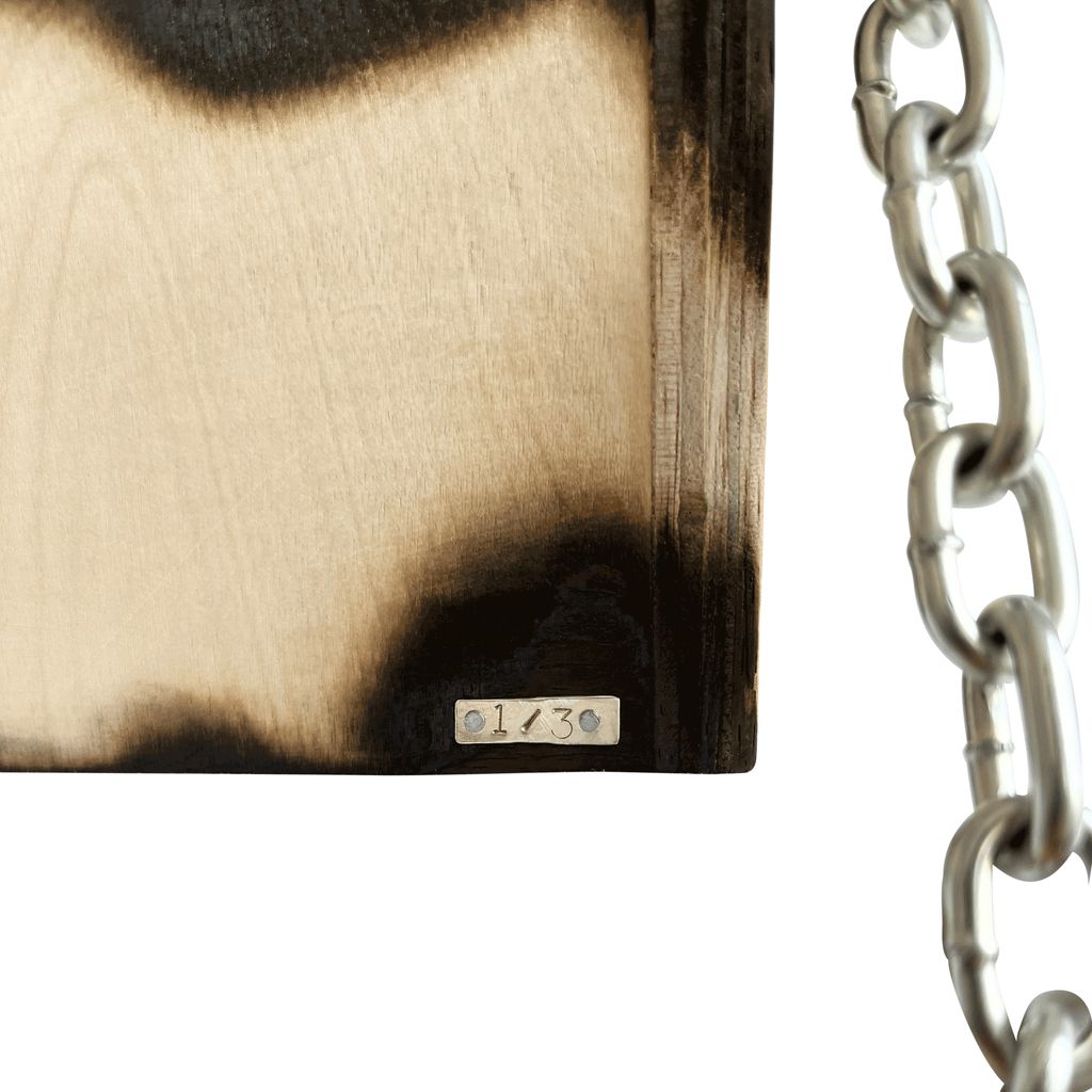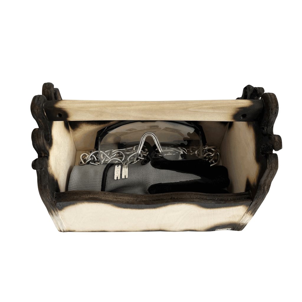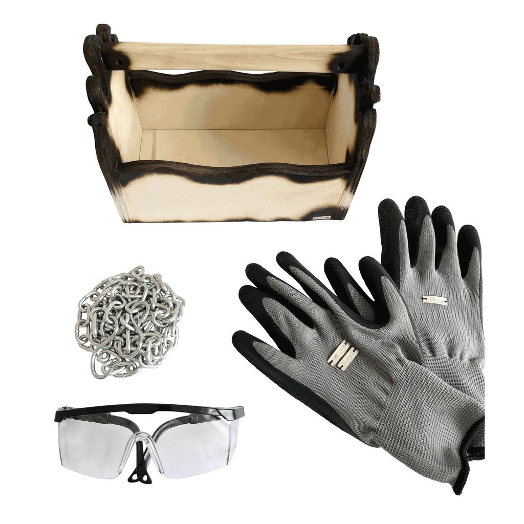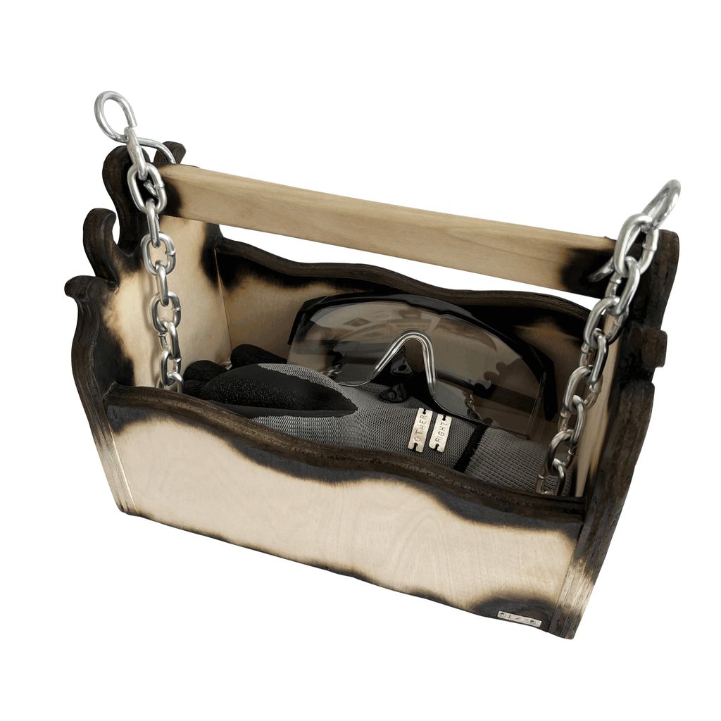 Handmade wooden tool box with a numbered sterling silver badge features carrying chain for carrying and hanging. Each toolbox comes with work gloves with sterling silver labels on each hand denoting "right" and "other right", safety goggles, and a two surprise contents.