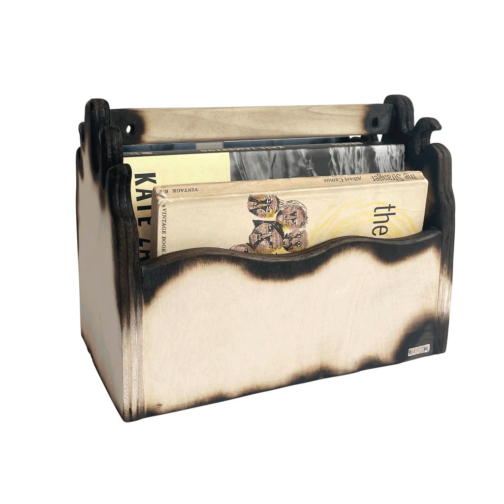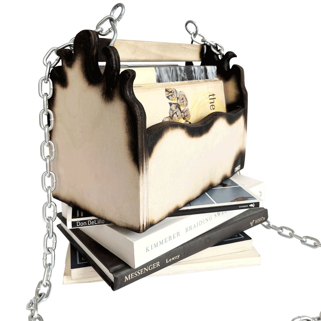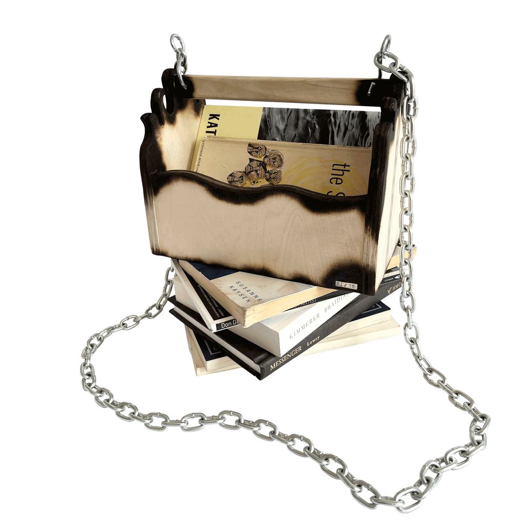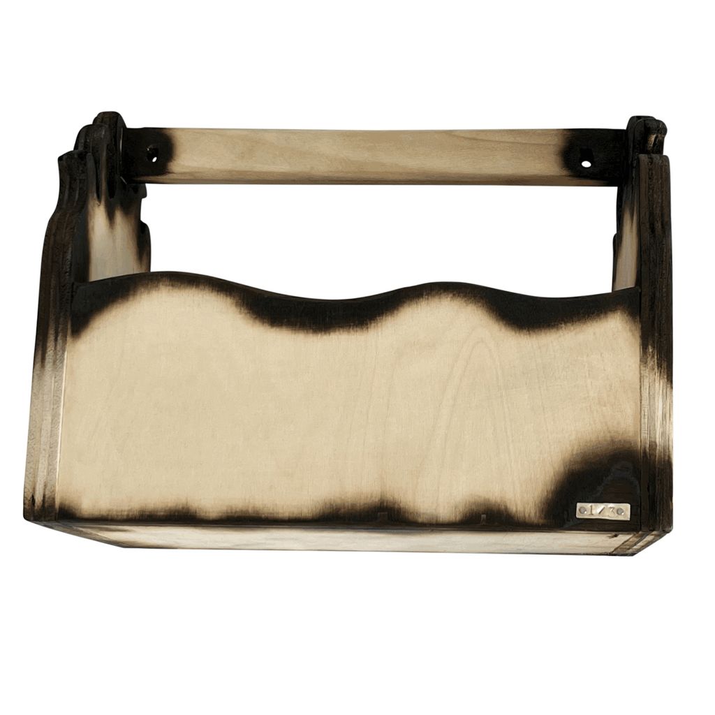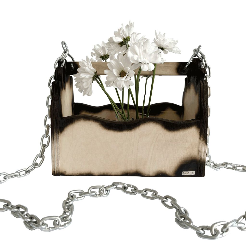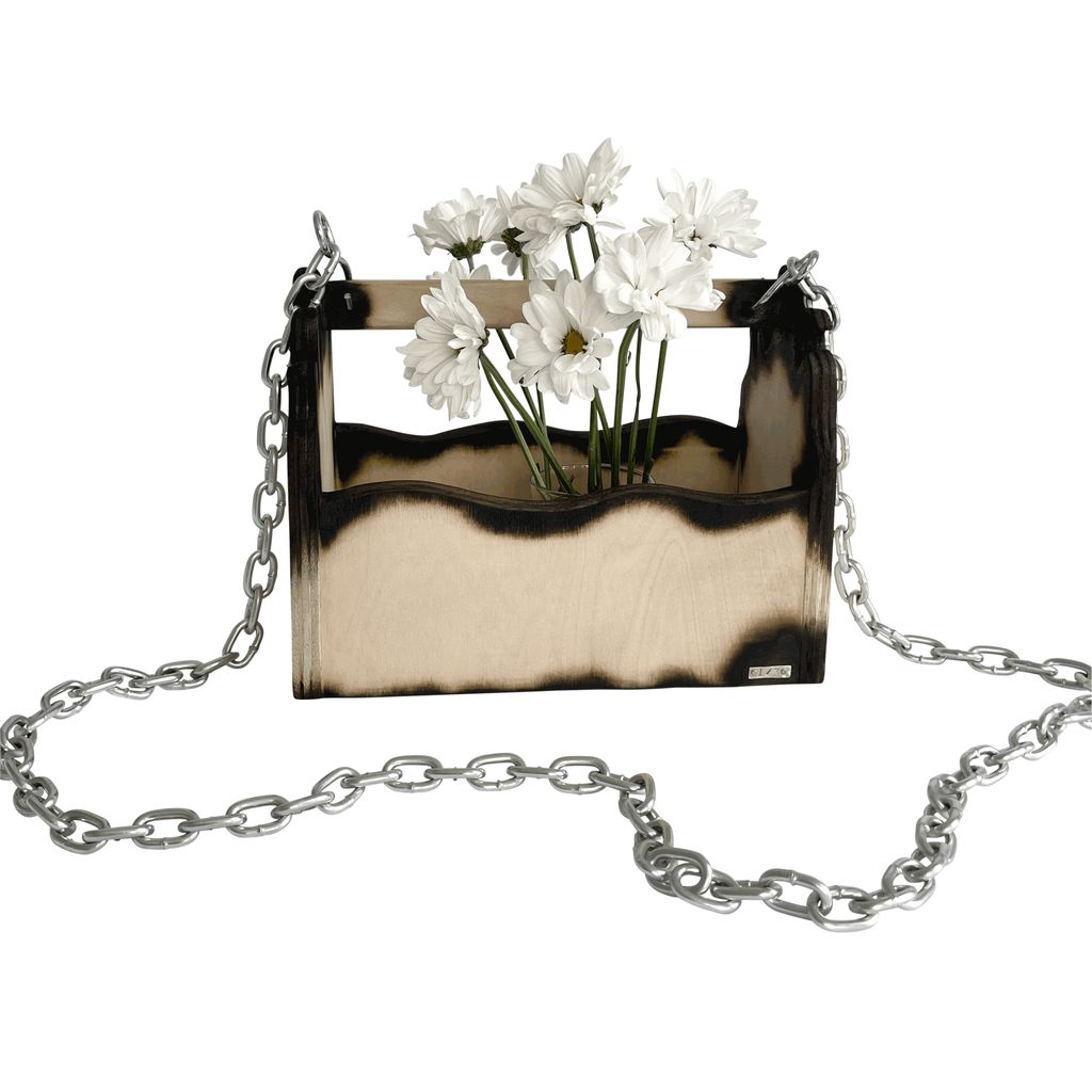 Handmade wooden tool box with a numbered sterling silver badge features carrying chain for carrying and hanging. Each toolbox comes with work gloves with sterling silver labels on each hand denoting "right" and "other right", safety goggles, and a two surprise contents.