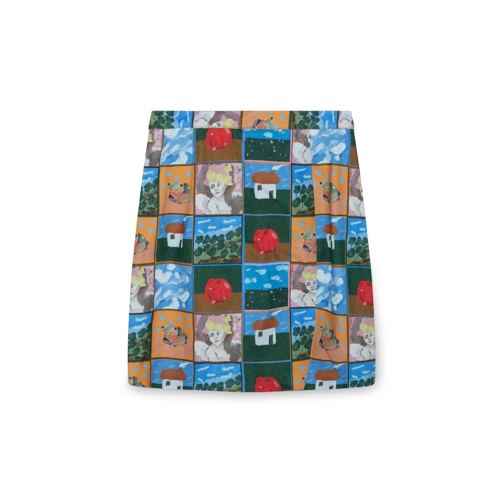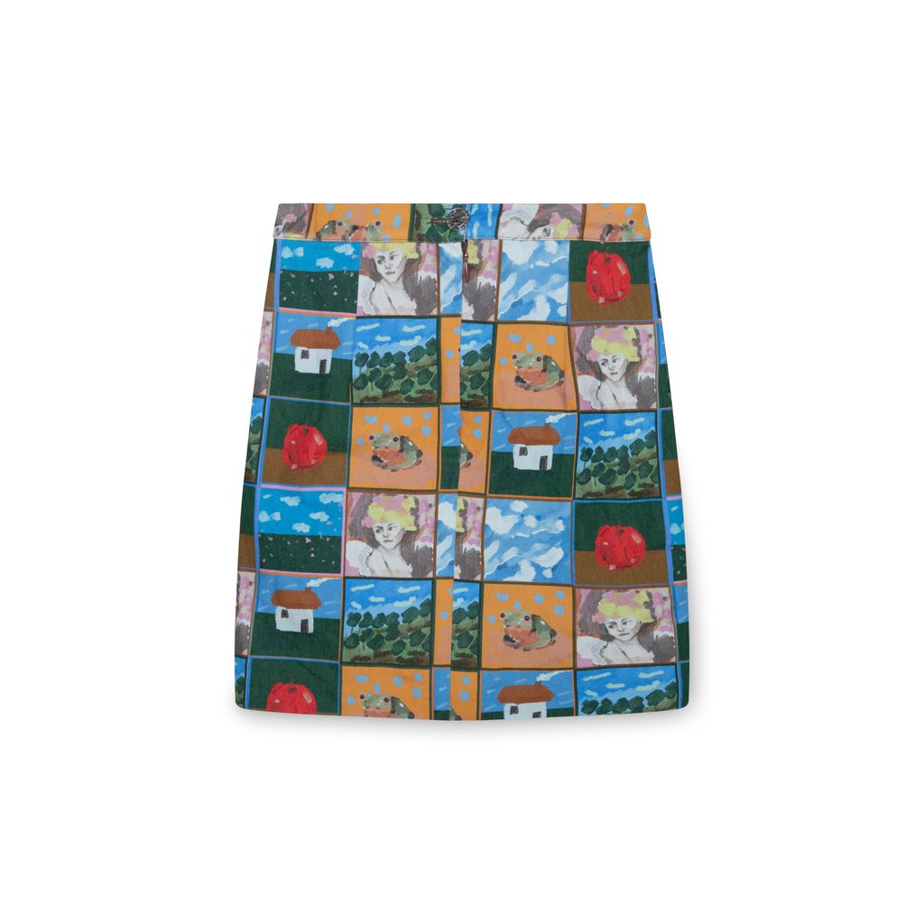Hanthis Elma Etek Mini Skirt features side slit and hand drawn visuals in each frame that tell a summer story.