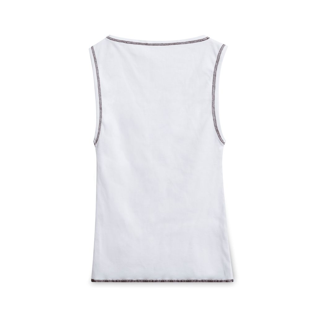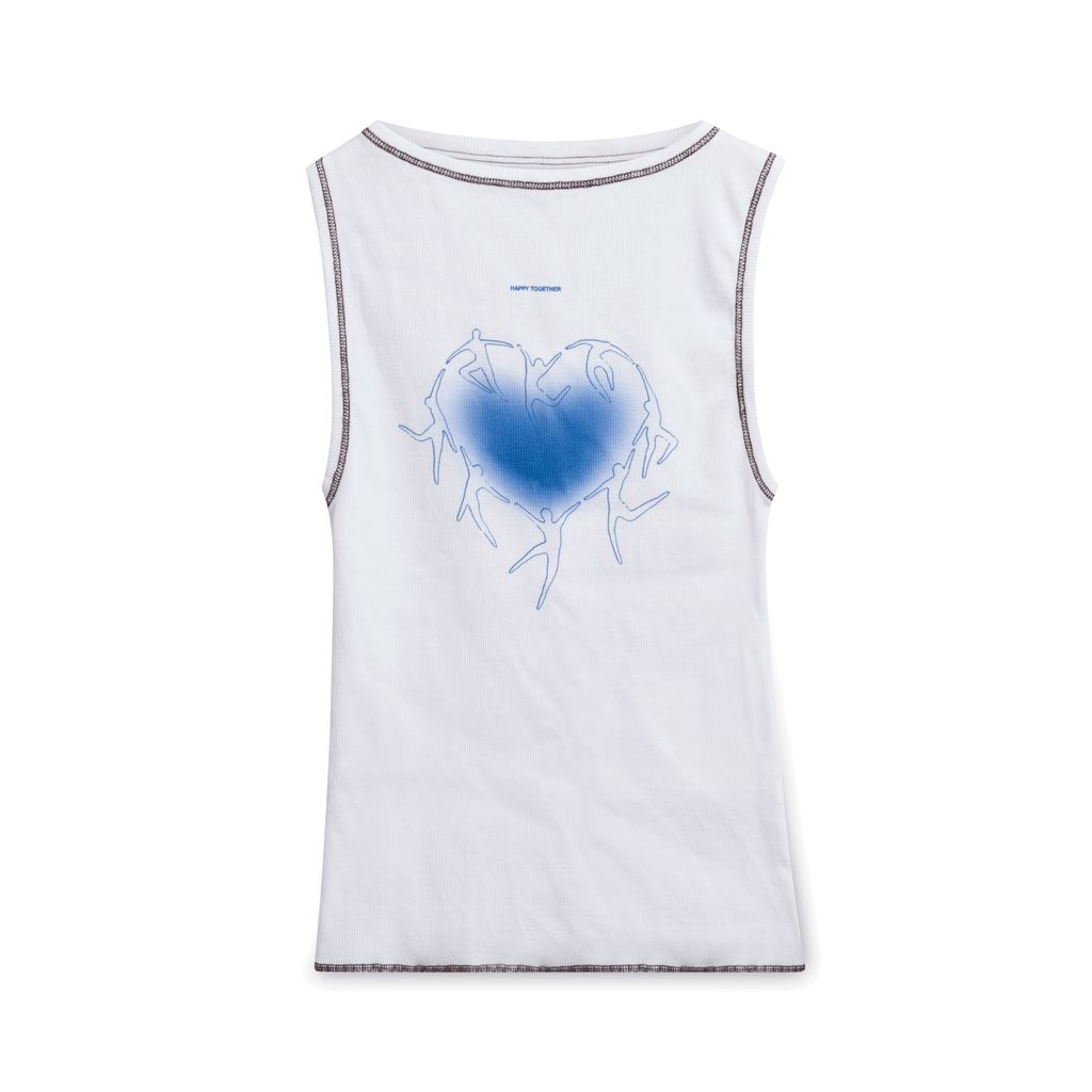 This cute white ribbed tank top features a blue graphic heart with people and "Happy Together" text on the chest. Decorative brown surging lines the neckline, arms, and base of the top.